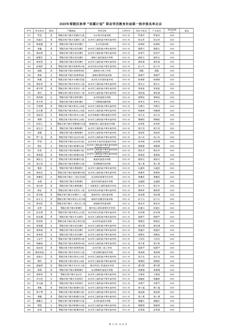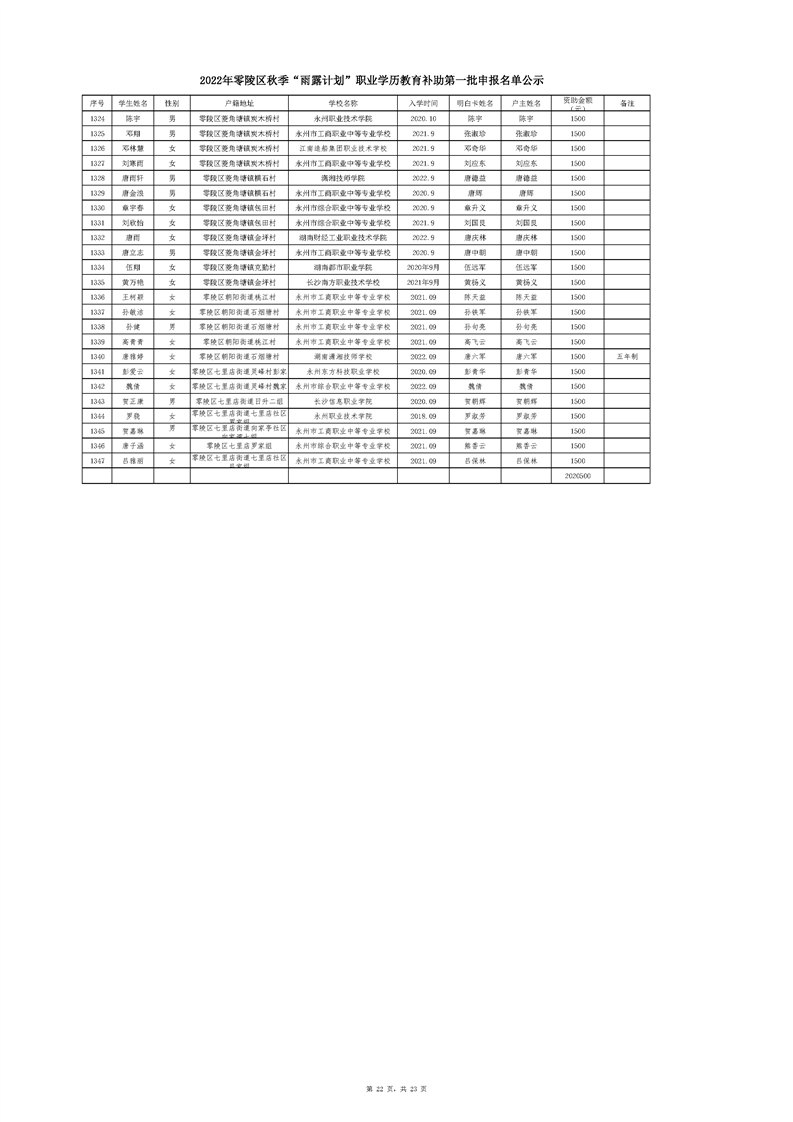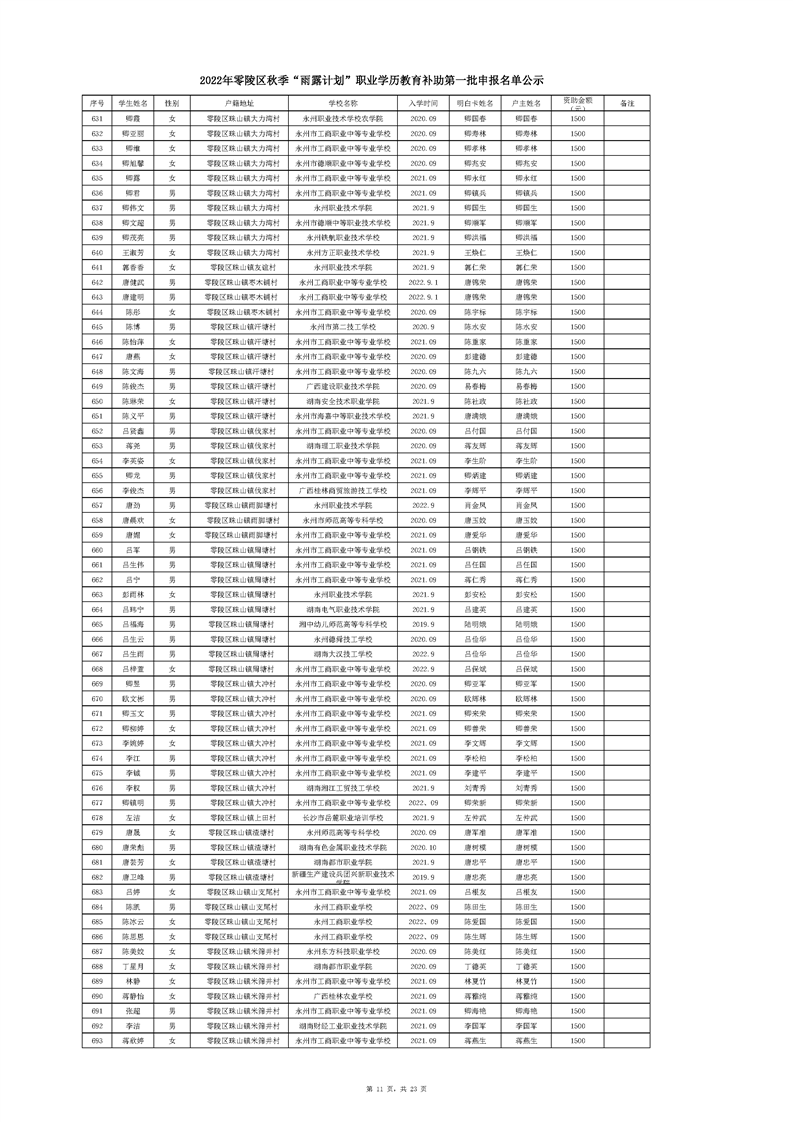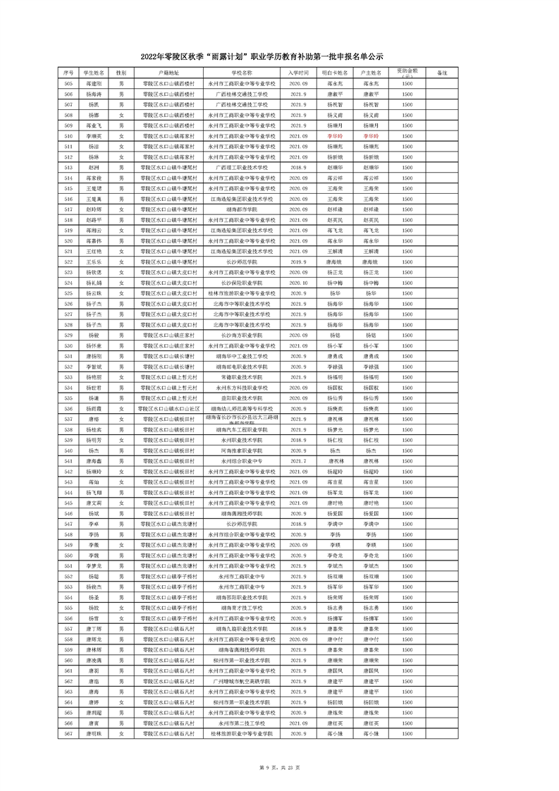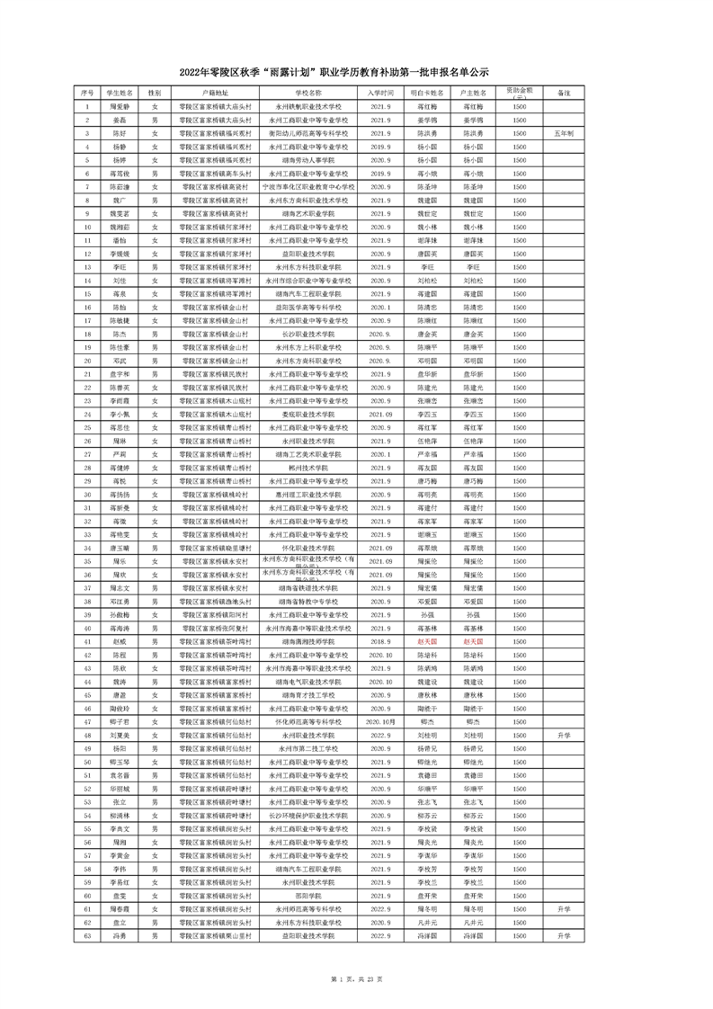 2022年零陵区秋季“雨露计划”职业学历教育补助第一批申报名单公示