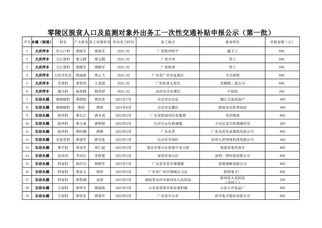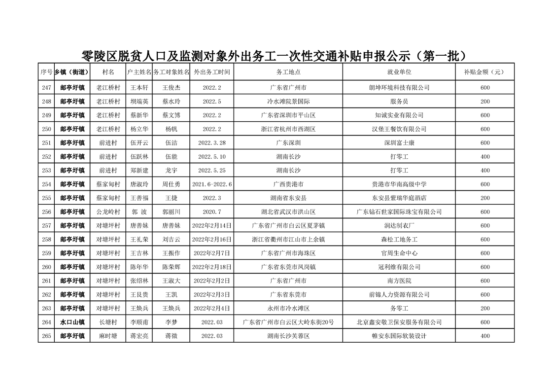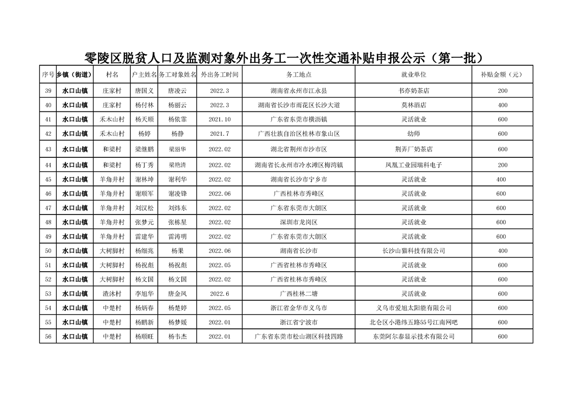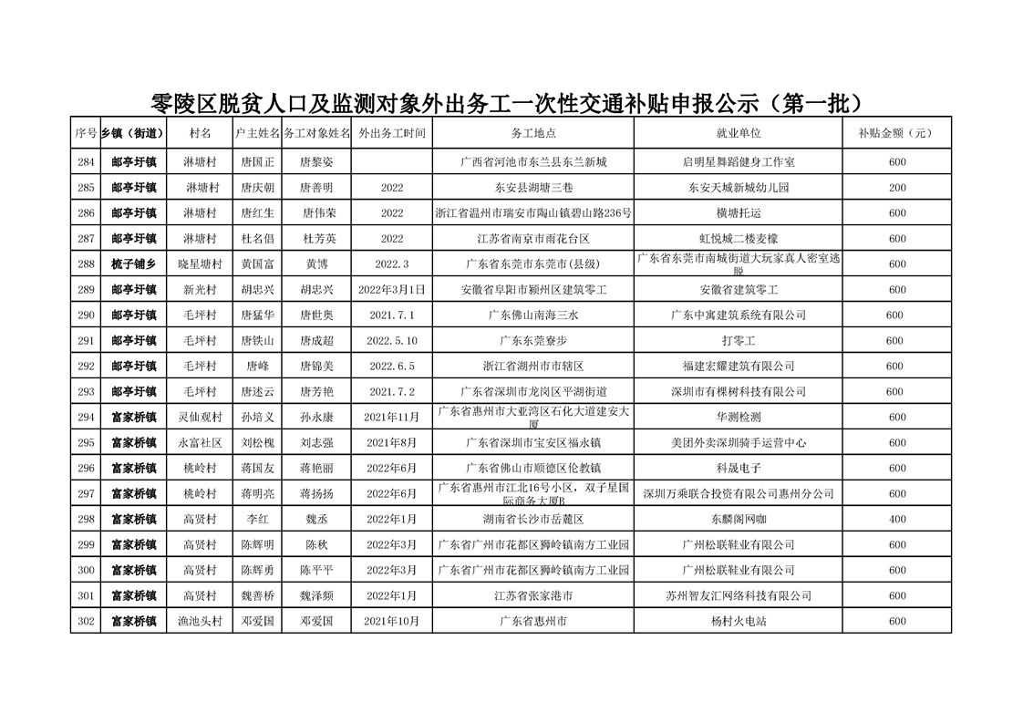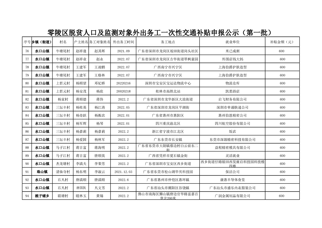 零陵区脱贫人口及监测对象外出务工一次性交通补贴申报公示(第一批)