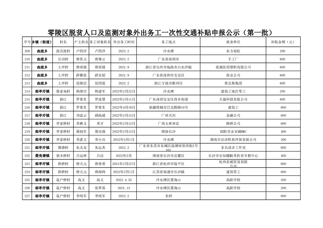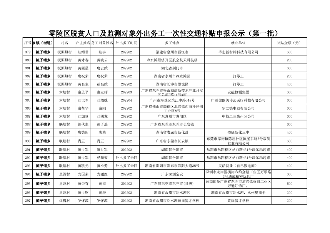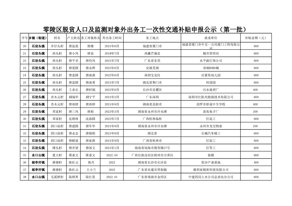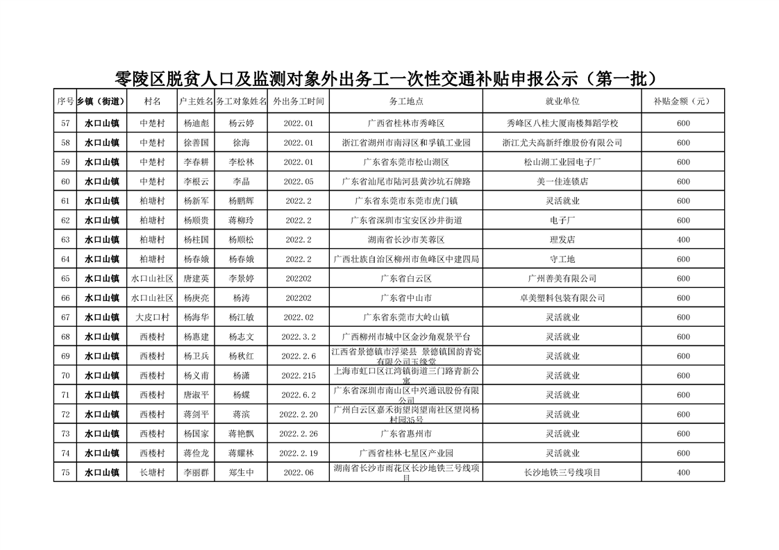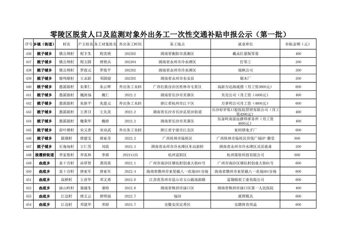 零陵区脱贫人口及监测对象外出务工一次性交通补贴申报公示(第一批)