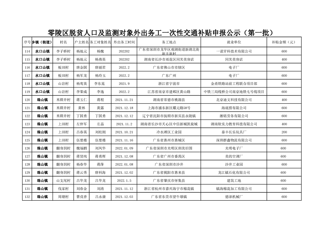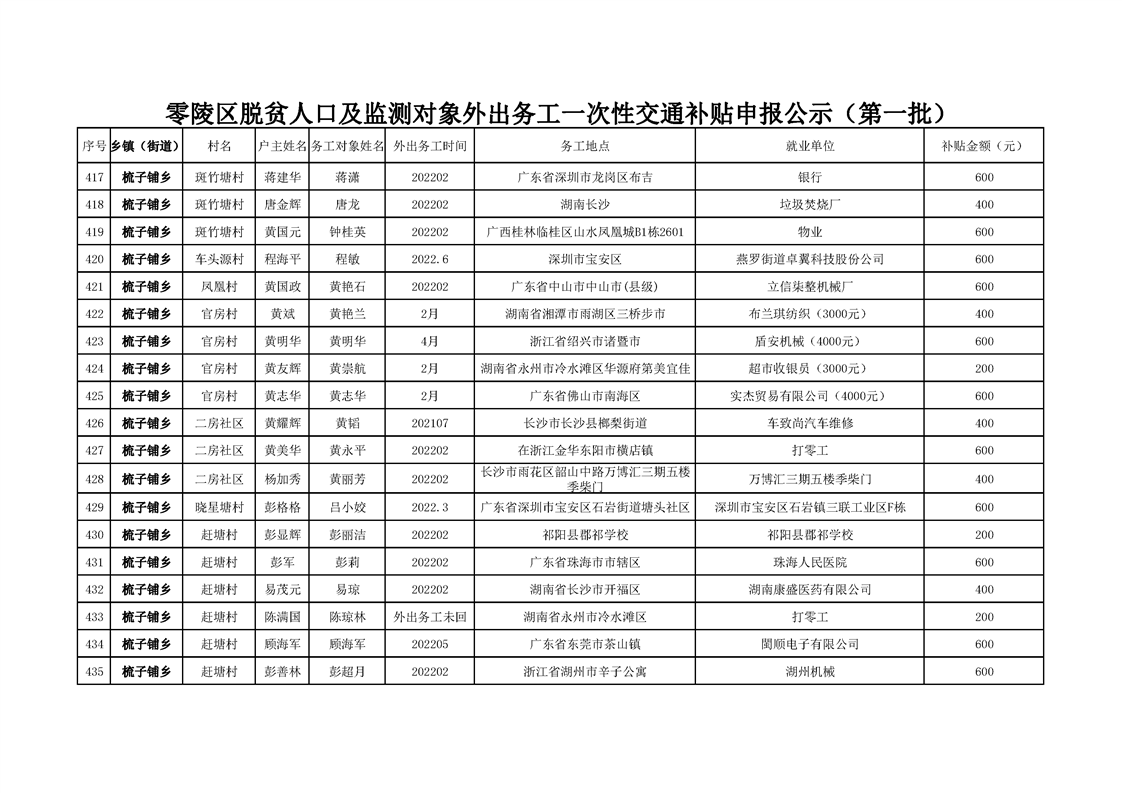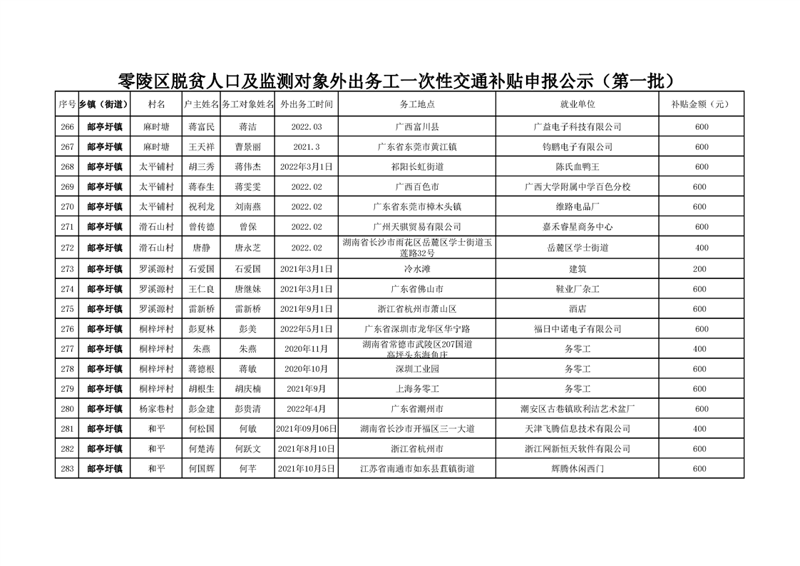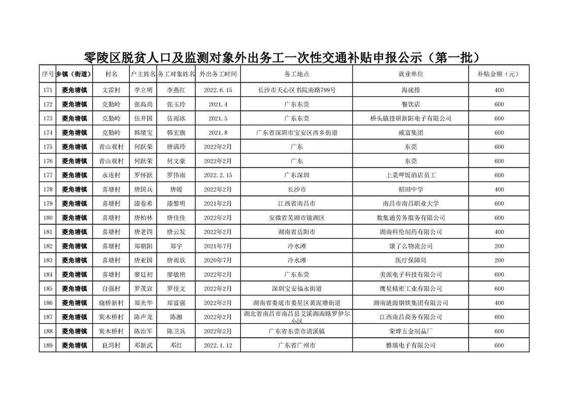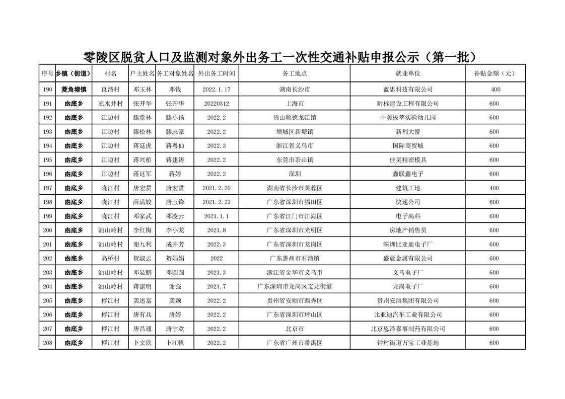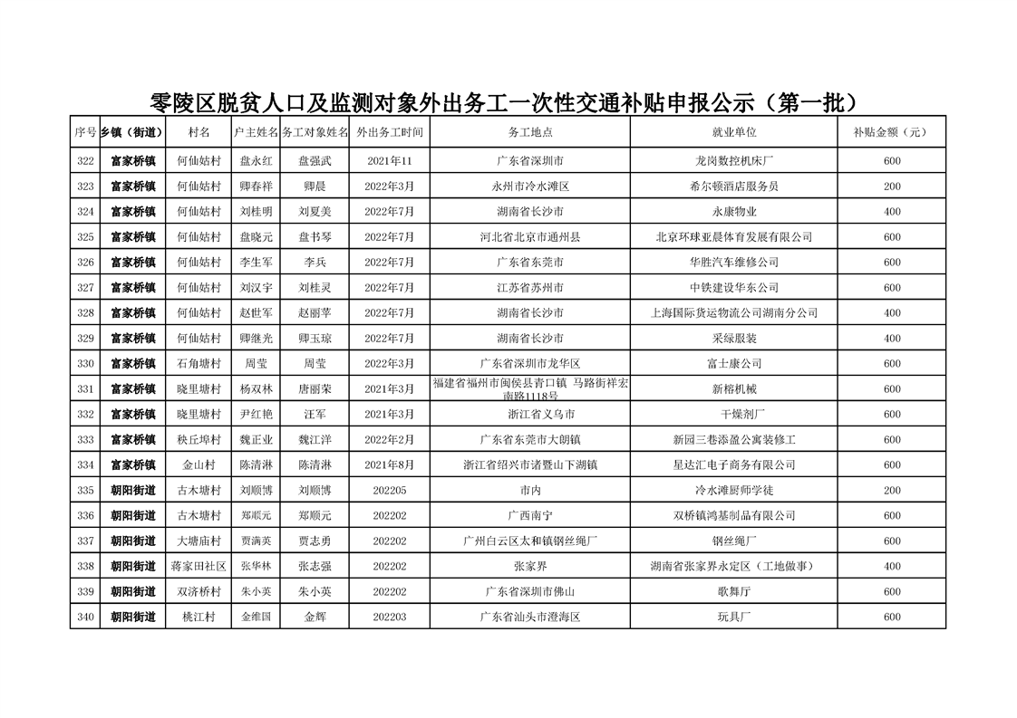 零陵区脱贫人口及监测对象外出务工一次性交通补贴申报公示(第一批)