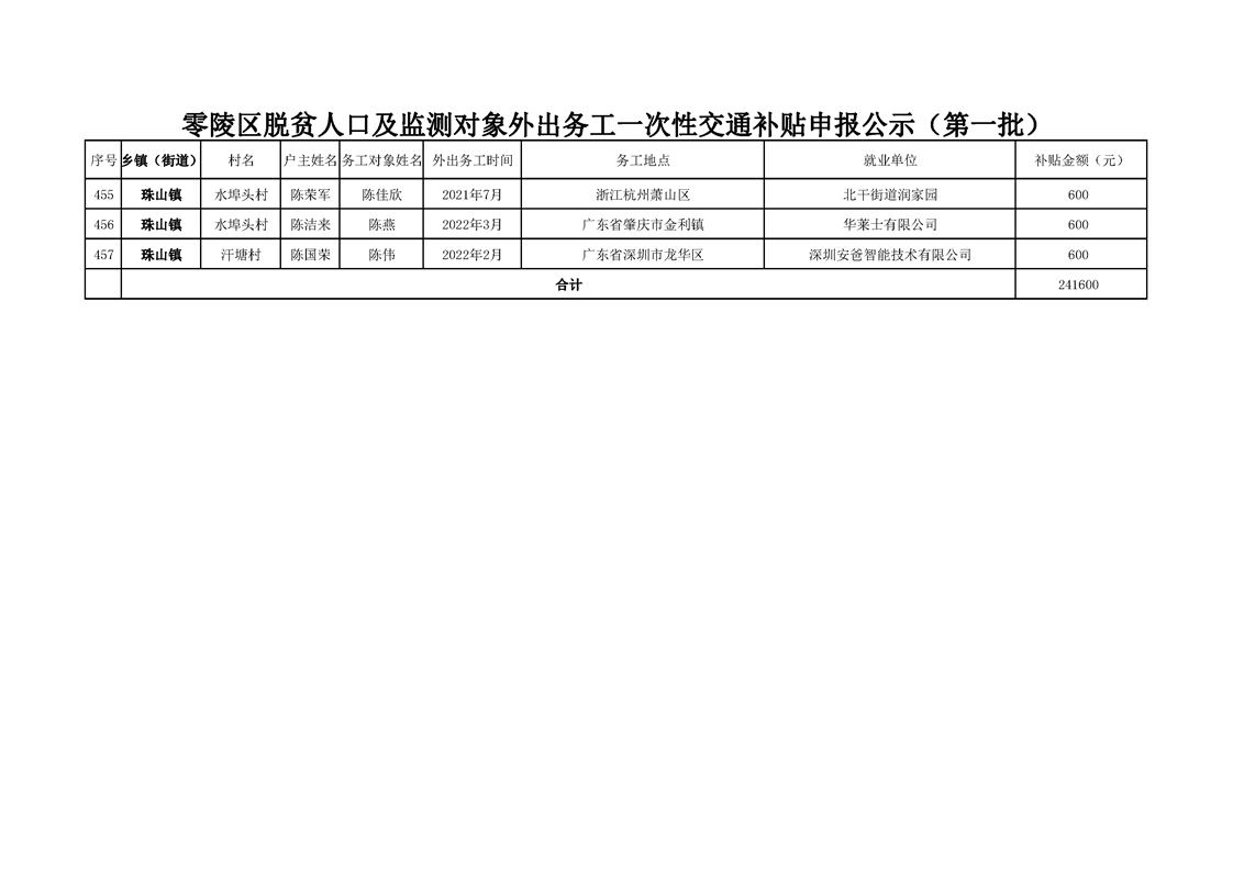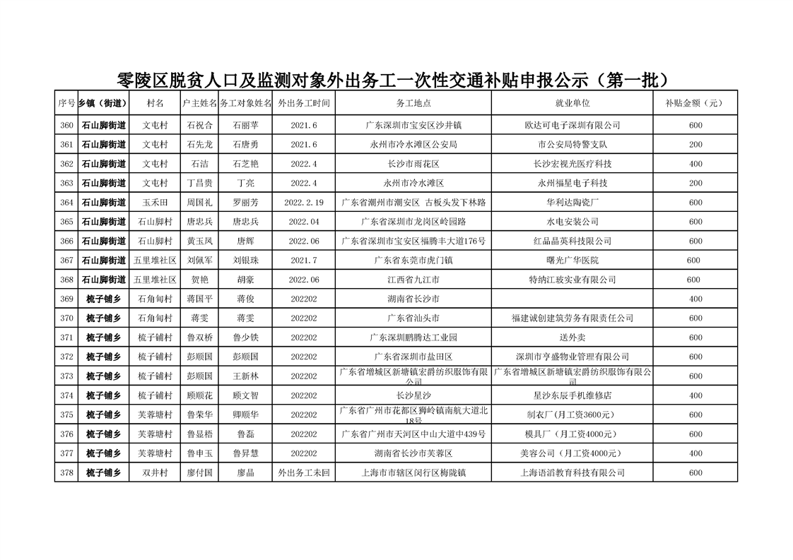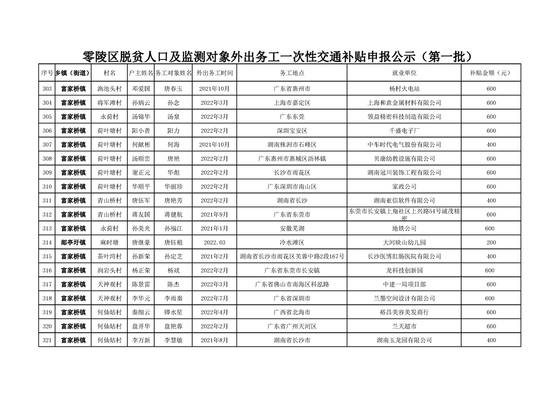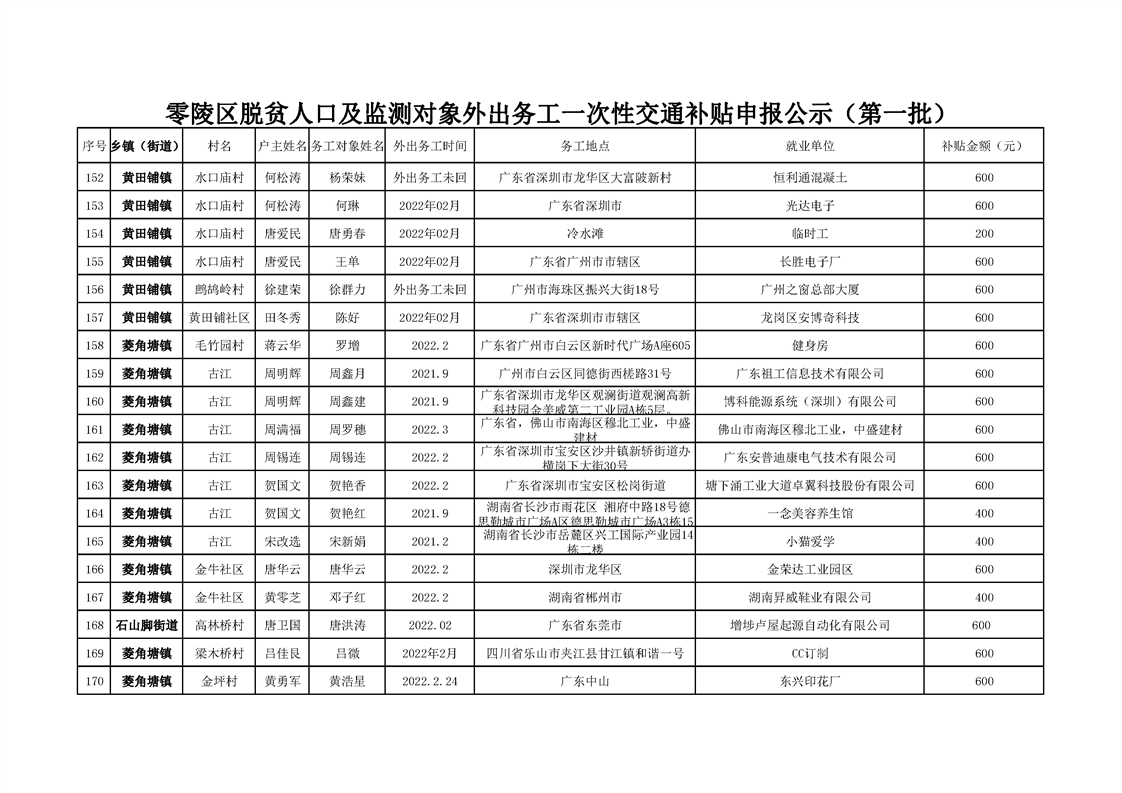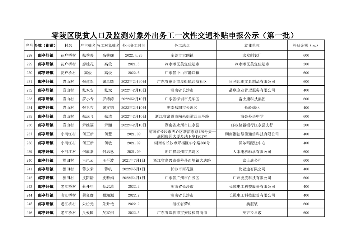 零陵区脱贫人口及监测对象外出务工一次性交通补贴申报公示(第一批)