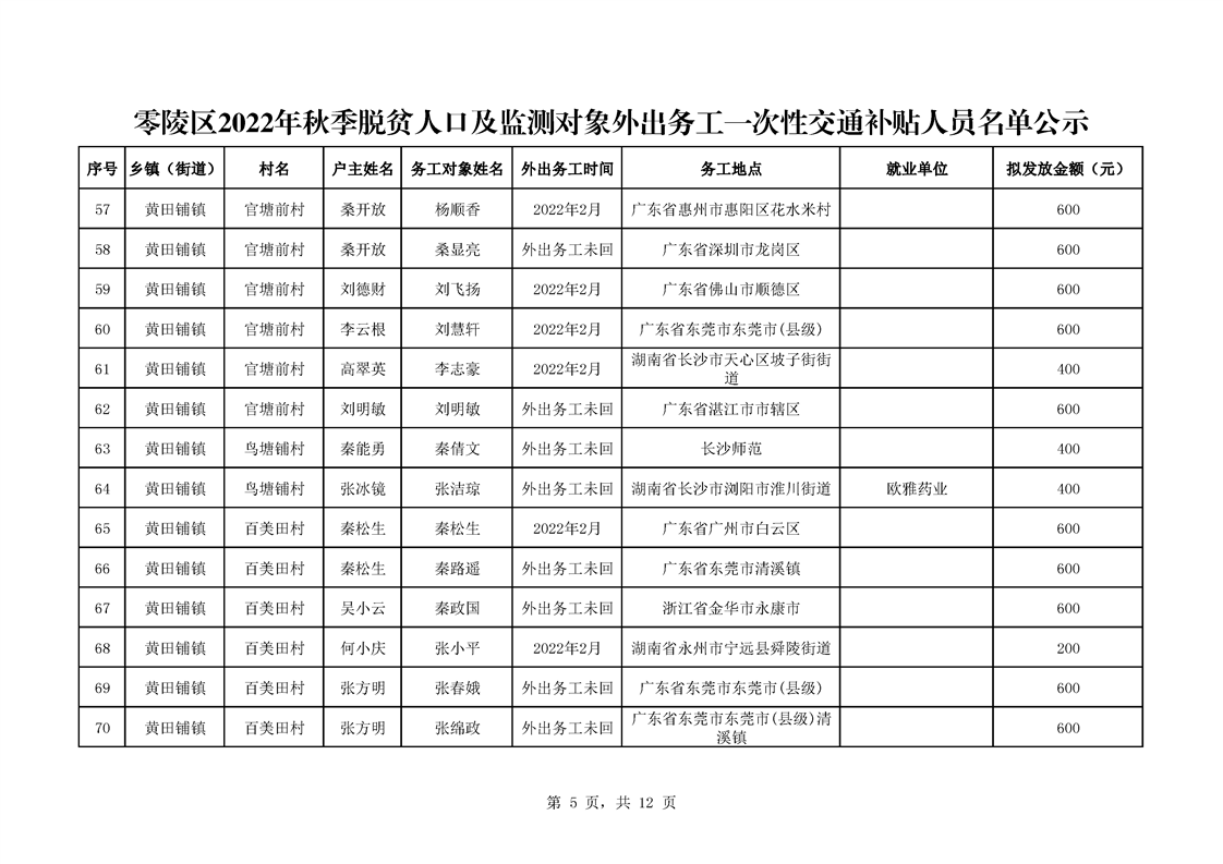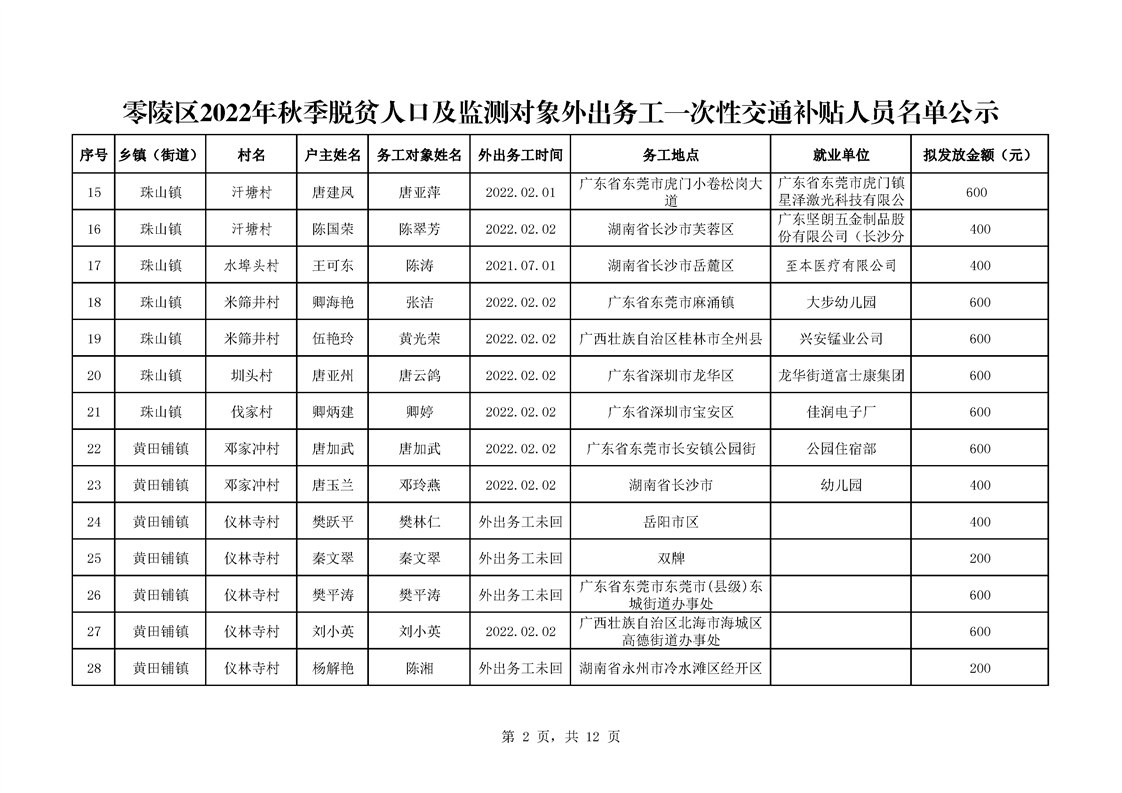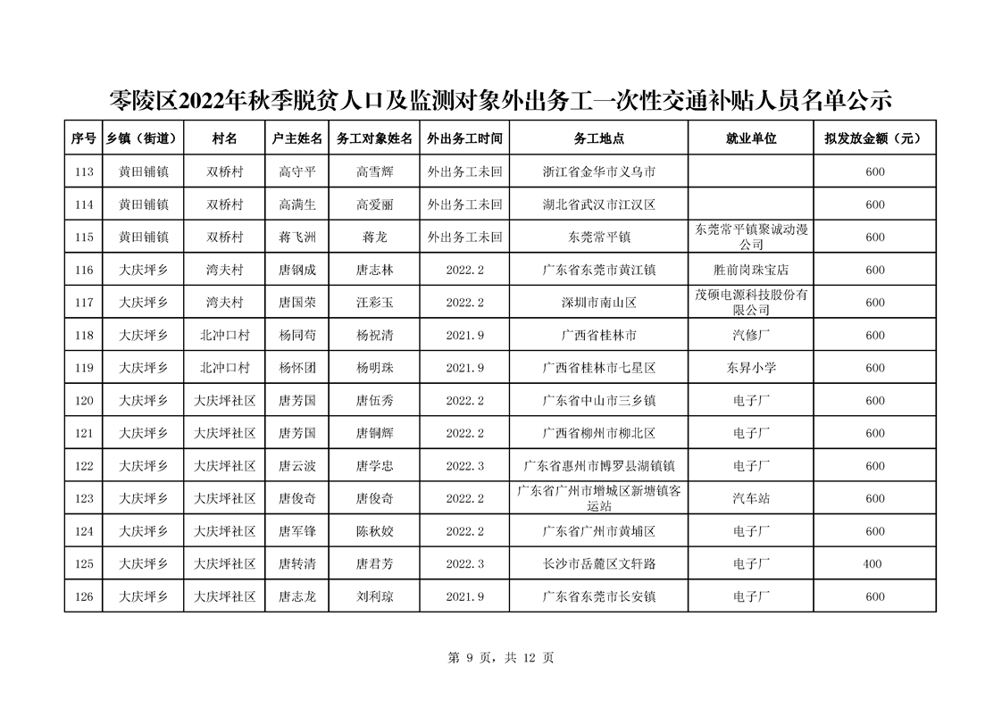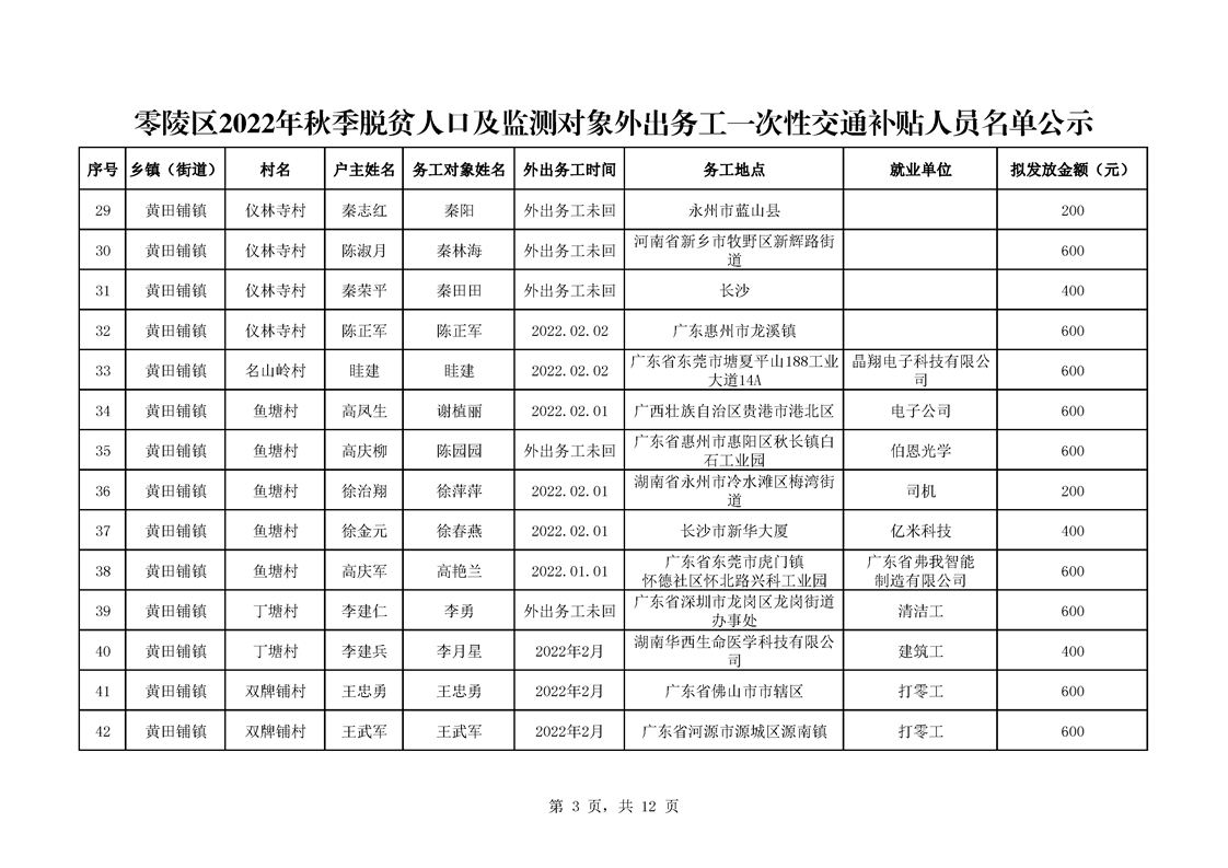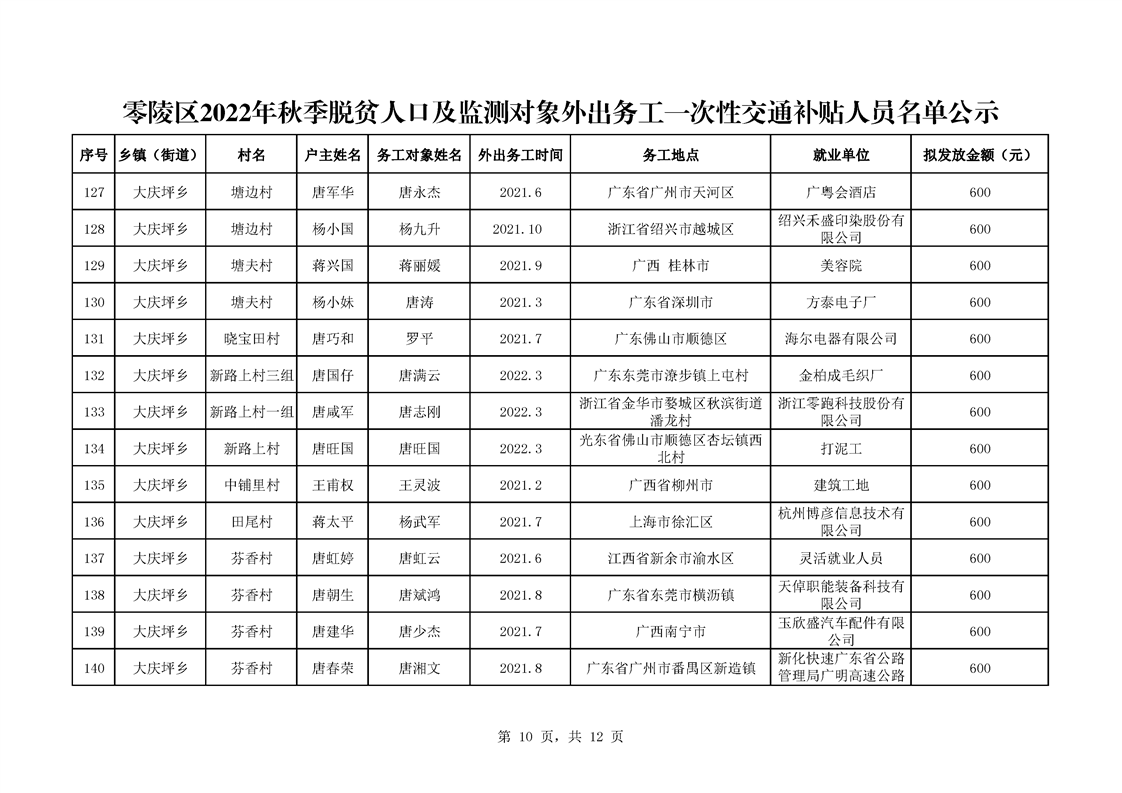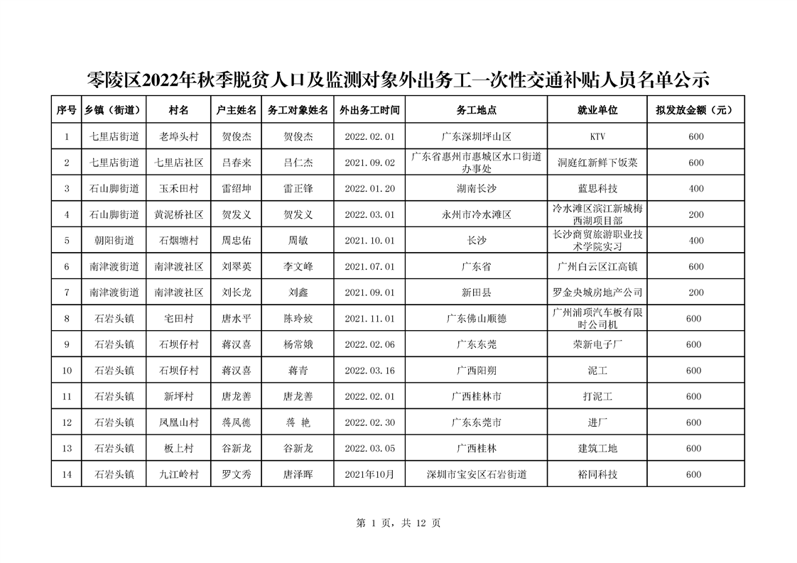 零陵区2022年秋季脱贫人口及监测对象外出务工一次性交通补贴人员名单公示