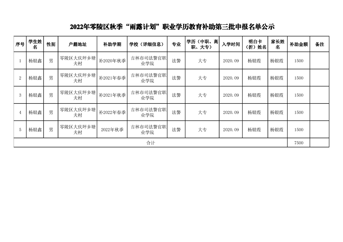 2022年零陵区秋季“雨露计划”职业学历教育补助第三批申报名单公示