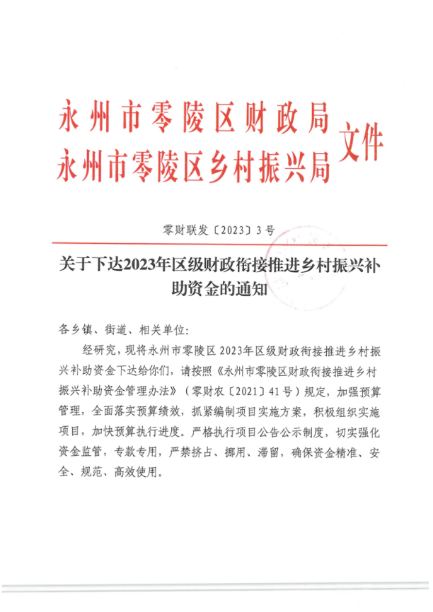 关于下达2023年区级财政衔接推进乡村振兴补助资金的通知(零财联发〔2023〕3号)