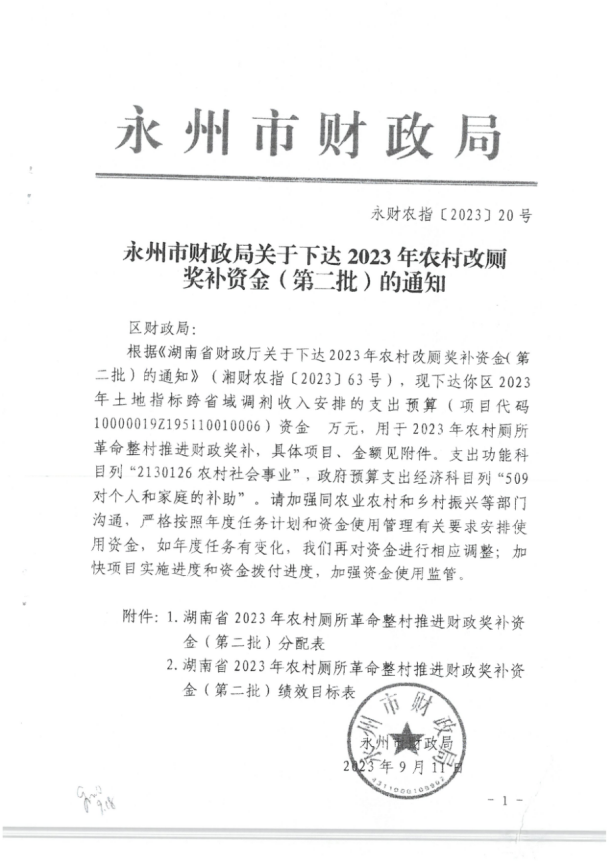 永州市财政局关于下达2023年农村改厕奖补资金(第二批)的通知(永财农指〔2023〕20号)