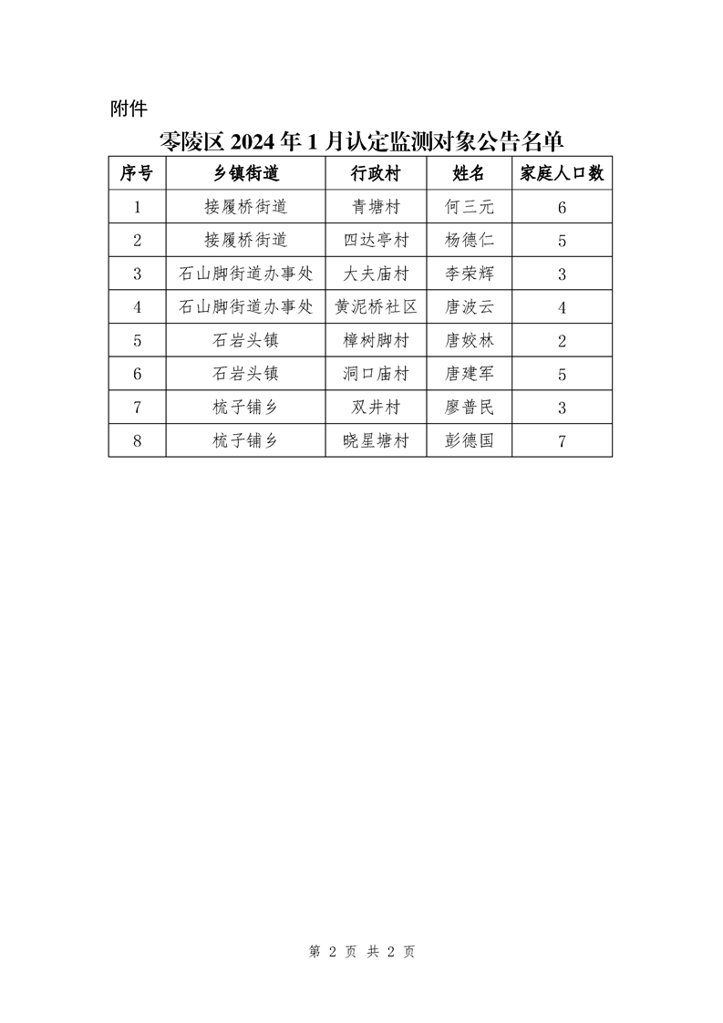 零陵区2024年1月认定新增监测对象名单公告