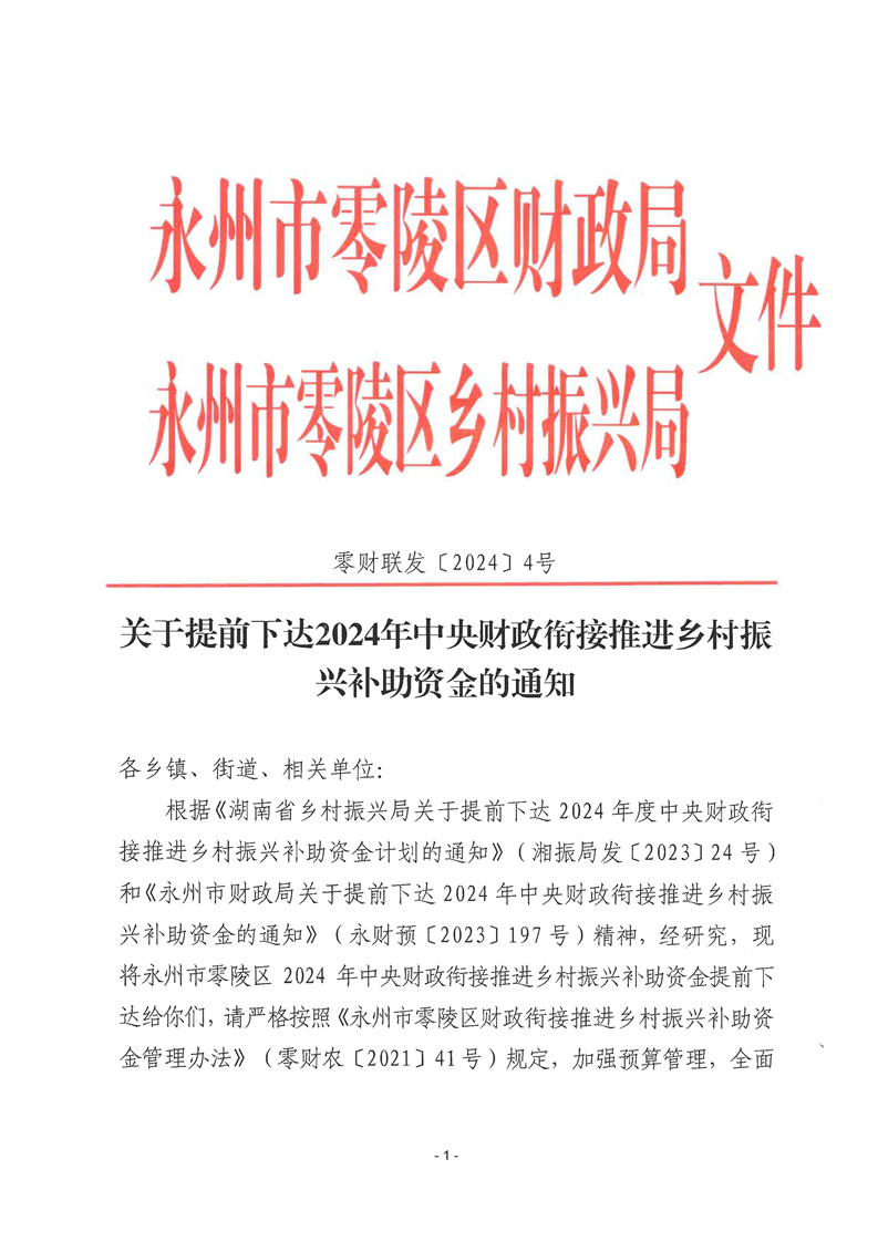 关于提前下达2024年中央财政衔接推进乡村振兴补助资金的通知