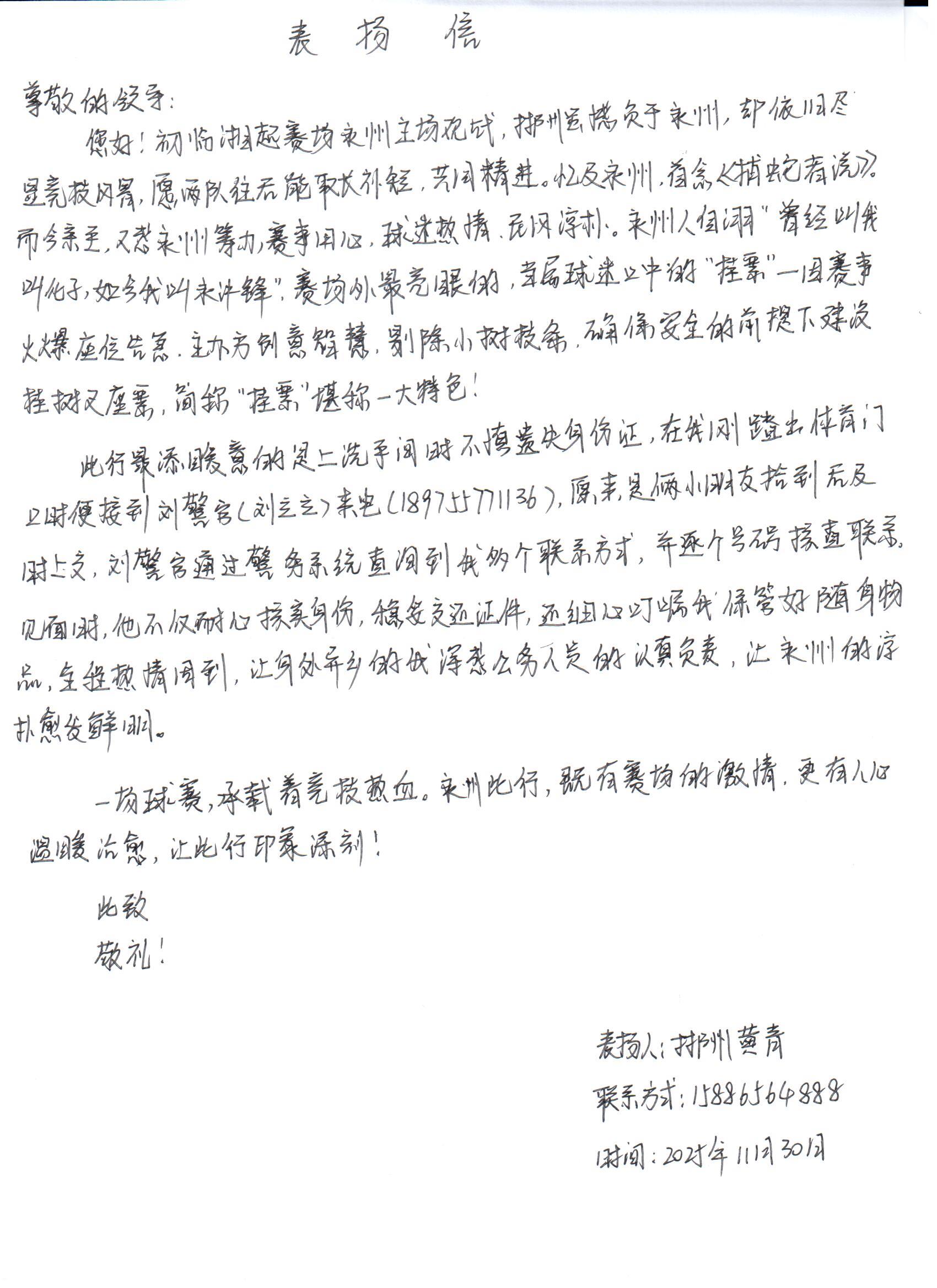 12月5日,永州公安收到了一封来自郴州的特殊手写表扬信。信中,“湘超”郴州球迷黄某深情讲述了他在永州主场观看湘超联赛时的一段暖心经历,让一场足球赛事的意义超越了竞技本身。