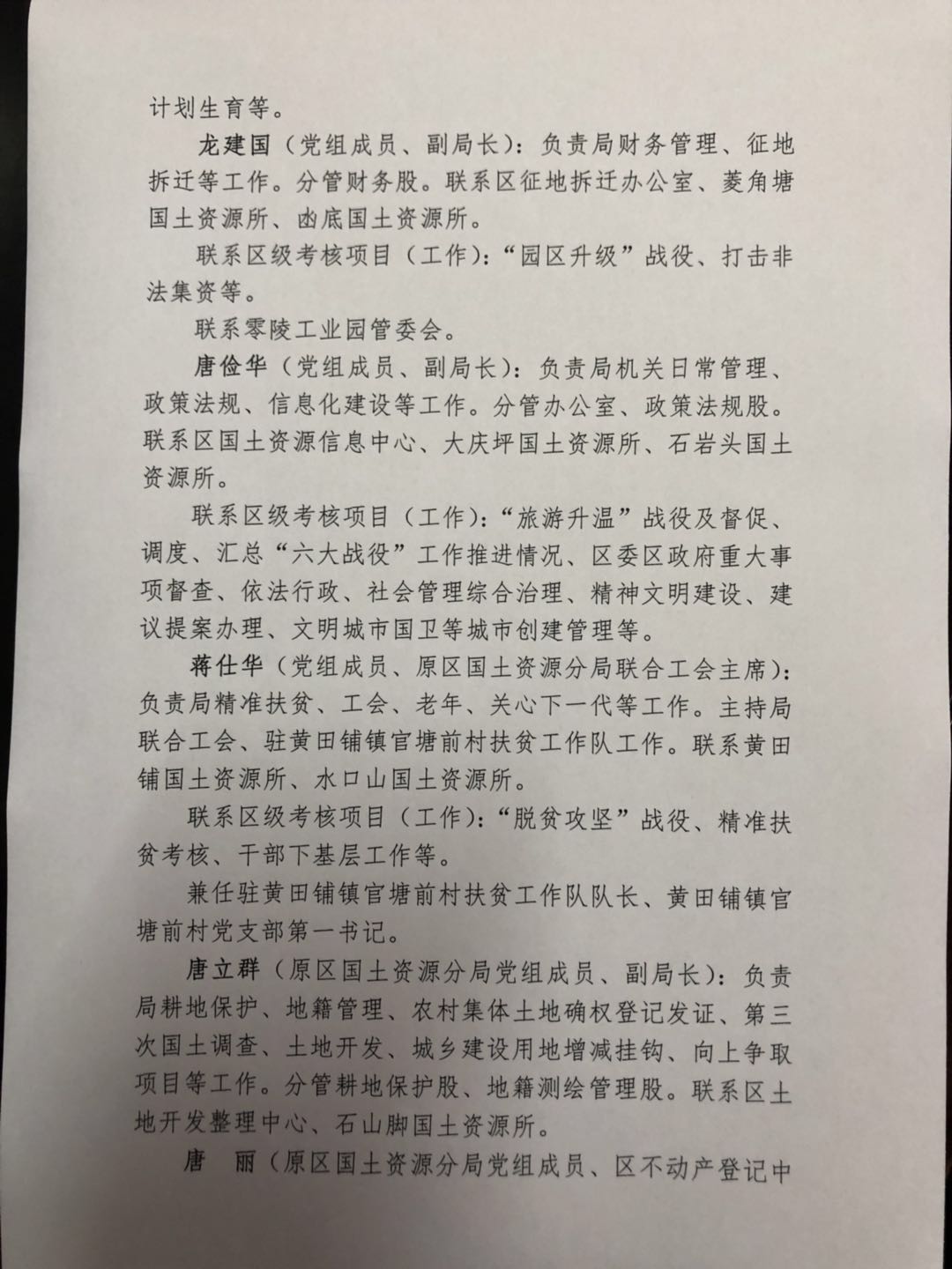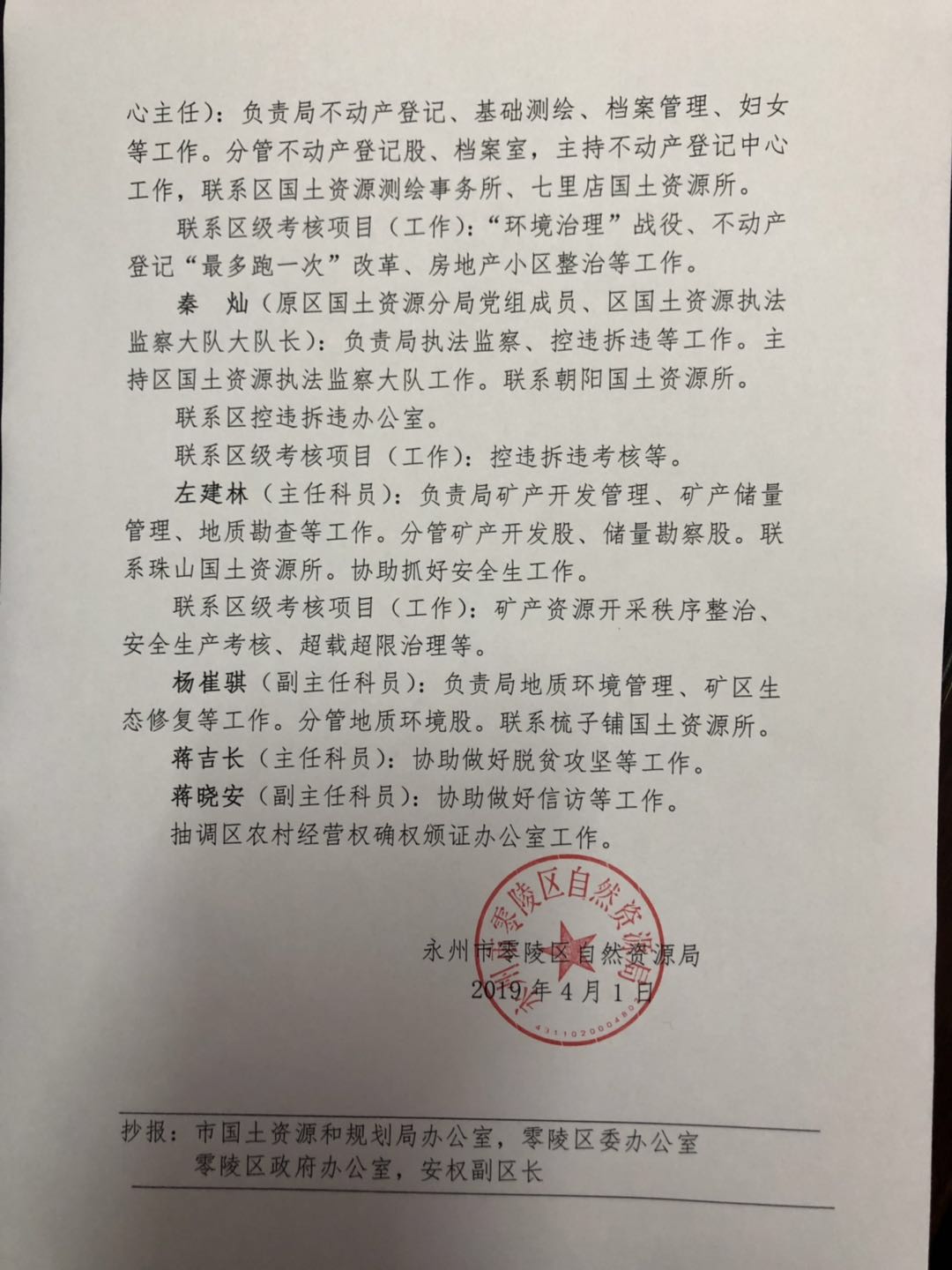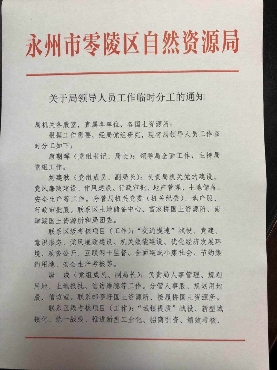 零陵区自然资源局关于局领导人员工作临时分工的通知
