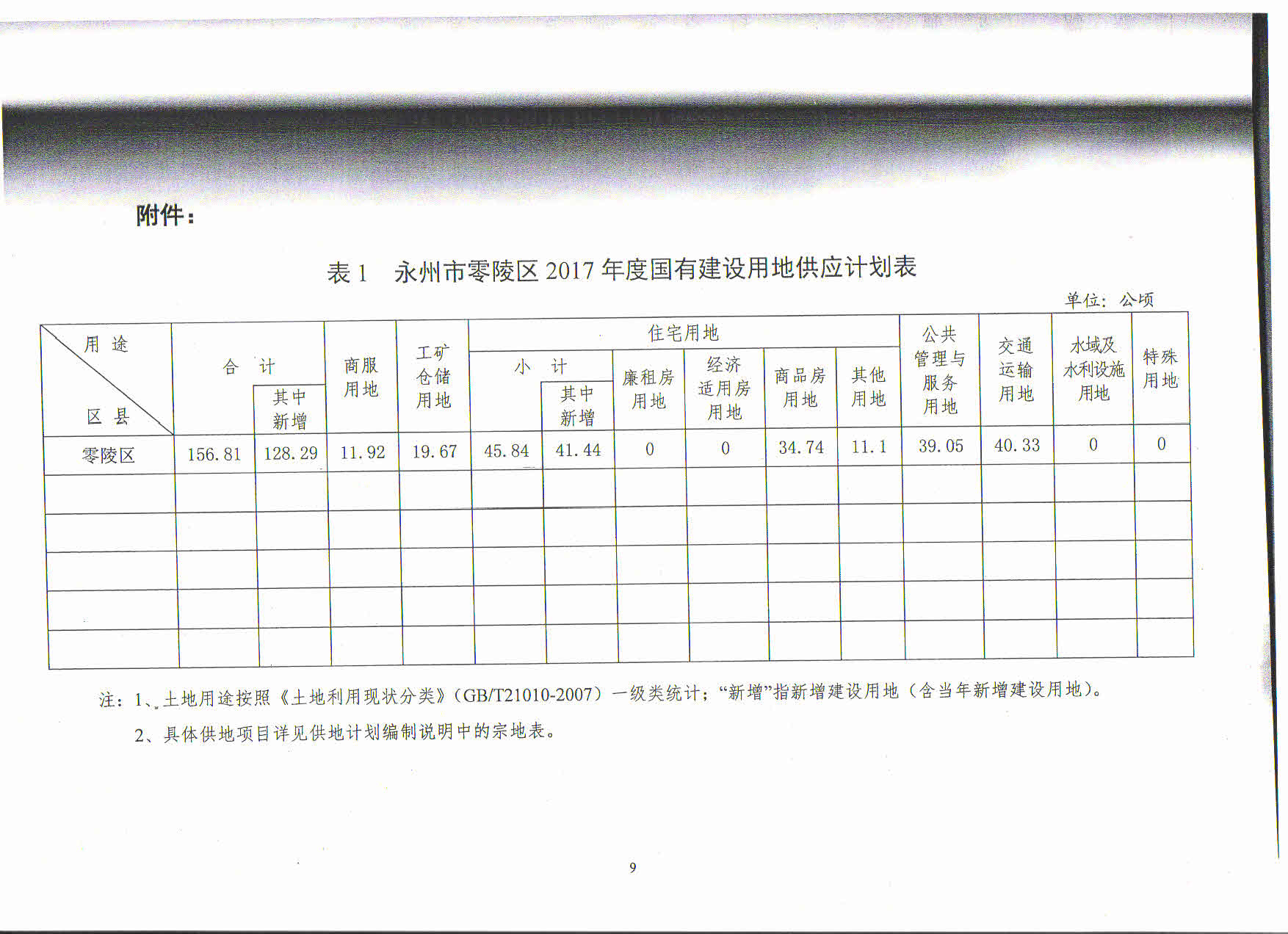 永州市零陵区2017年度国有建设用地供应计划表