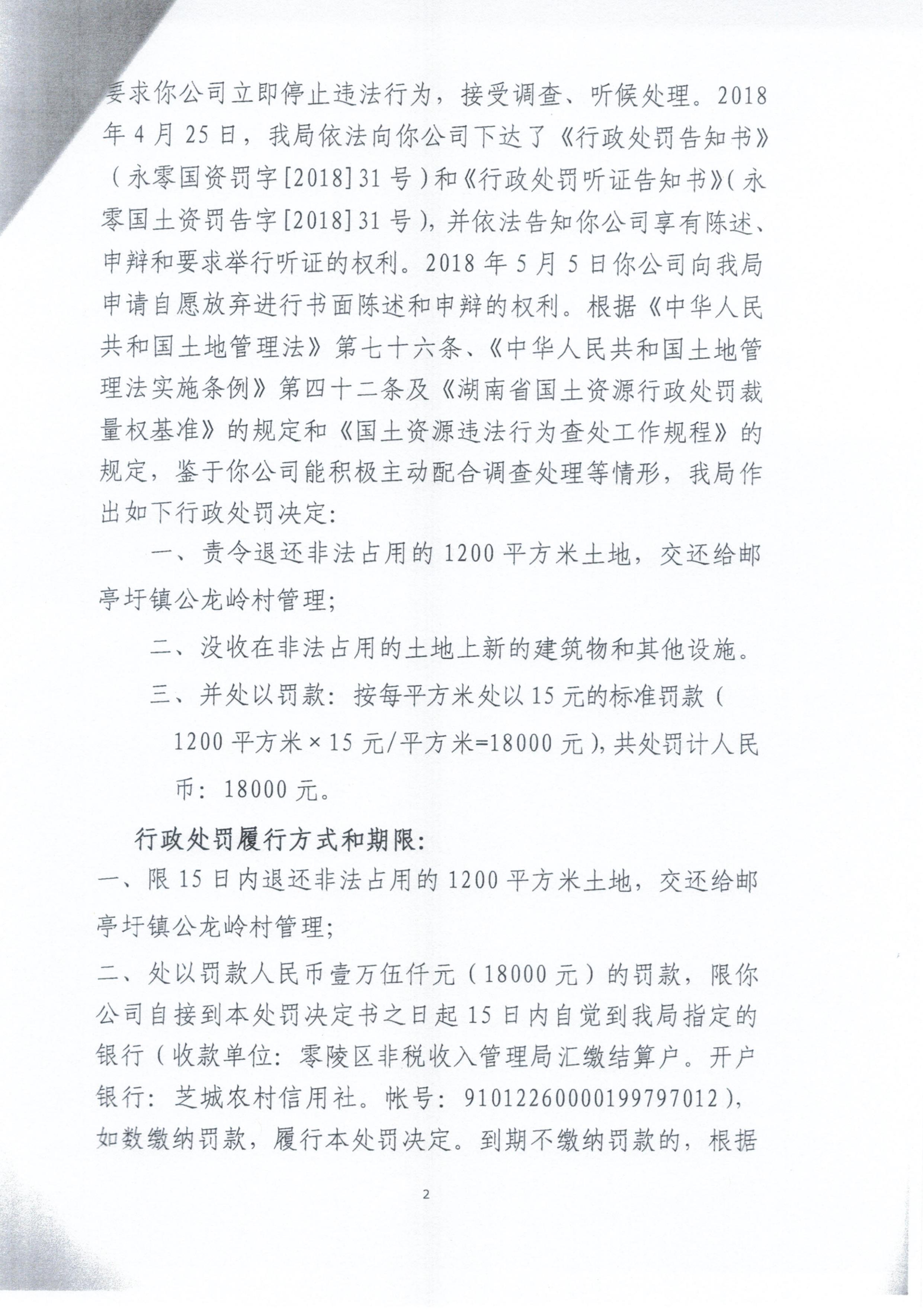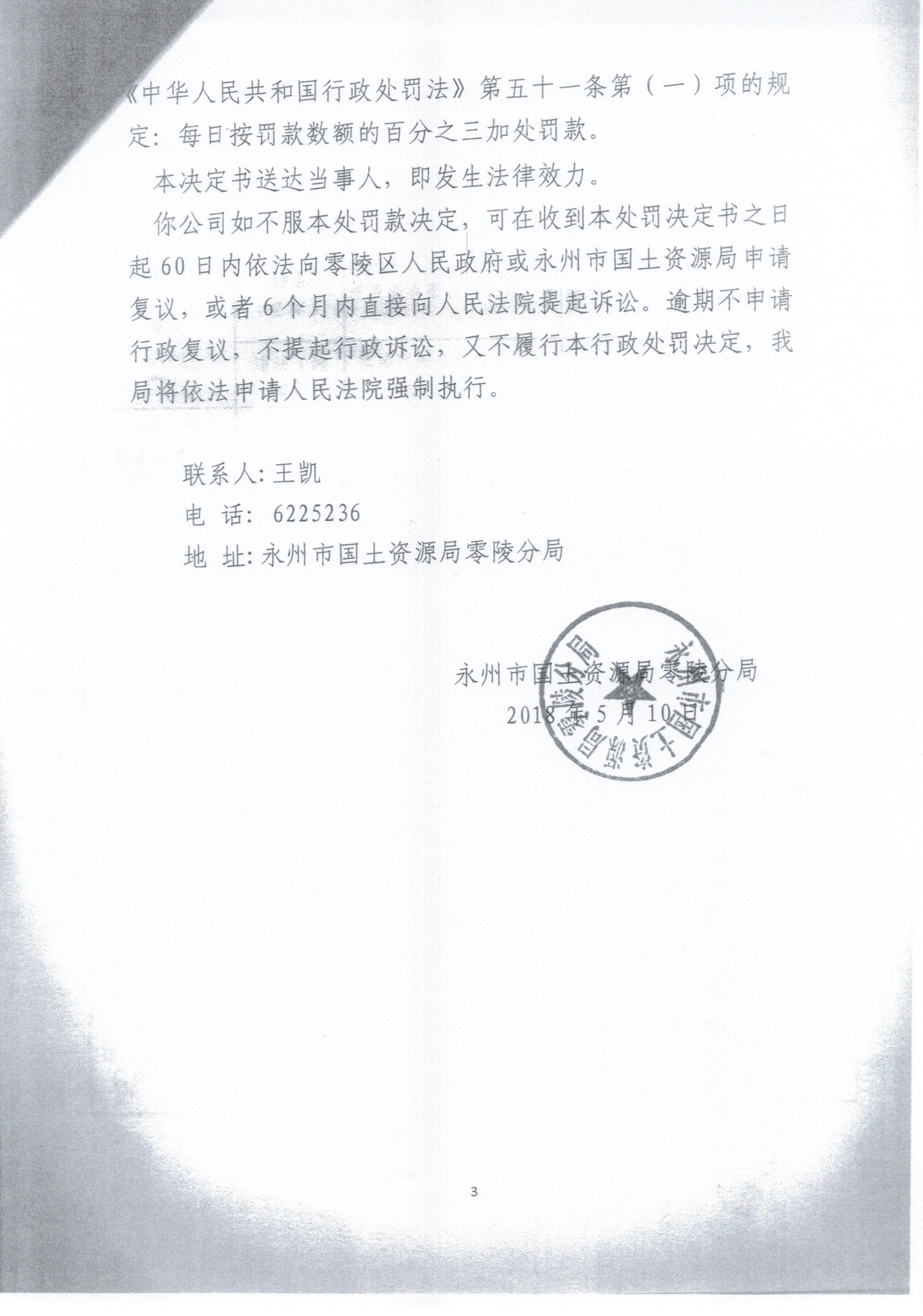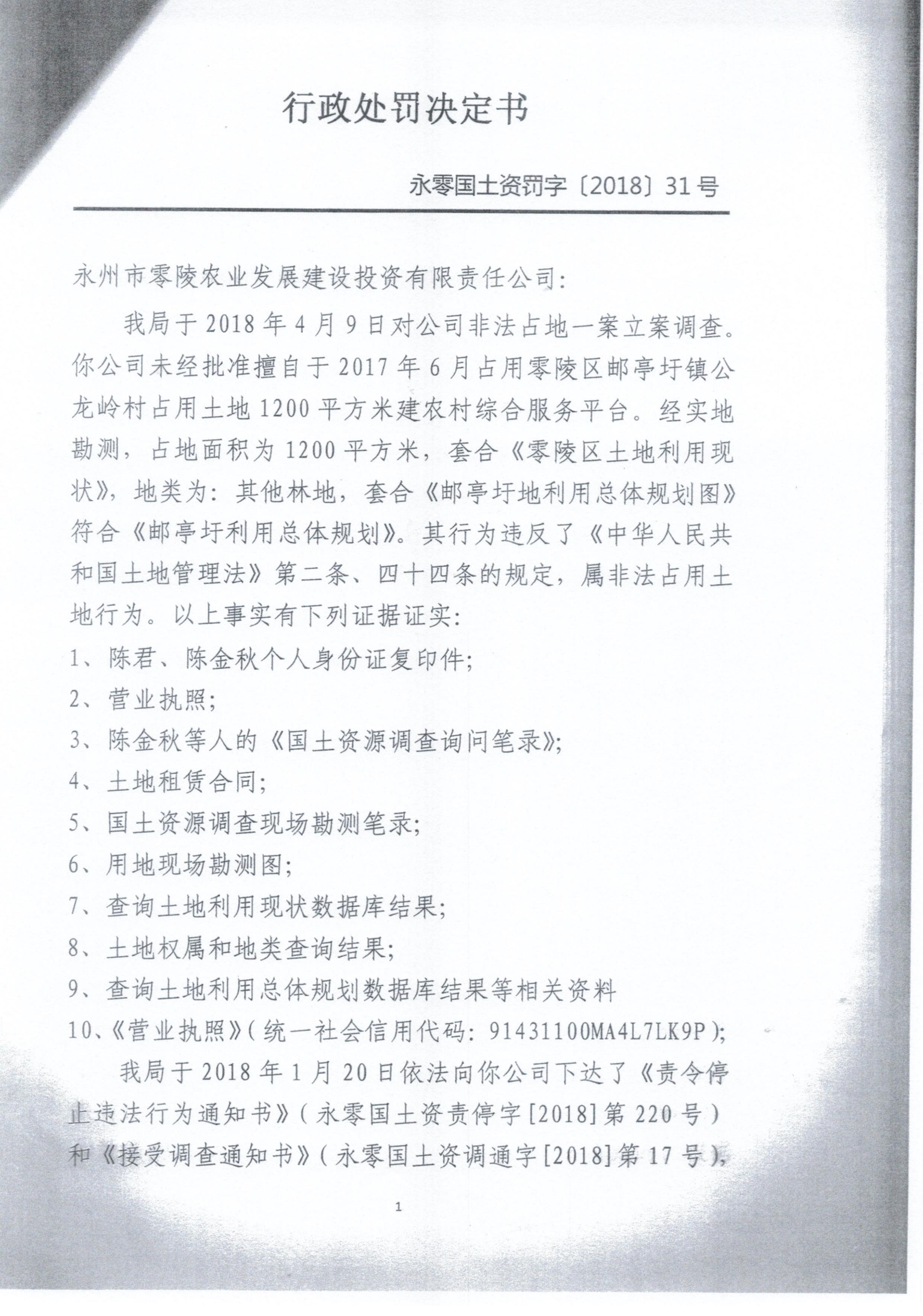 行政处罚决定书(永州市零陵农业发展建设投资有限责任公司)永零国土资罚字〔2018〕31号