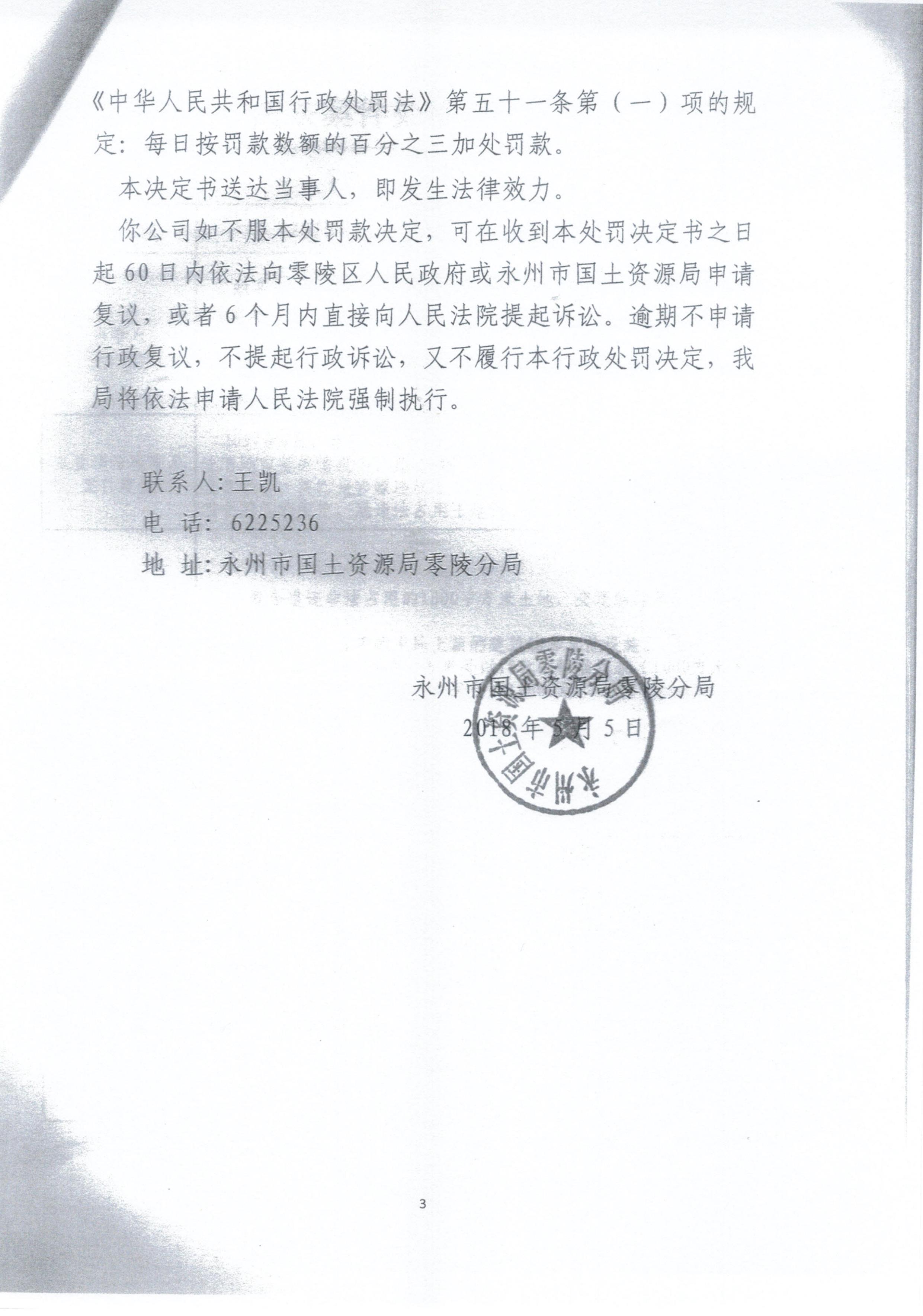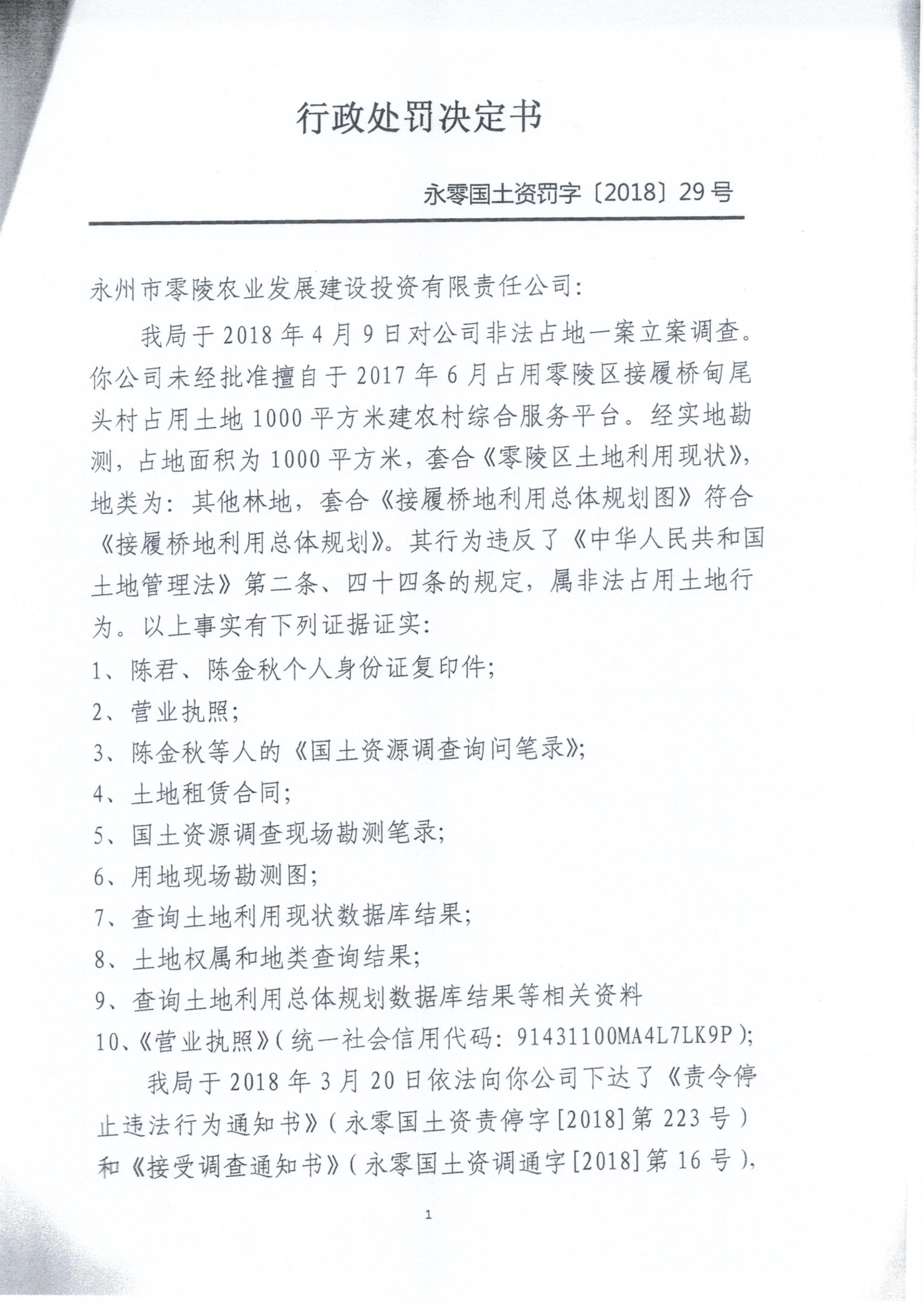 行政处罚决定书(永州市零陵农业发展建设投资有限责任公司)永零国土资罚字〔2018〕29号