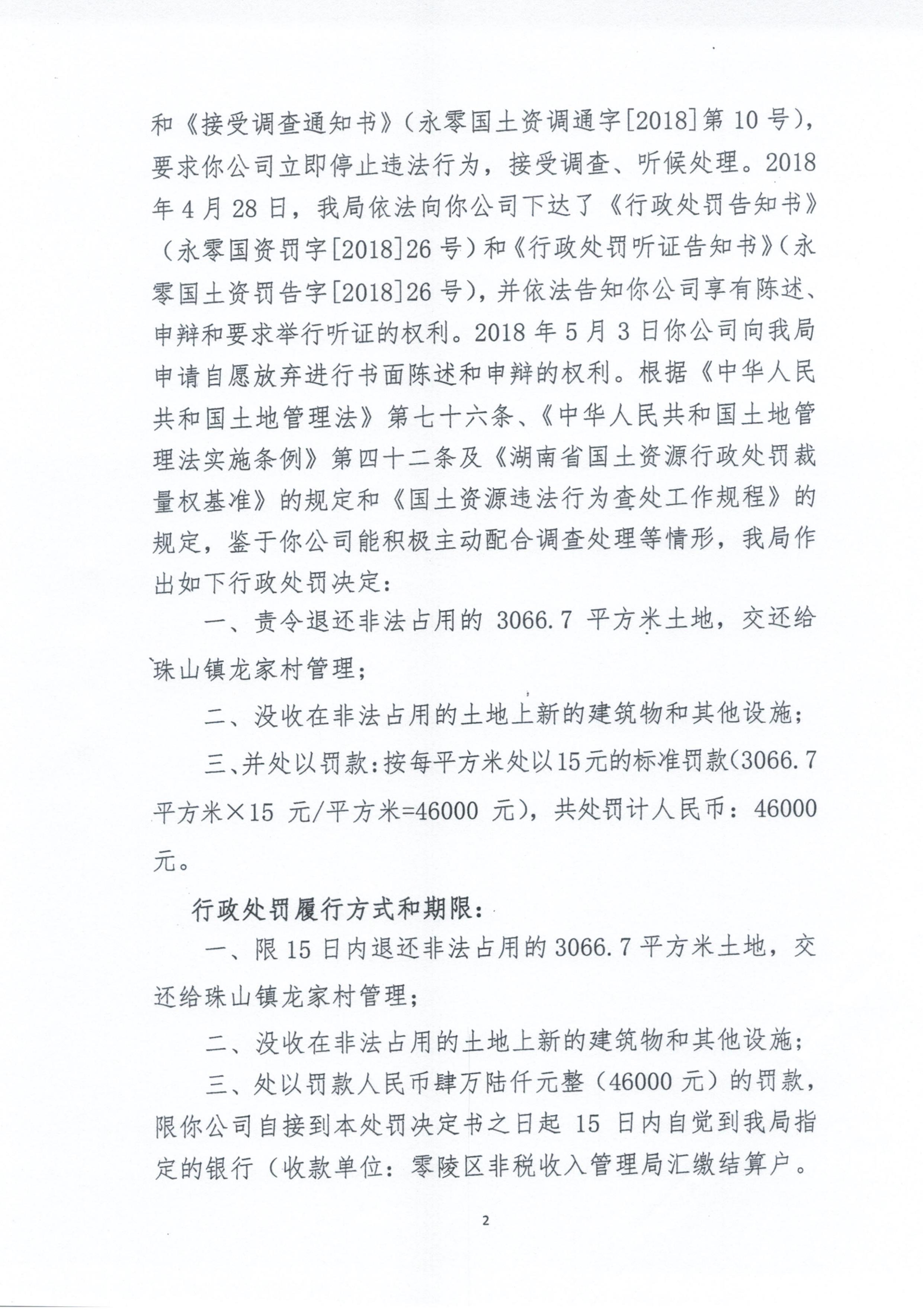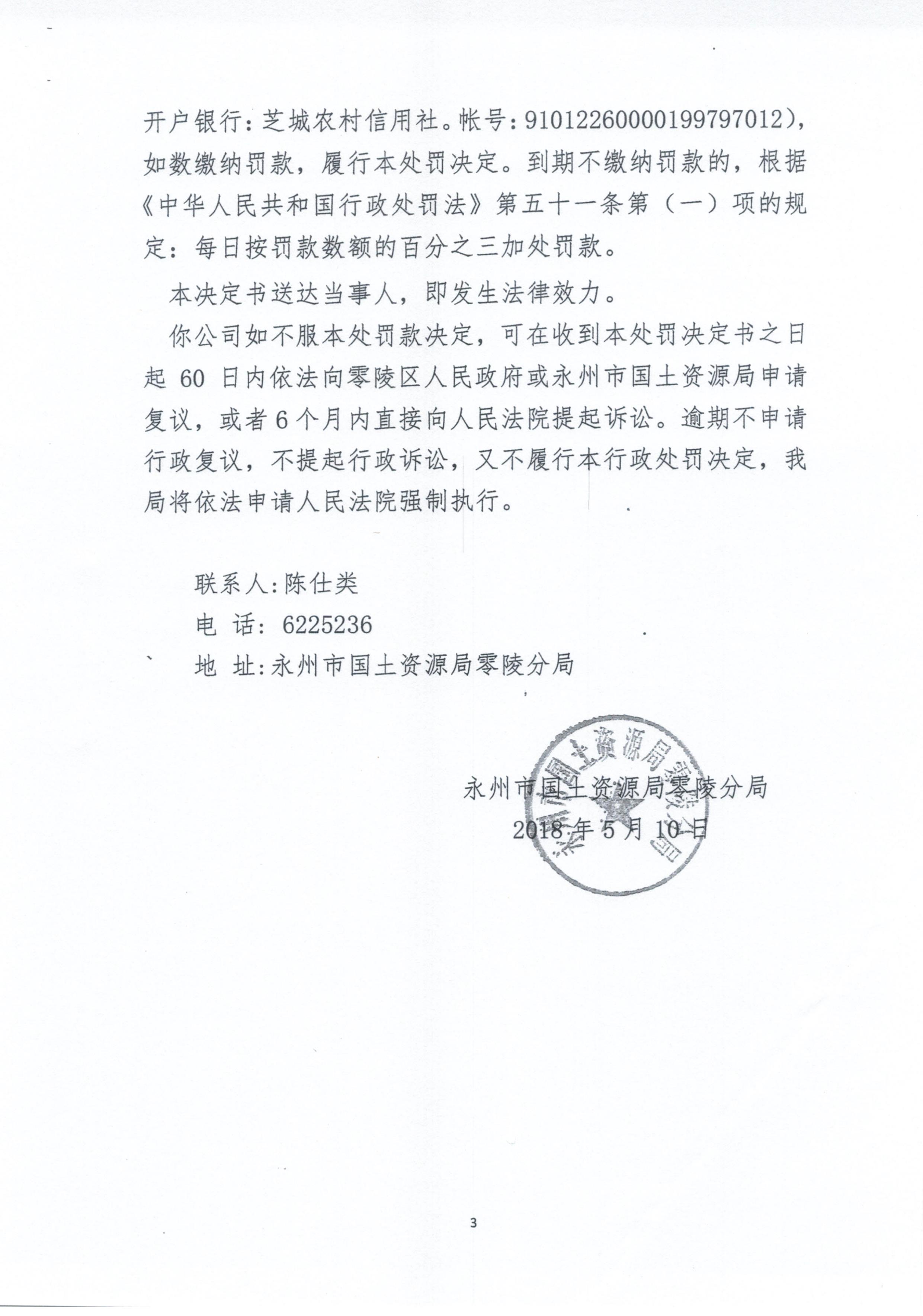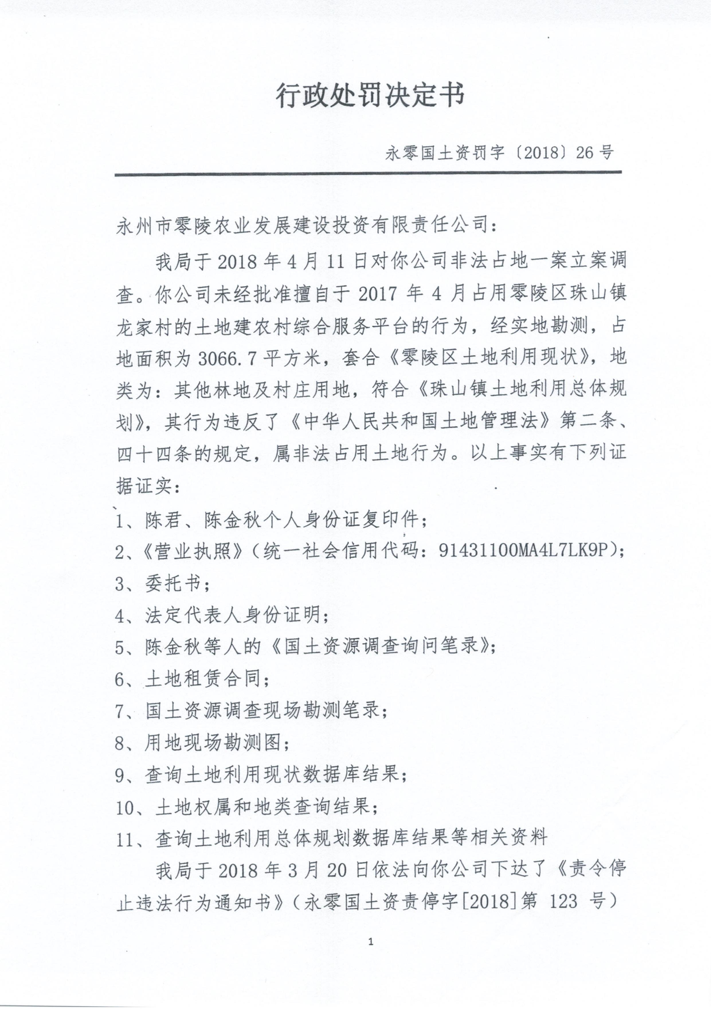 行政处罚决定书(永州市零陵农业发展建设投资有限责任公司)永零国土资罚字〔2018〕26号