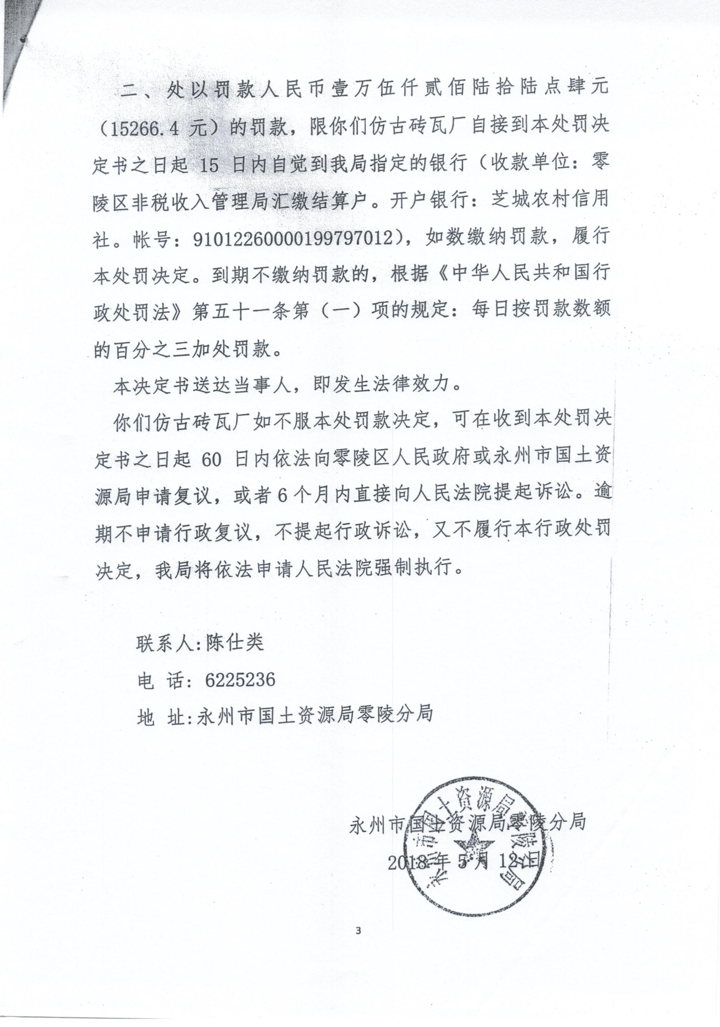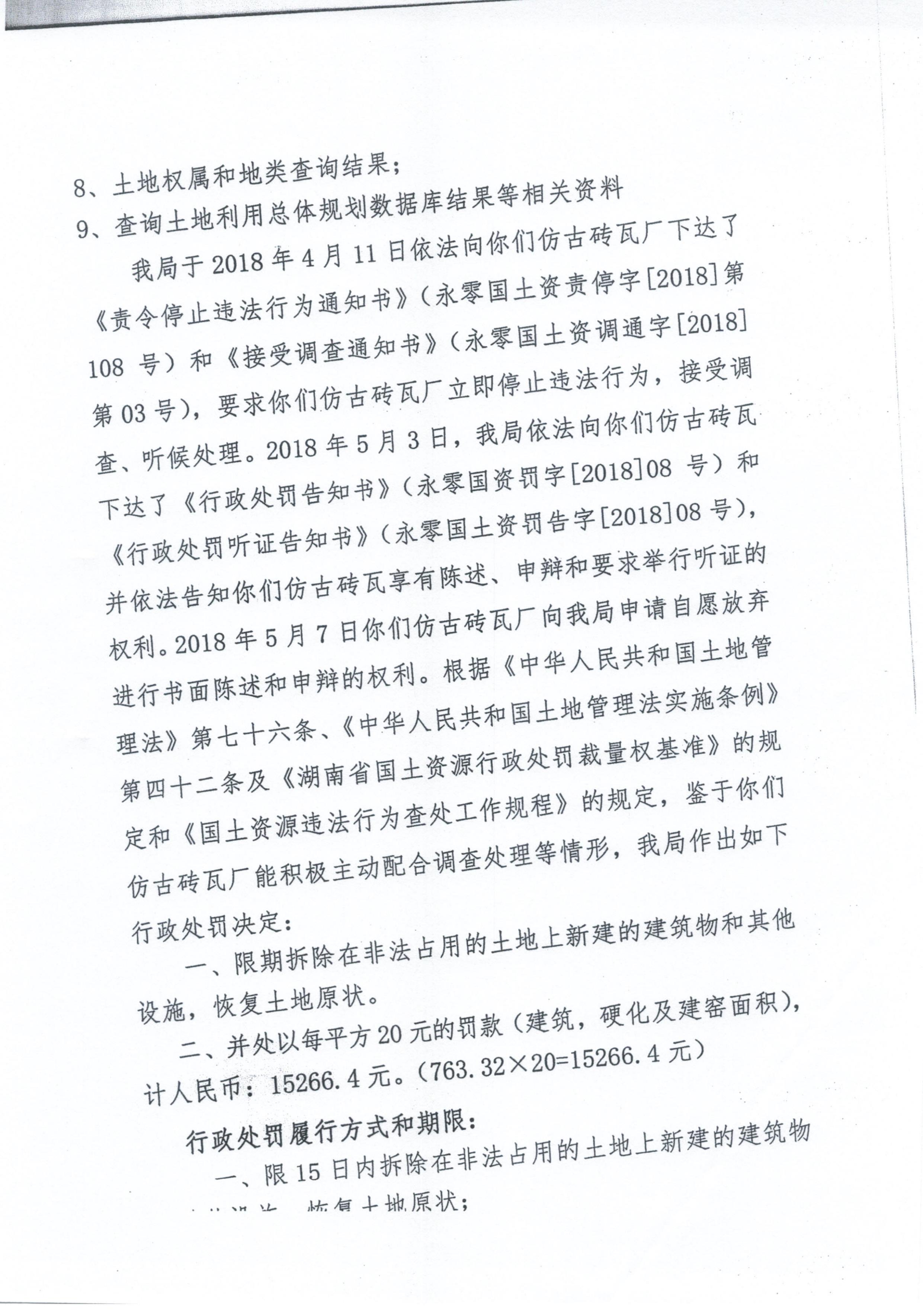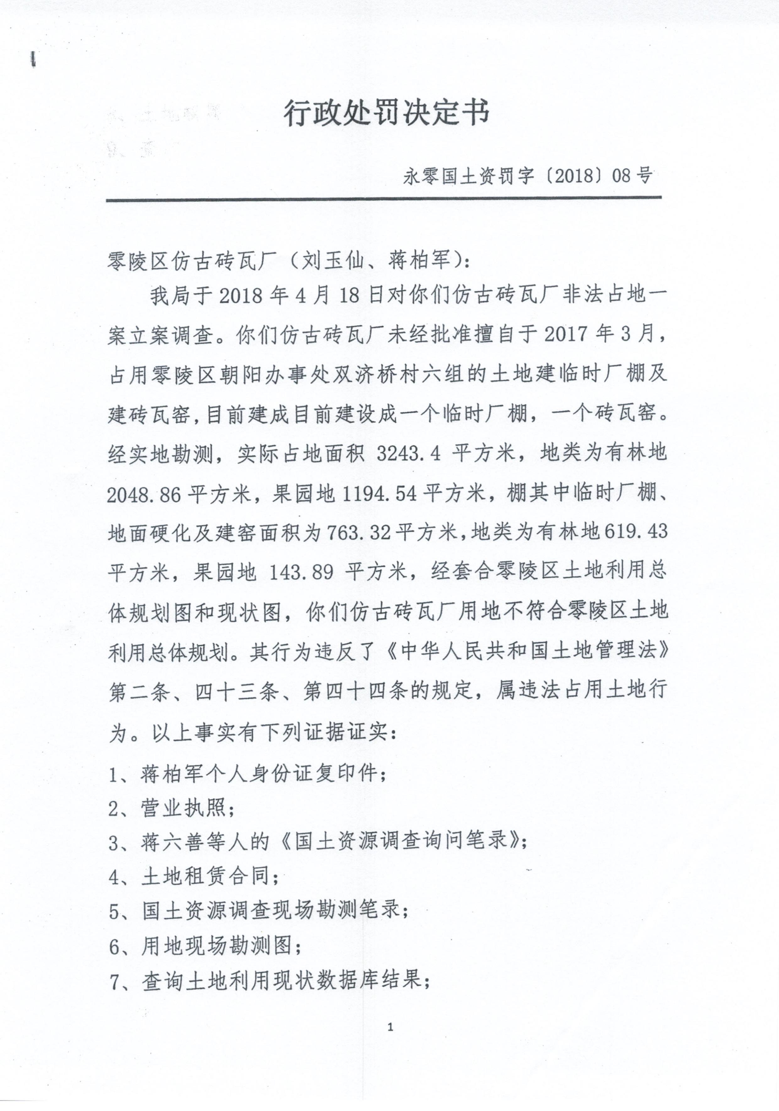 行政处罚决定书(零陵区仿古砖瓦厂)永零国土资罚字〔2018〕08号