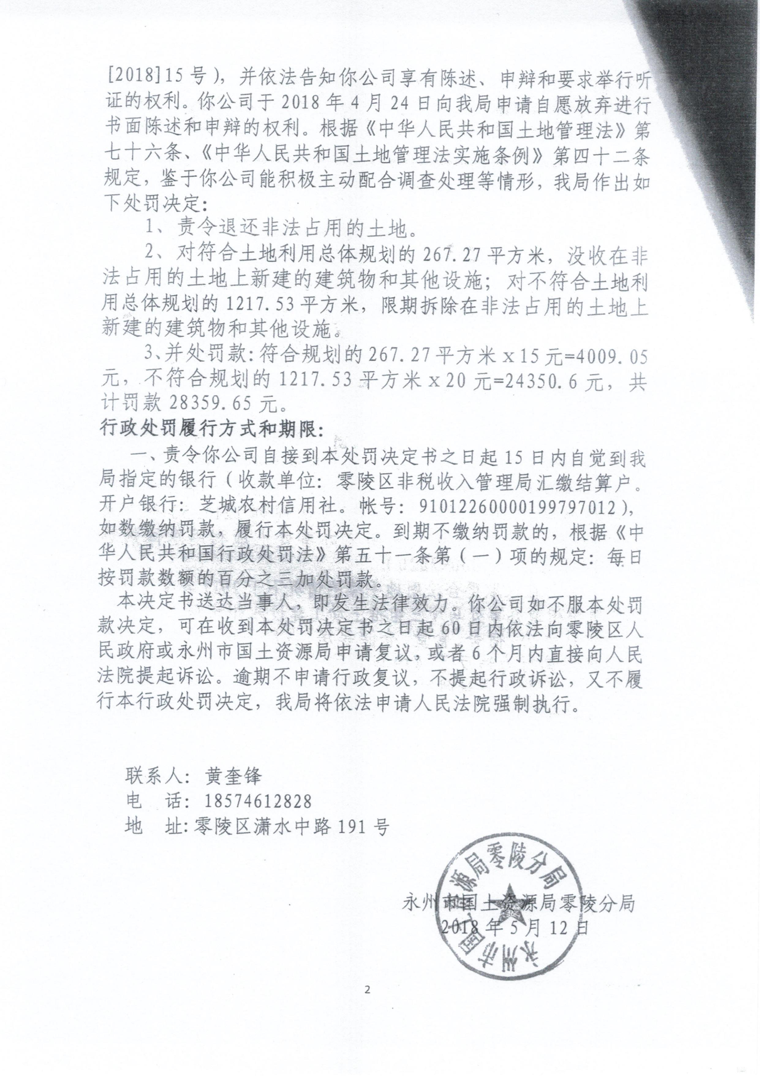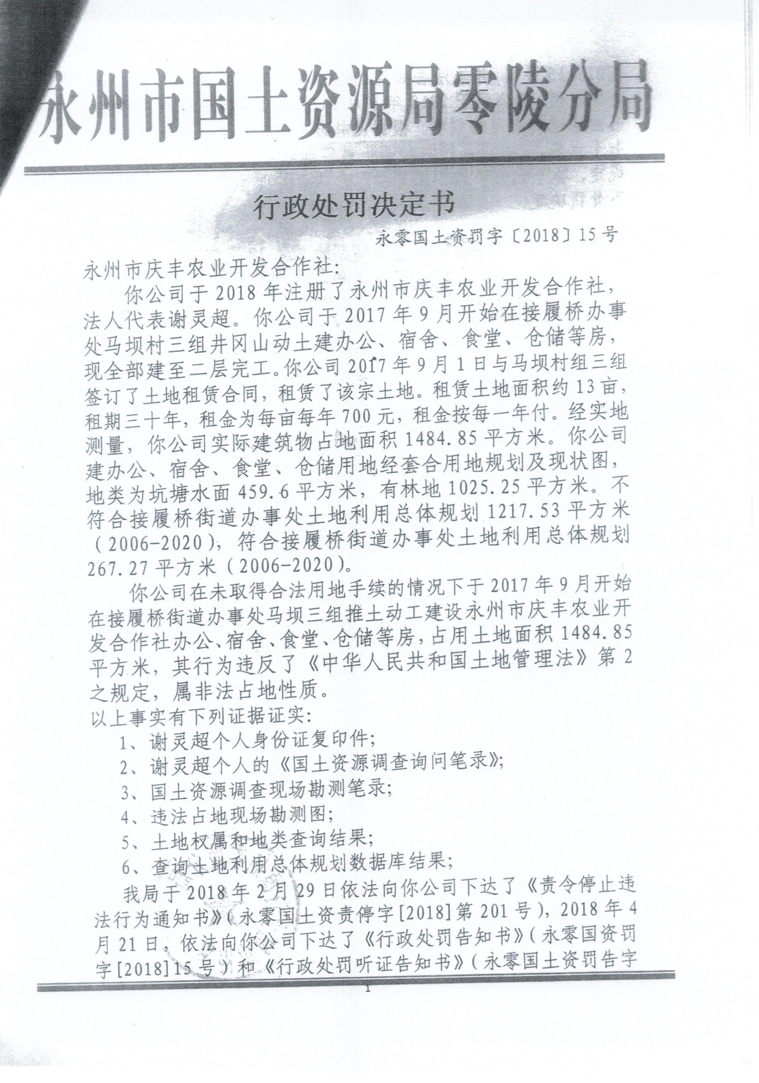 行政处罚决定书(永州市庆丰农业开发合作社)永零国土资罚字〔2018〕15号