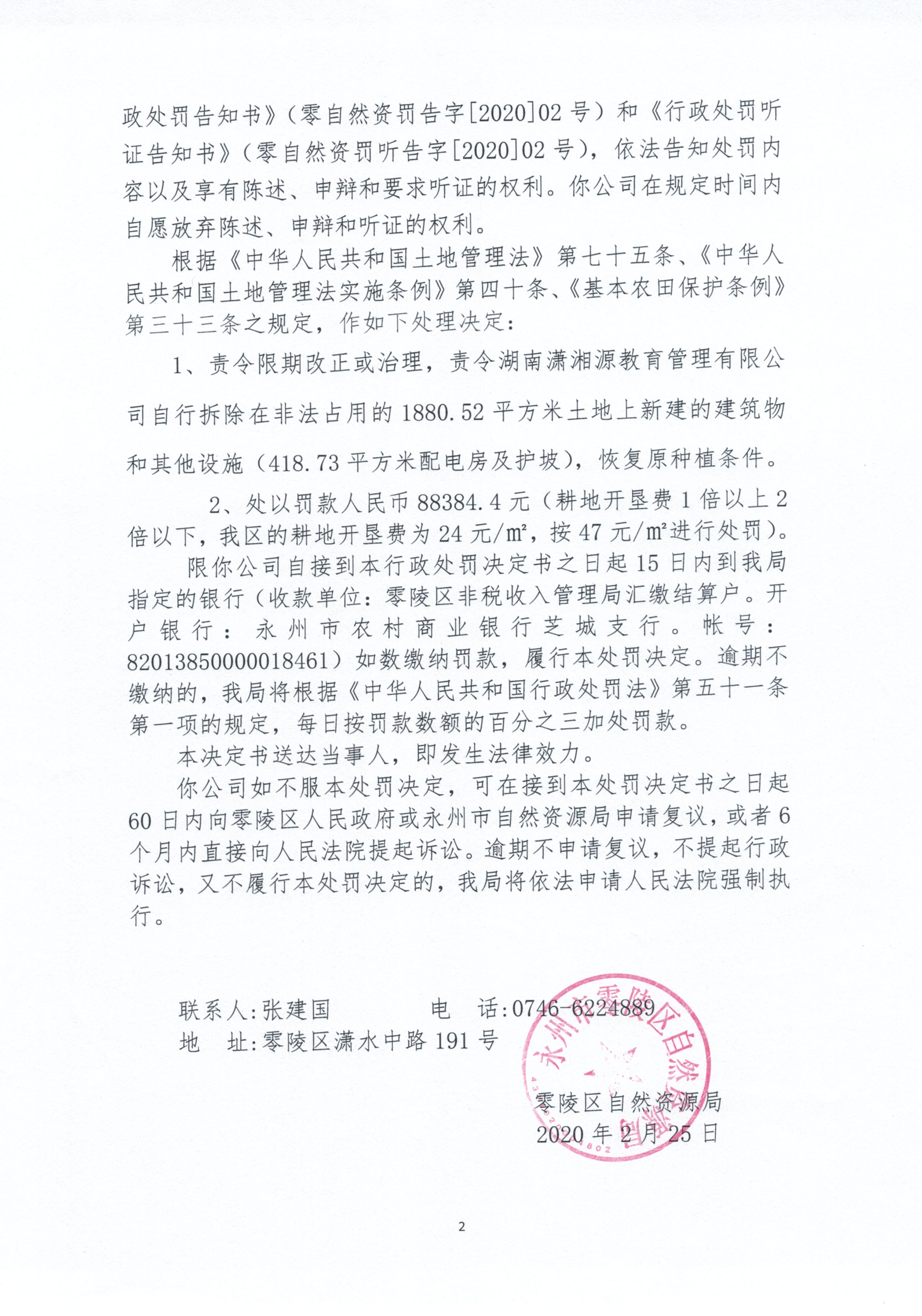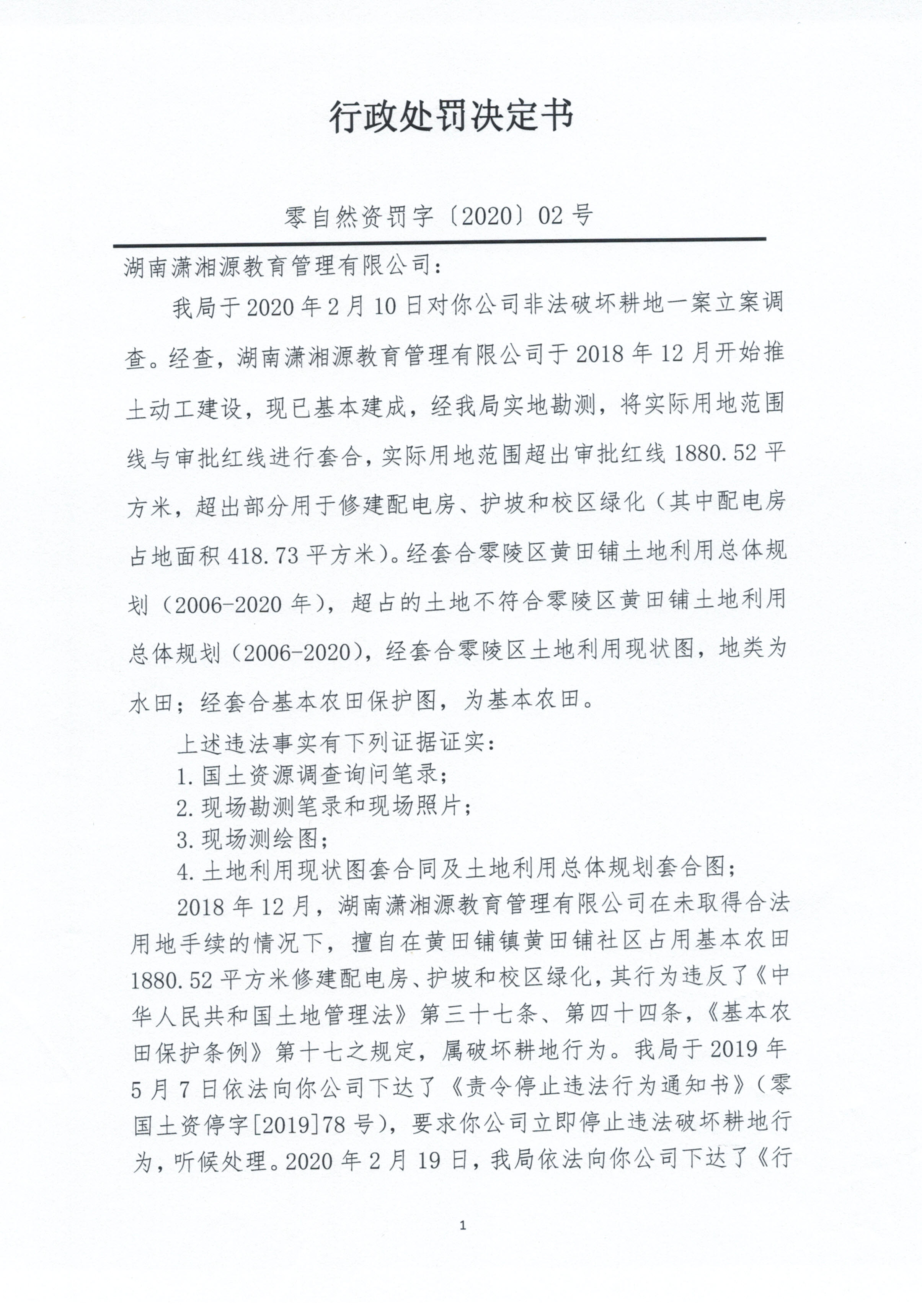 行政处罚决定书(湖南潇湘源教育管理有限公司)零自然资罚字〔2020〕02号