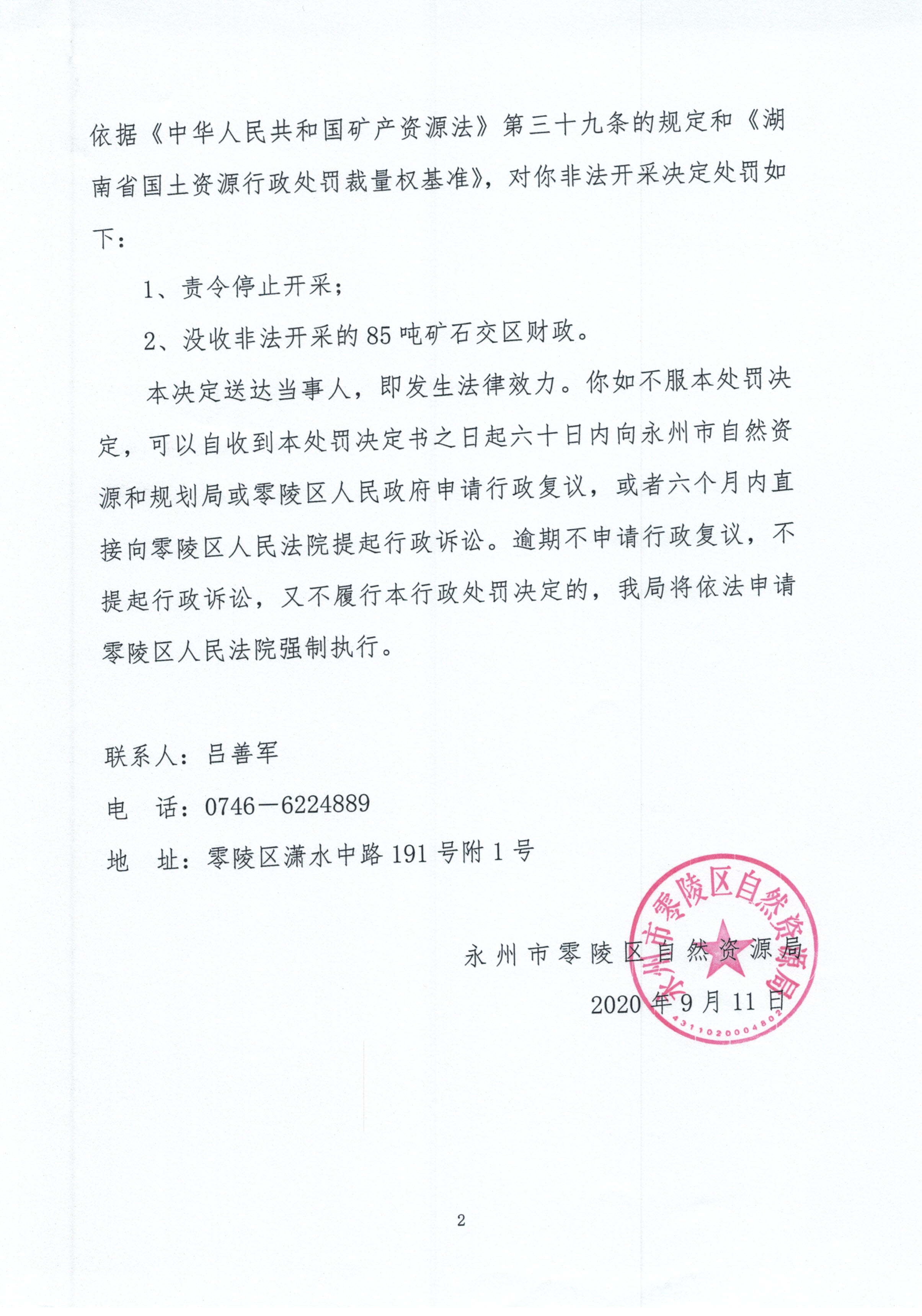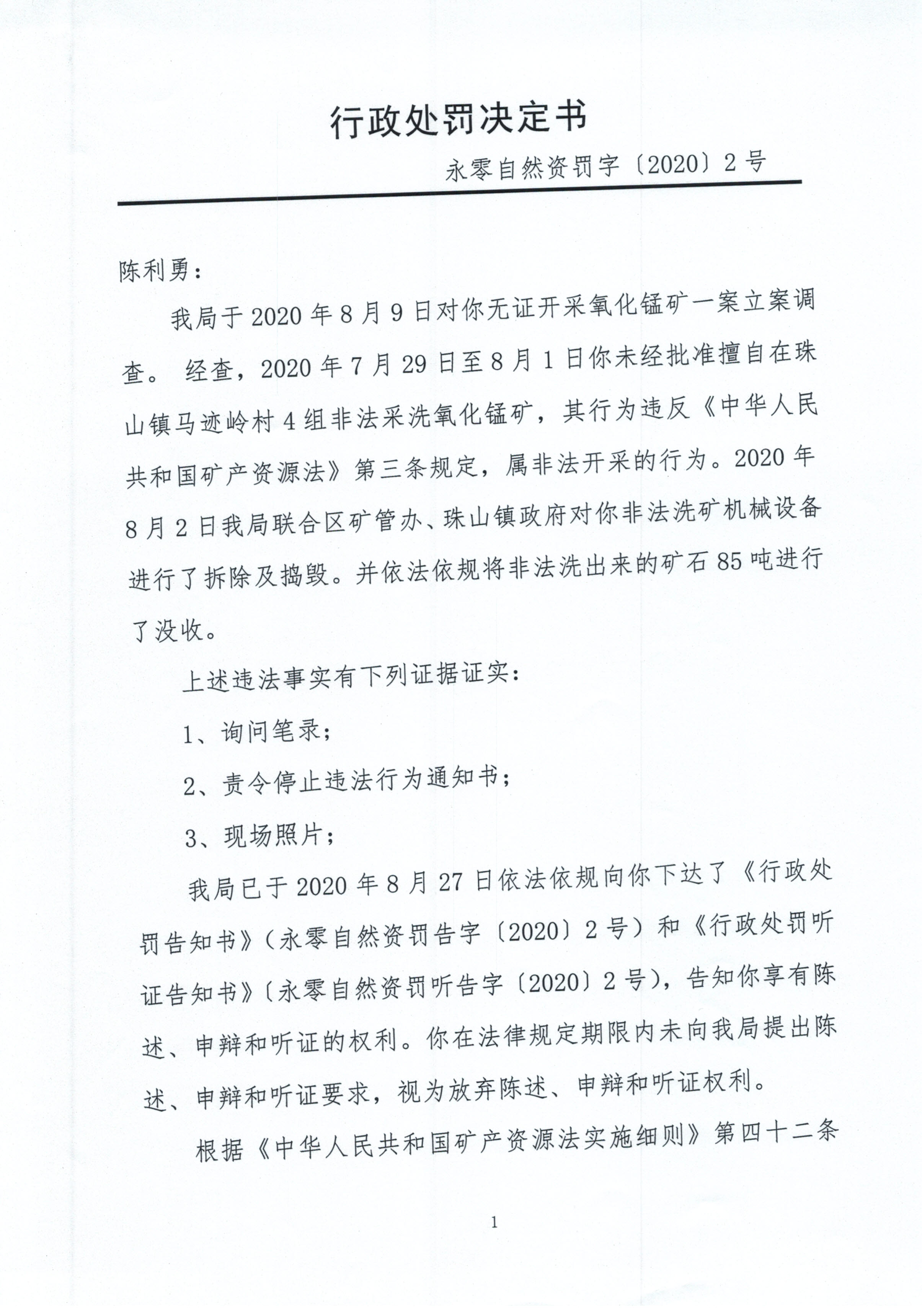 行政处罚决定书(陈利勇)永零自然资罚字〔2020〕02号