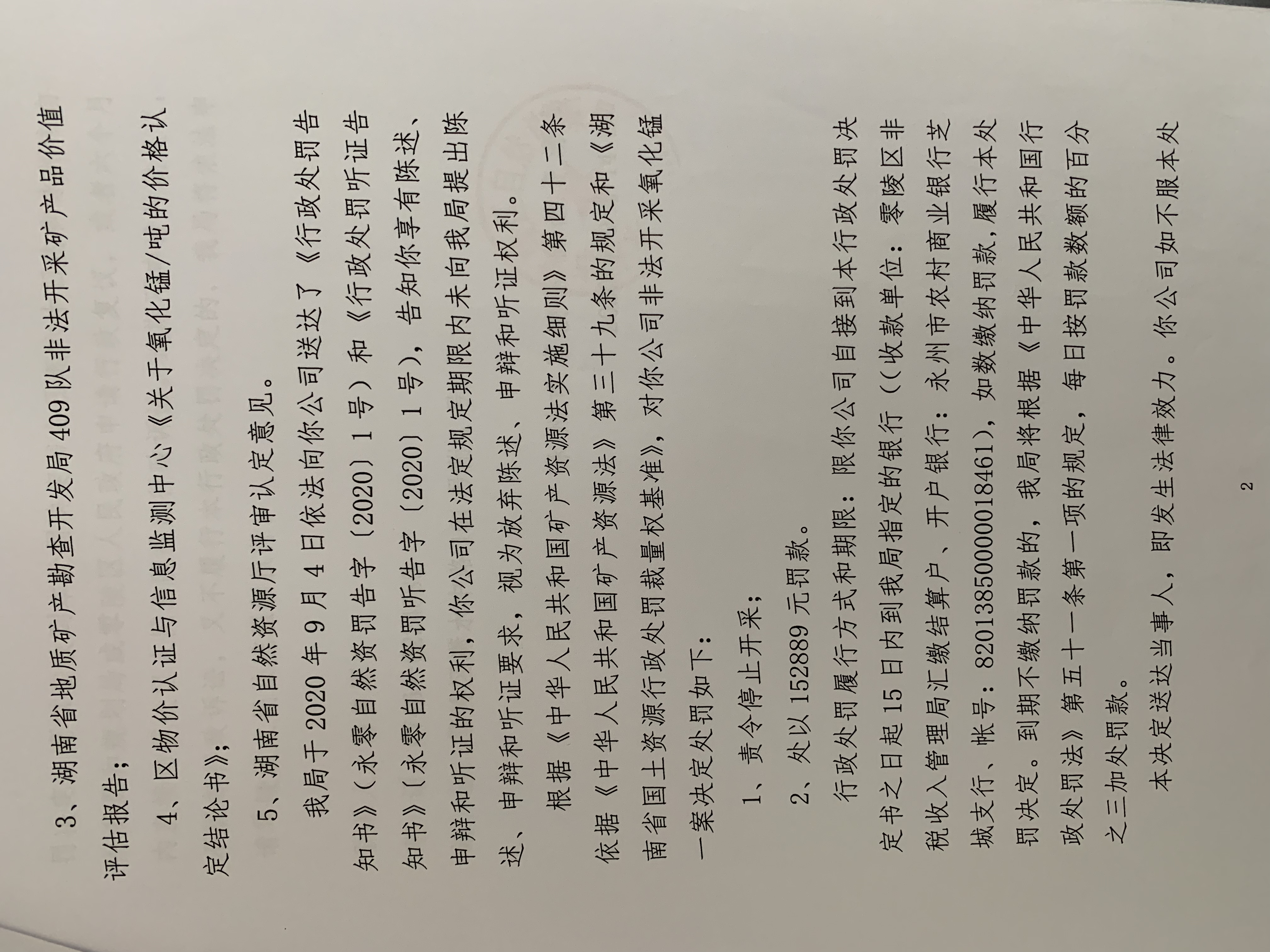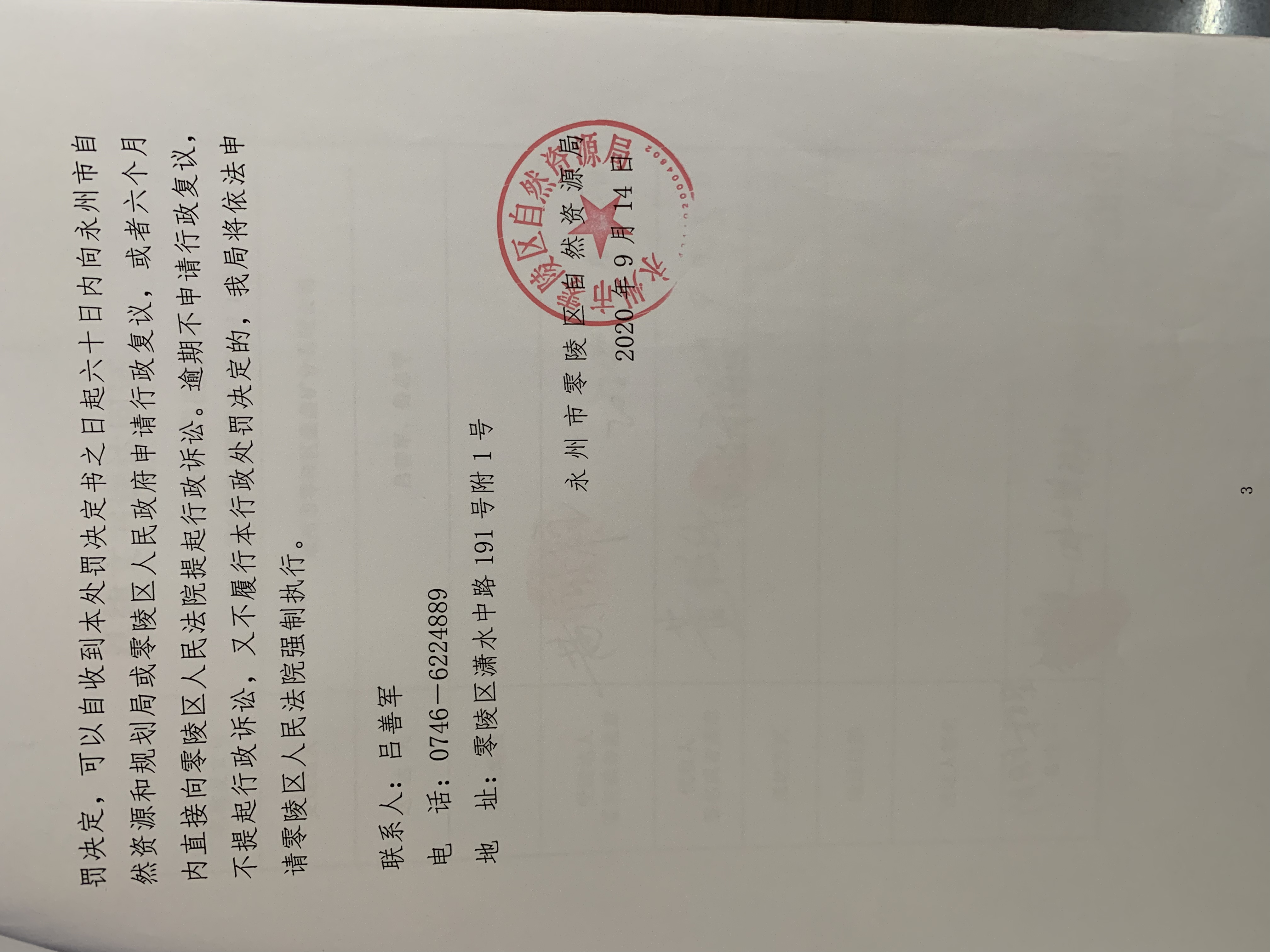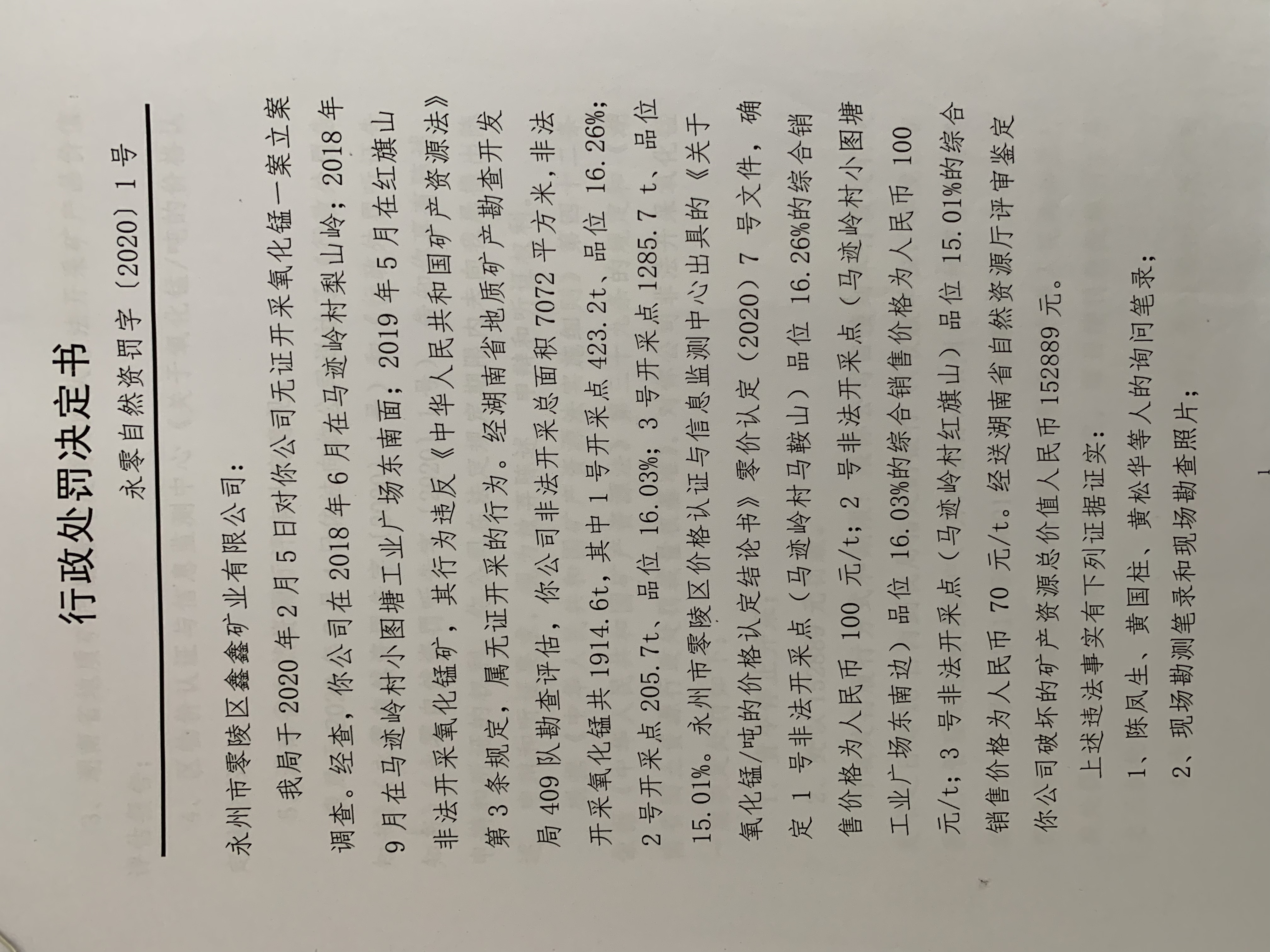 行政处罚决定书(永州市零陵区鑫鑫矿业有限公司)永零自然资罚字〔2020〕01号