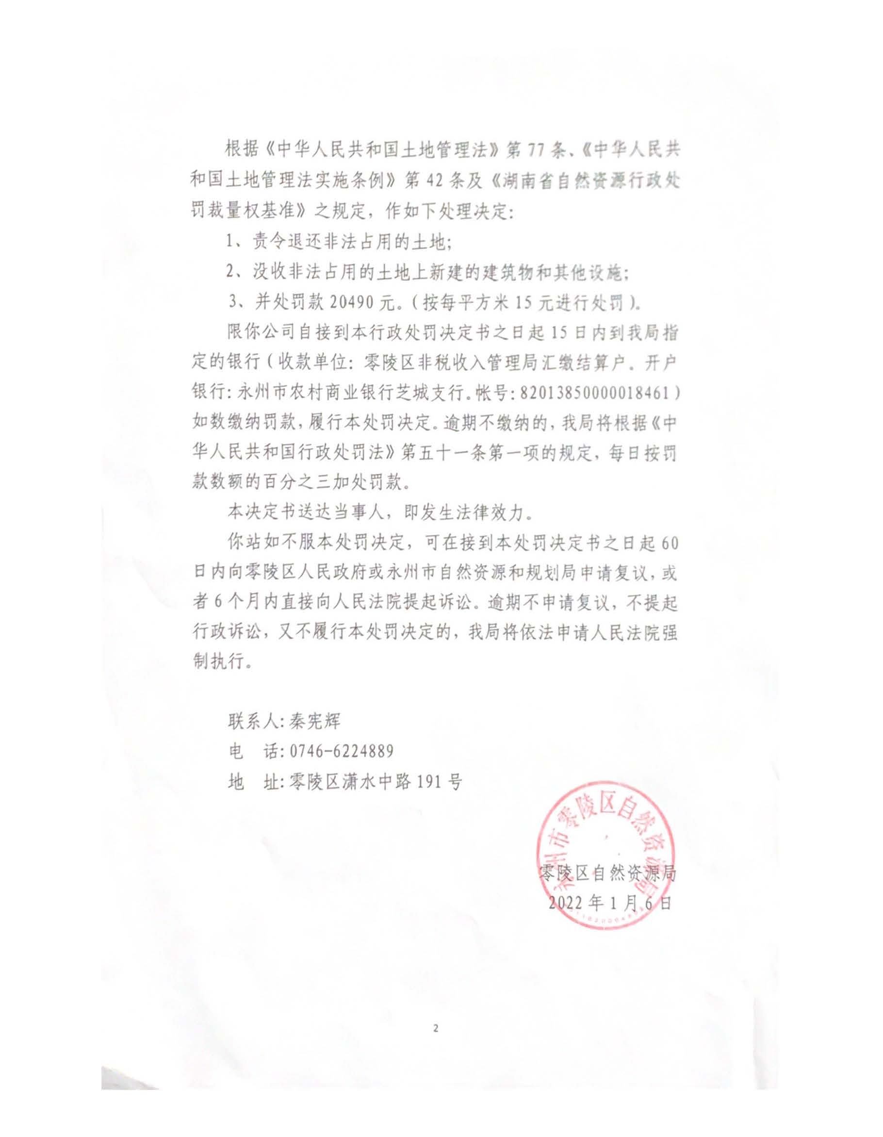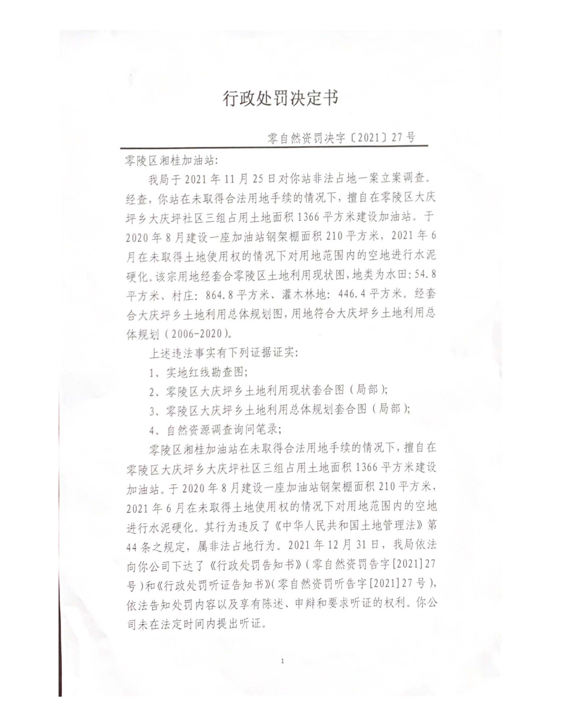 行政处罚决定书(零陵区湘桂加油站)零自然资罚字〔2021〕27号