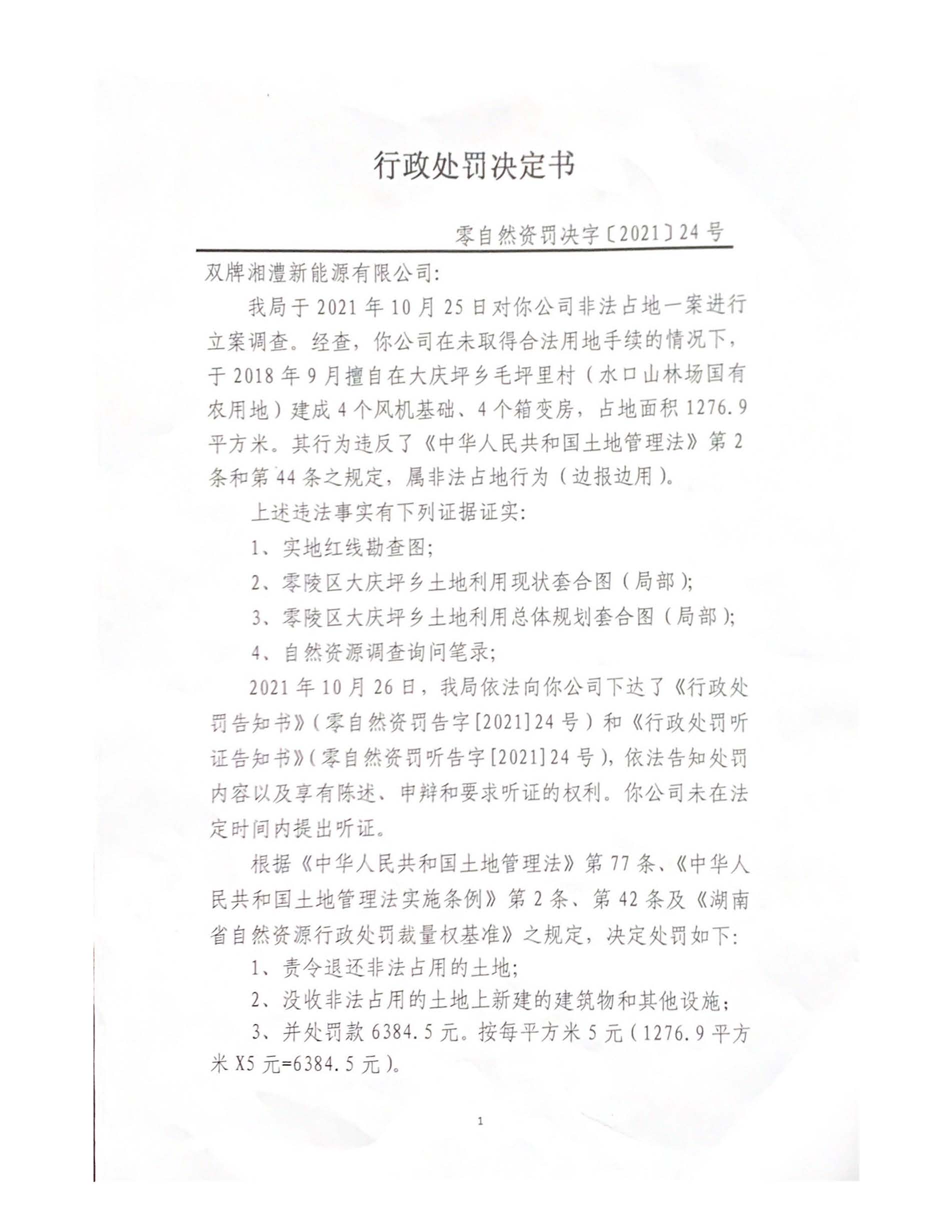 行政处罚决定书(双牌湘澧新能源有限公司)零自然资罚字〔2021〕24号