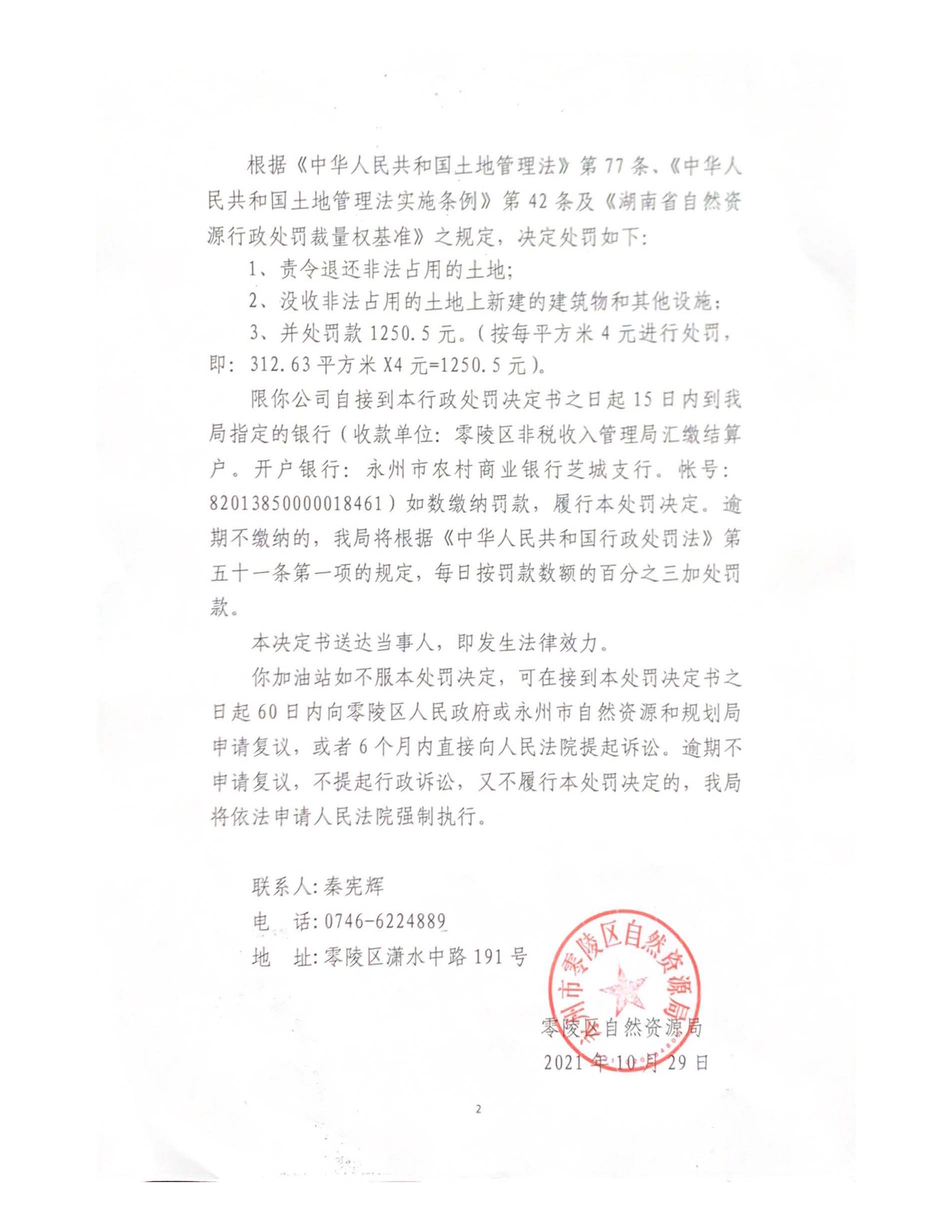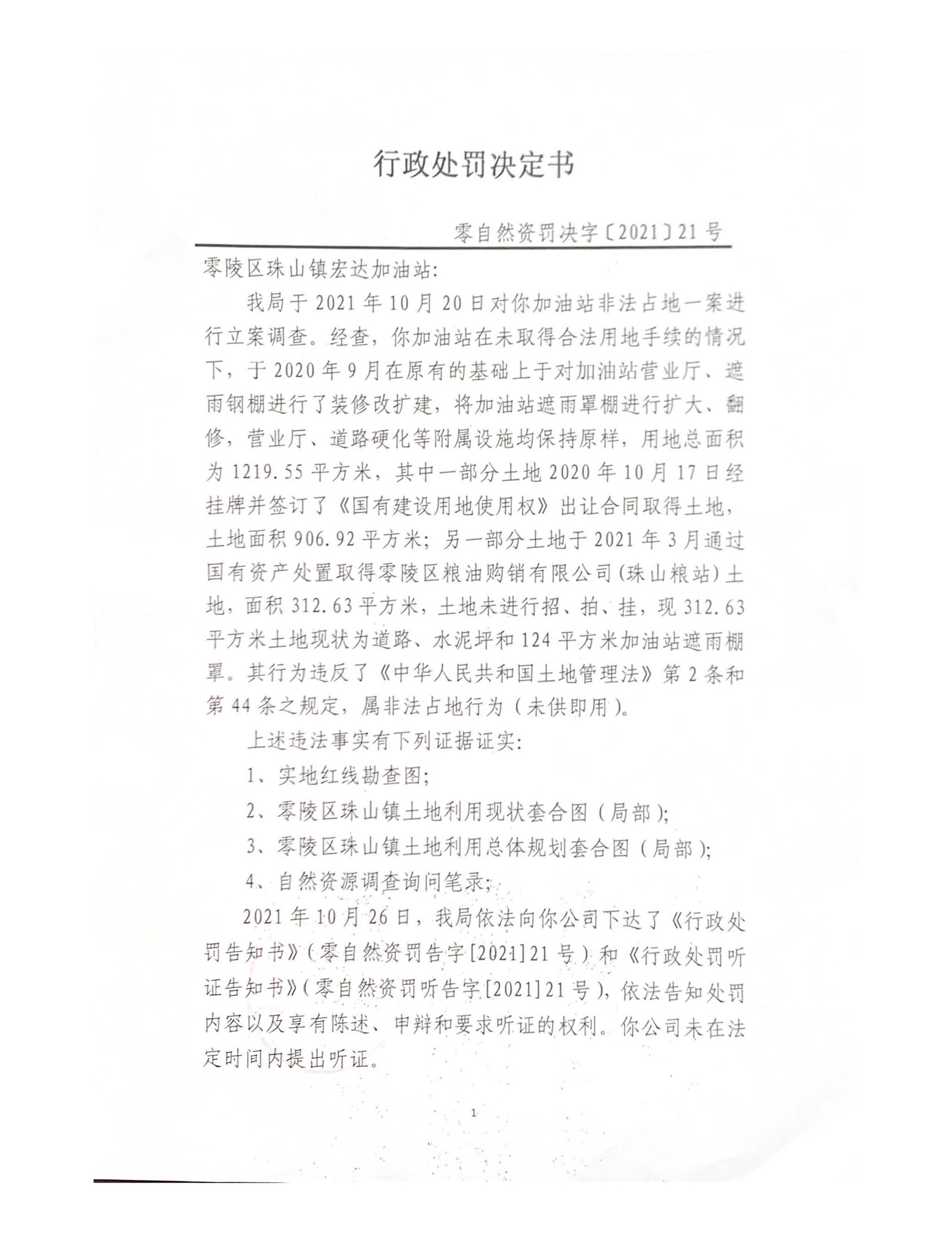 行政处罚决定书(零陵区珠山镇宏达加油站)零自然资罚字〔2021〕21号
