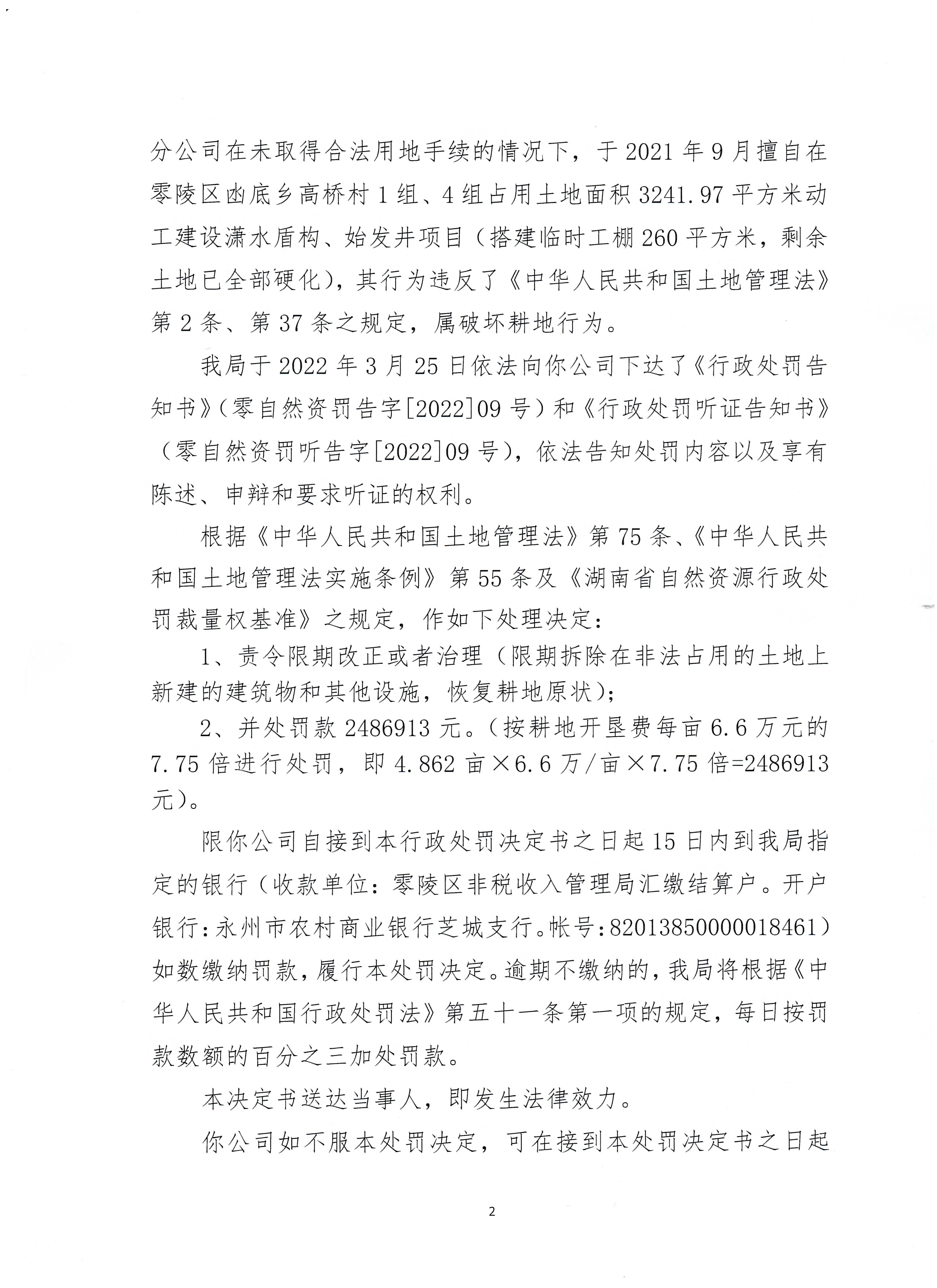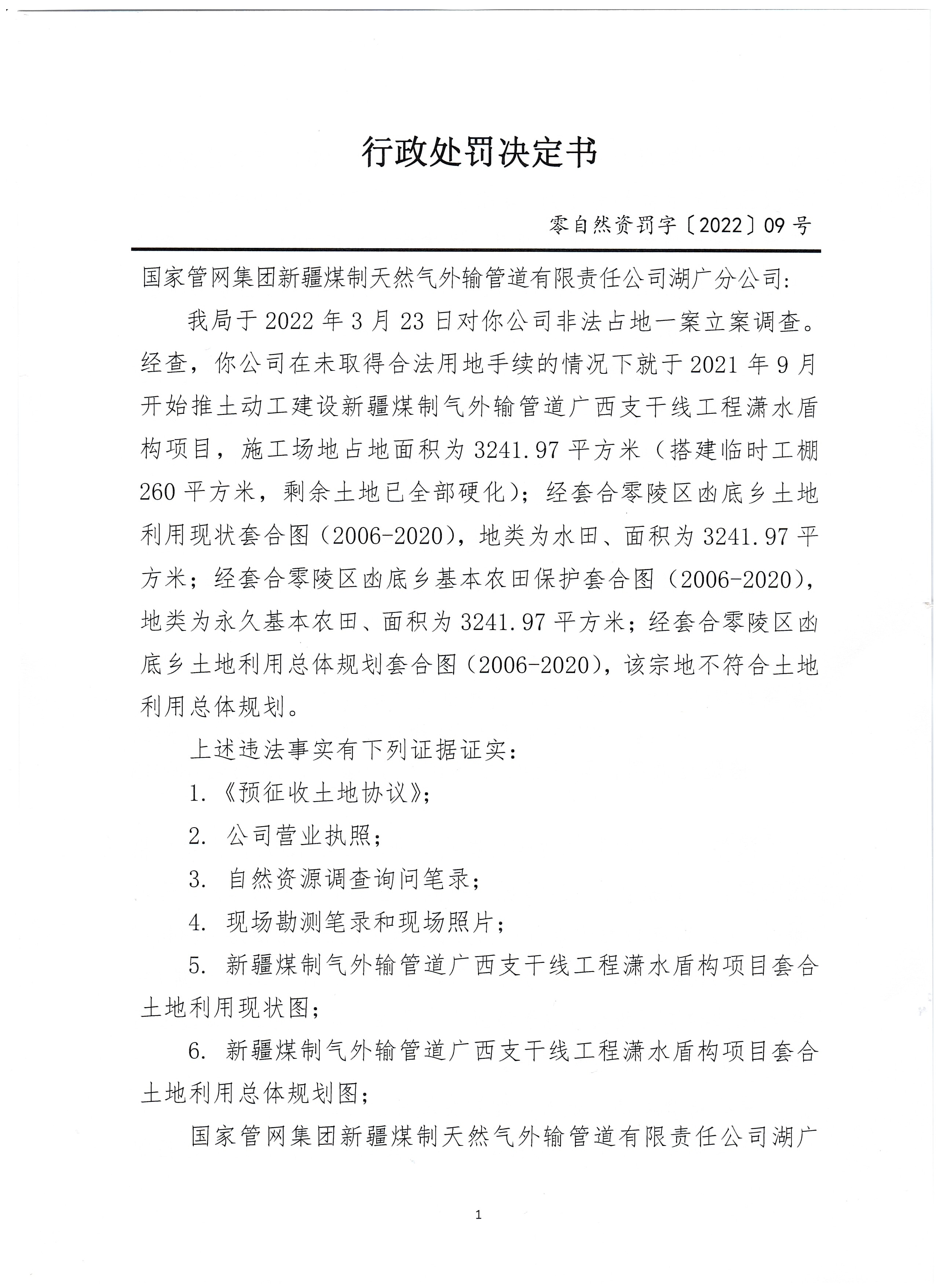 行政处罚决定书(国家管网集团新疆煤制天然气外输管道有限责任公司湖广分公司)零自然资罚字〔2022〕09号