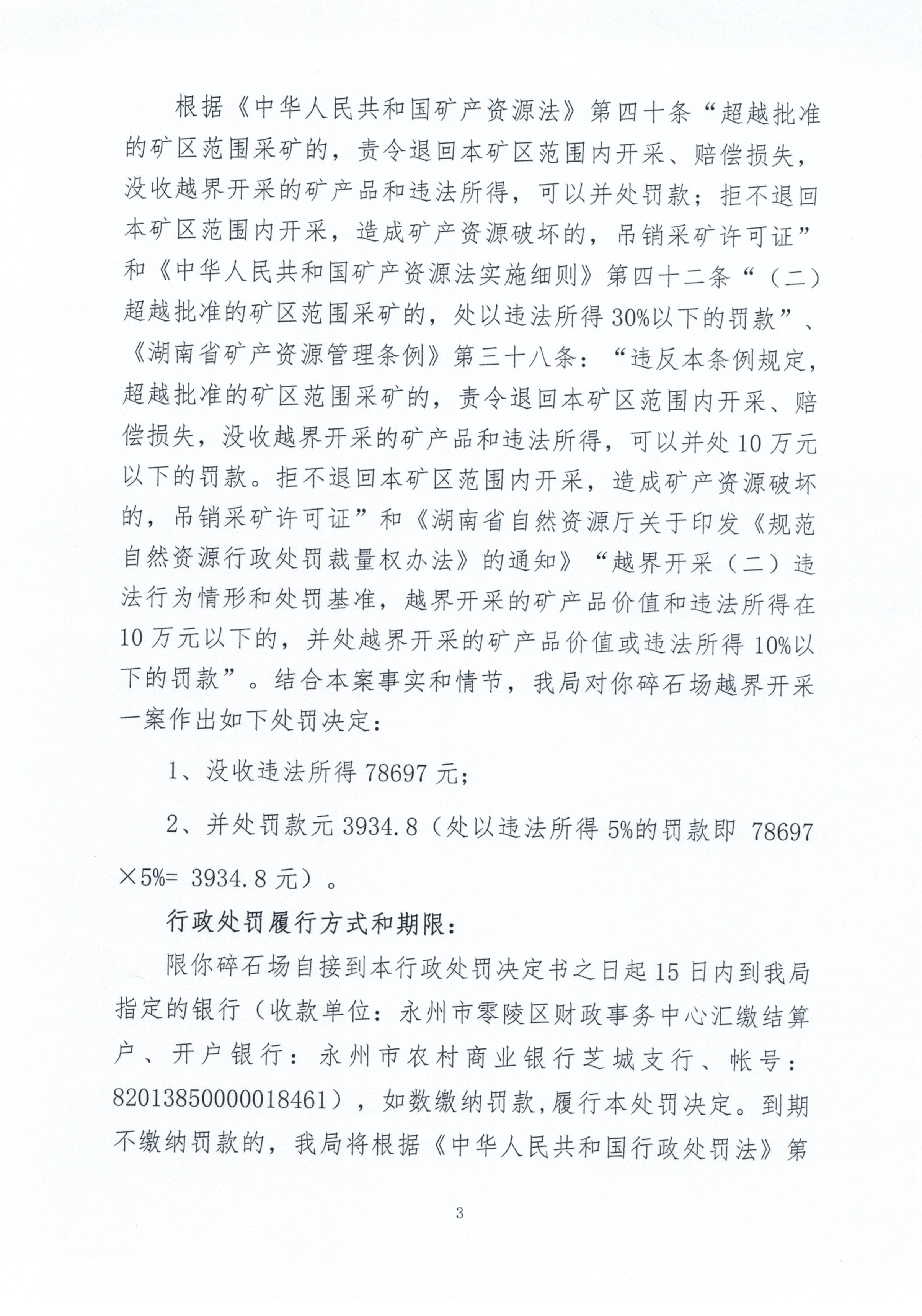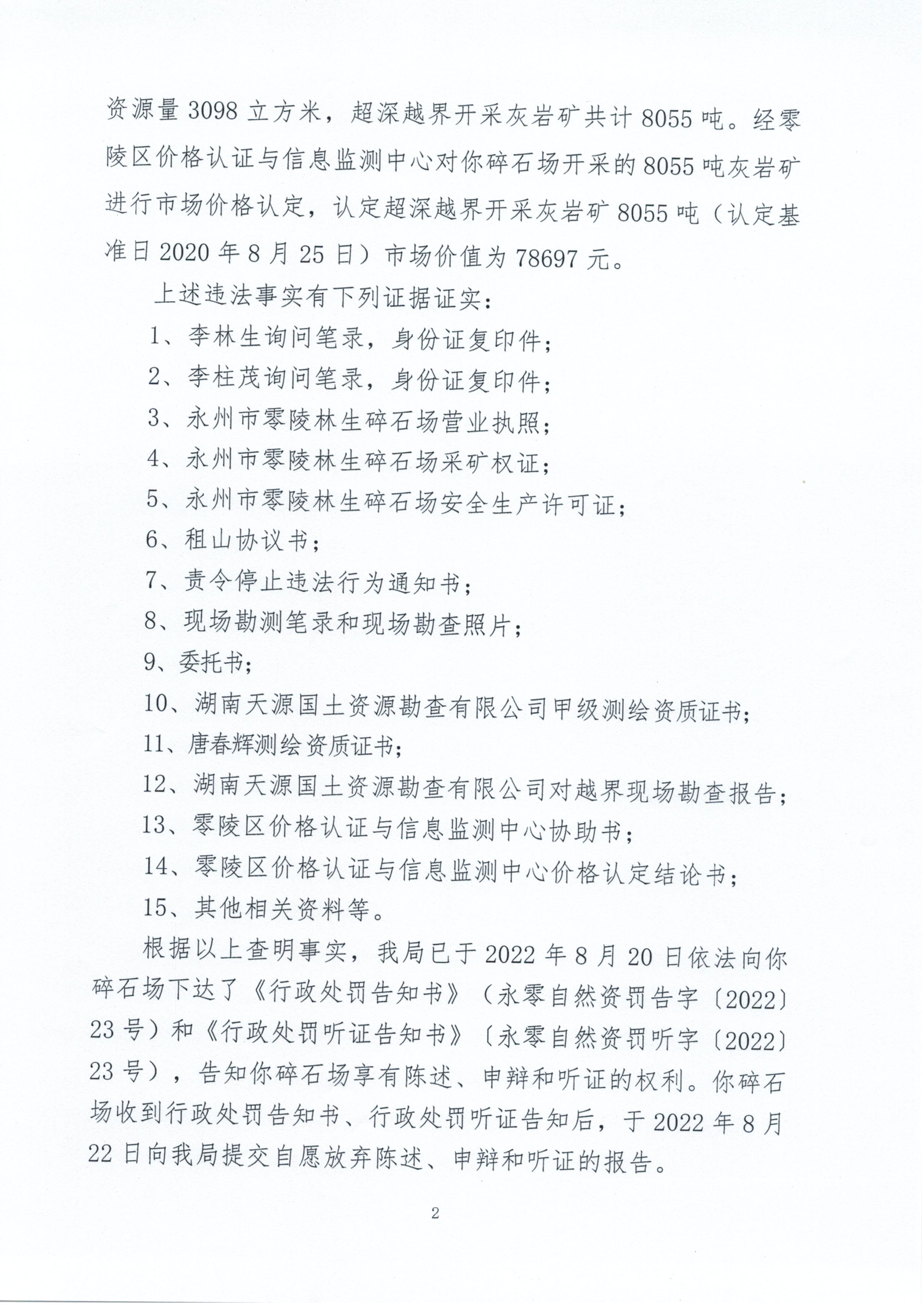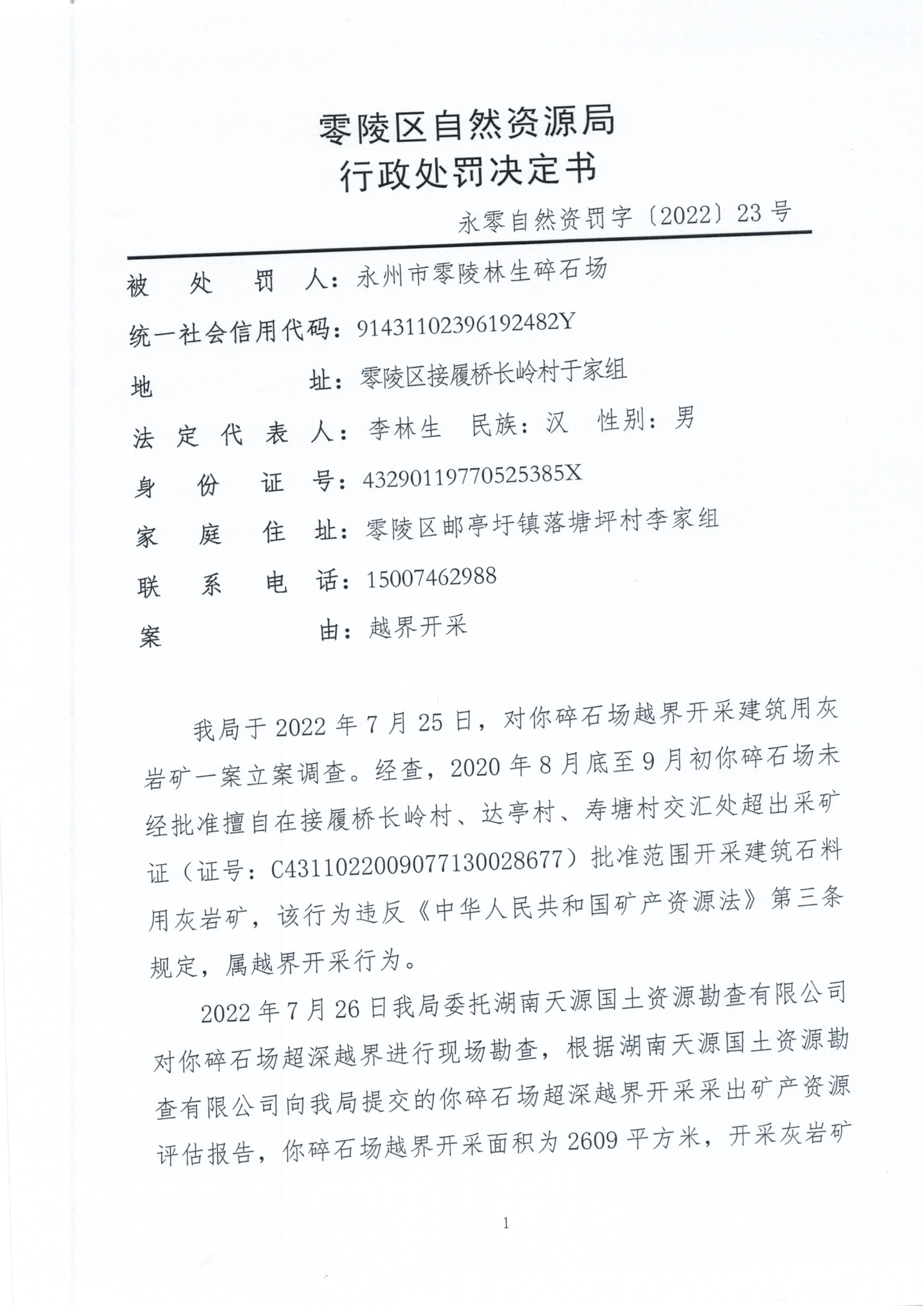 行政处罚决定书(永州市零陵林生碎石场)永零自然资罚字〔2022〕23号