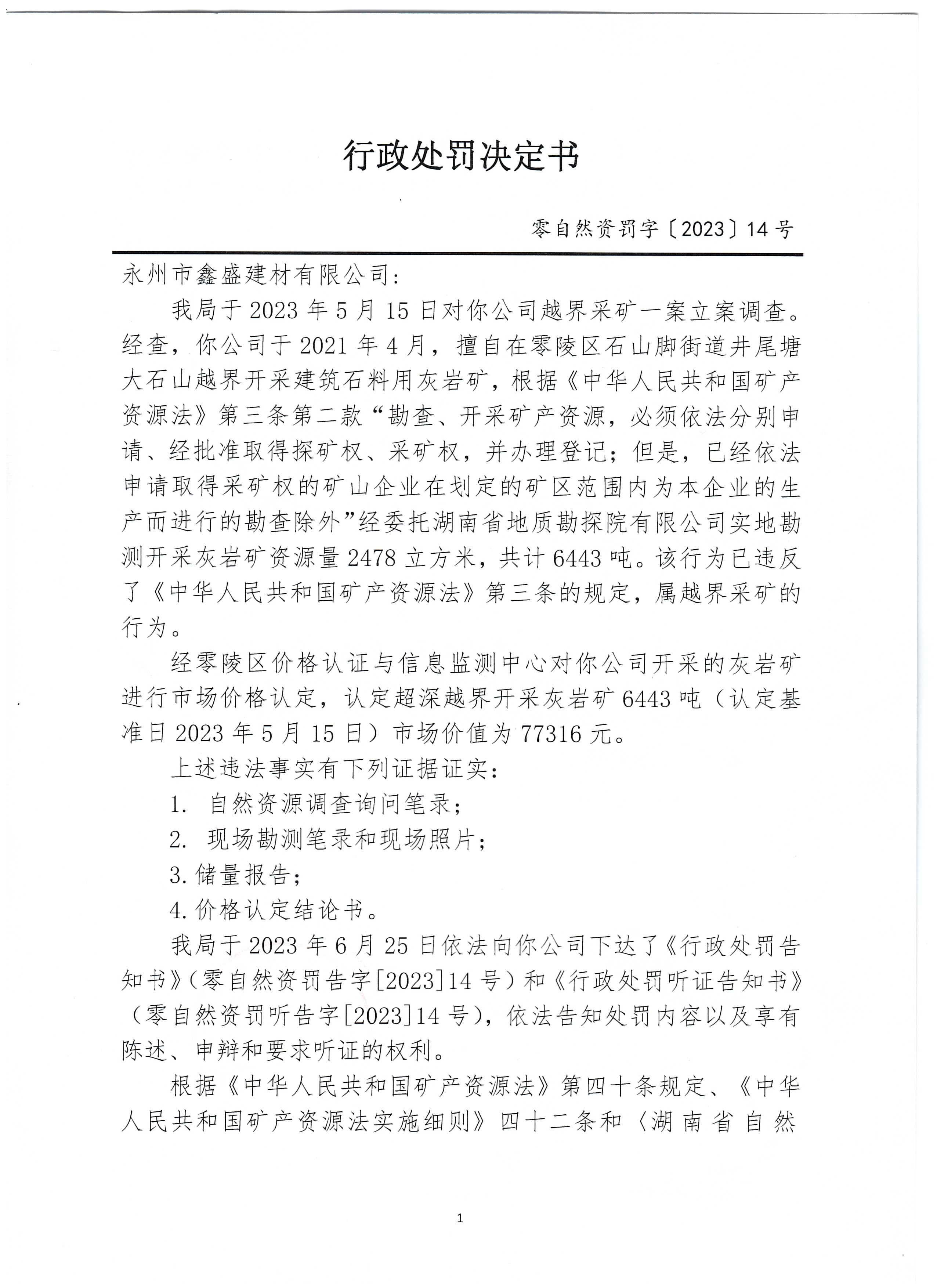 行政处罚决定书(鑫盛建材)零自然资罚字〔2023〕14号