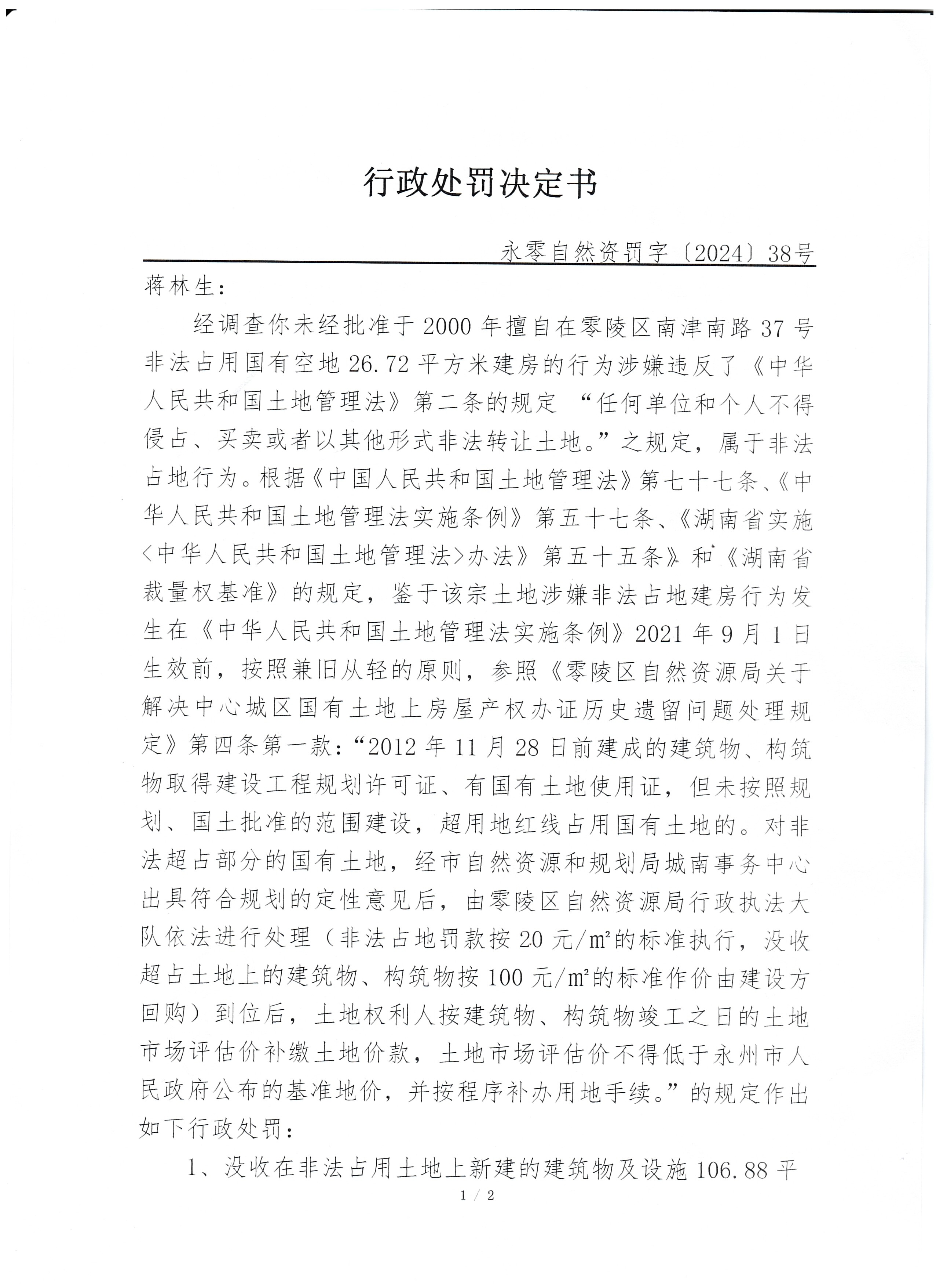 行政处罚决定书(蒋林生)永零自然资罚字〔2024〕38号