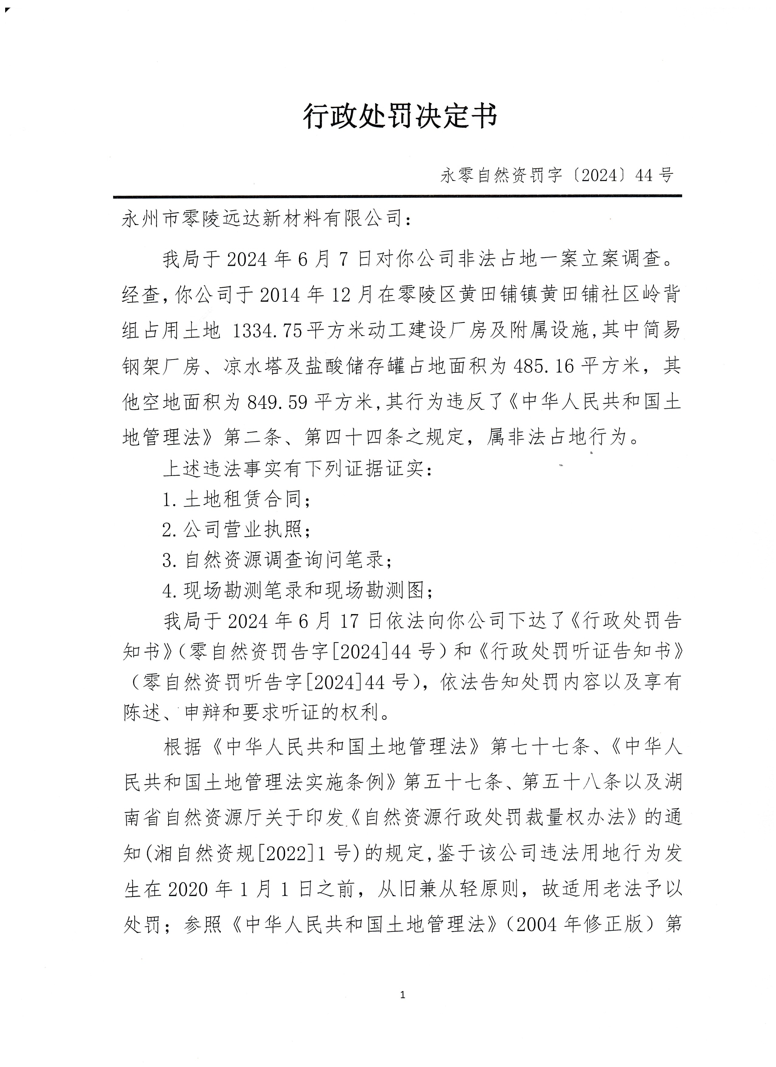 行政处罚决定书(永州市零陵远达新材料有限公司)永零自然资罚字〔2024〕44号