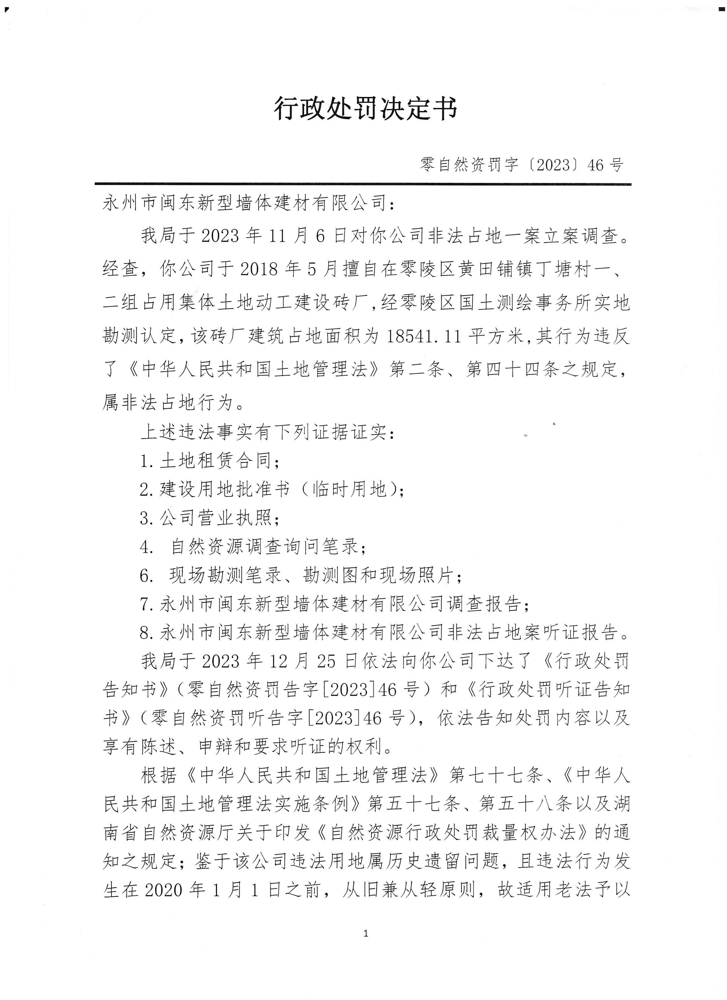 行政处罚决定书(永州市闽东新型墙体建材有限公司)零自然资罚字〔2023〕46号