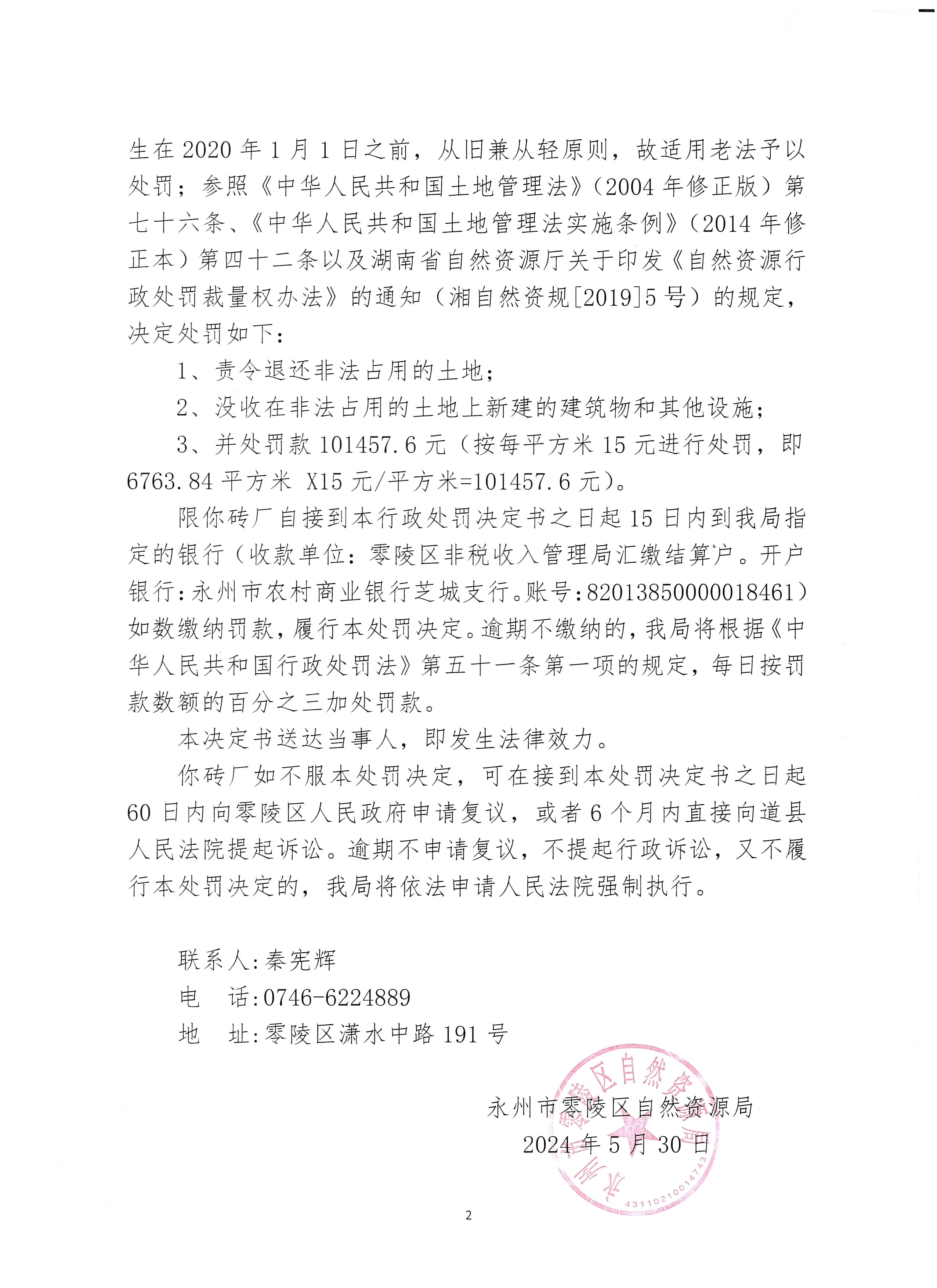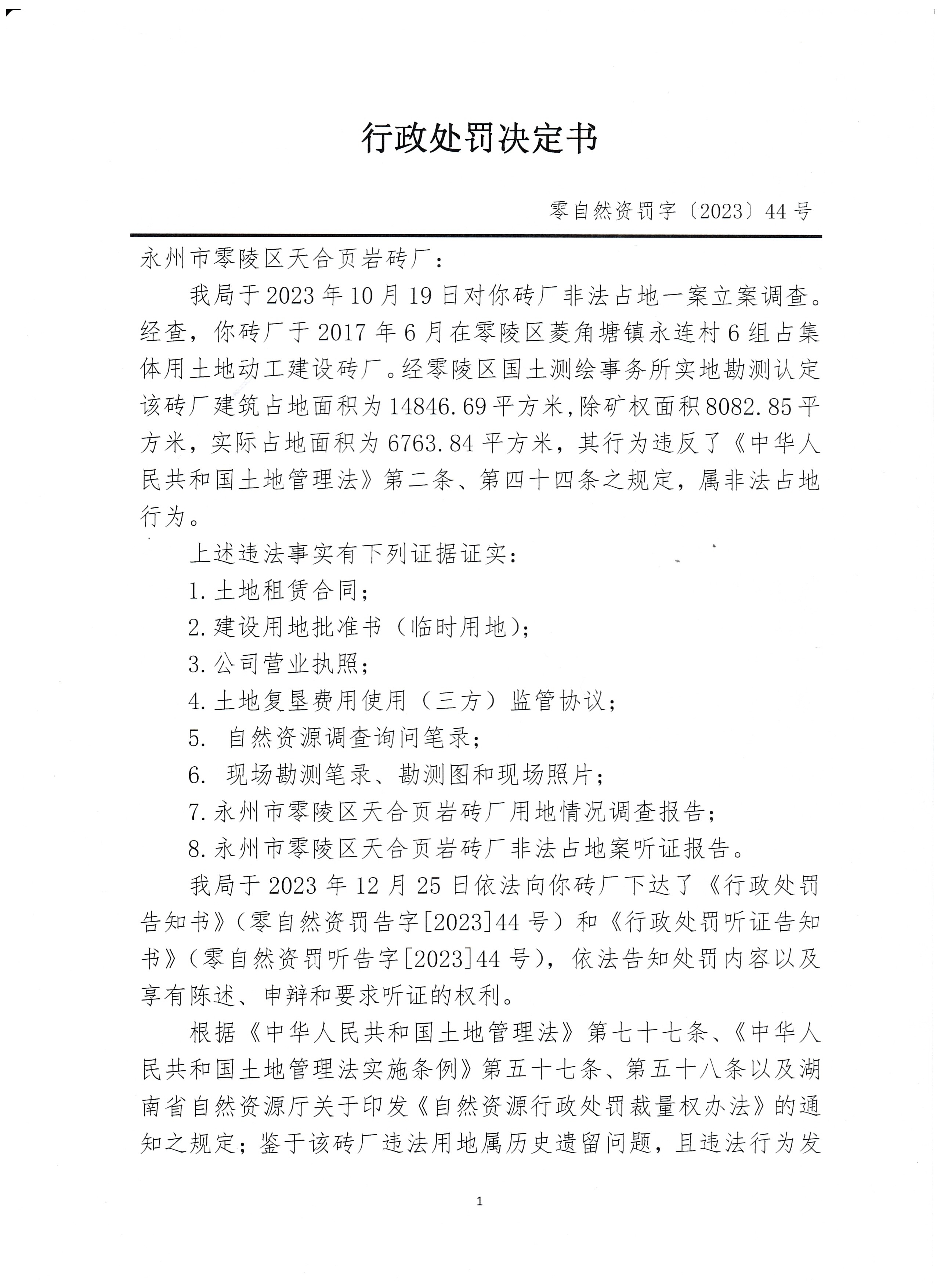 行政处罚决定书(永州市零陵区天合页岩砖厂)零自然资罚字〔2023〕44号