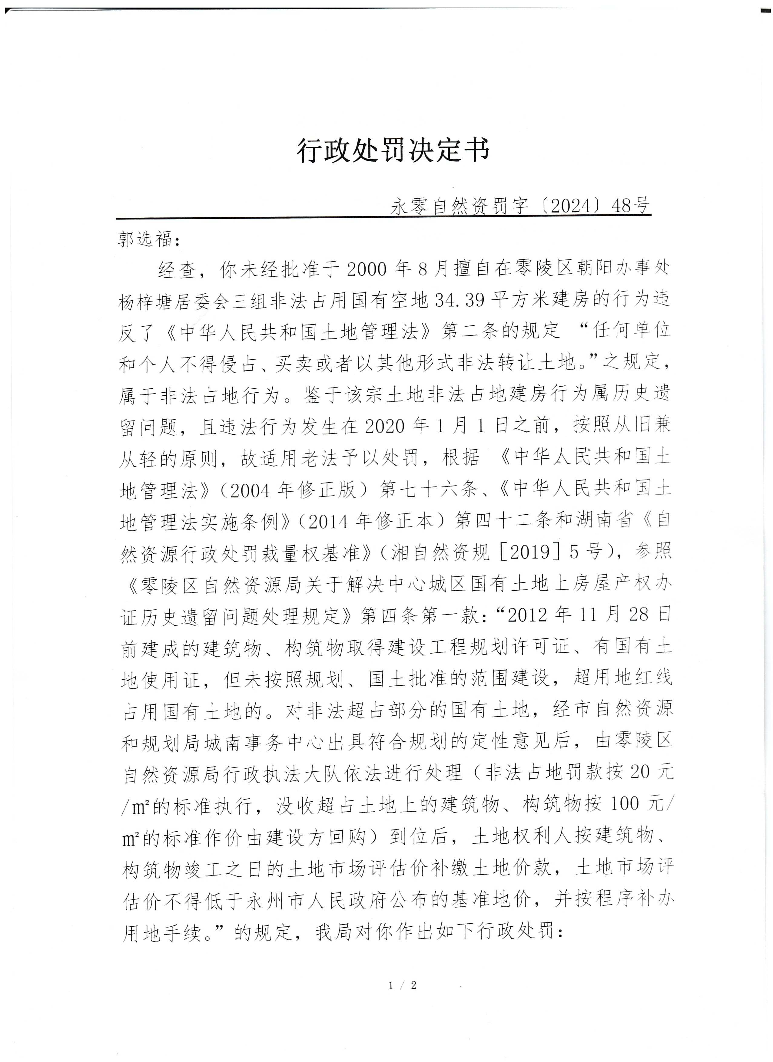 行政处罚决定书(郭选福)永零自然资罚字〔2024〕48号