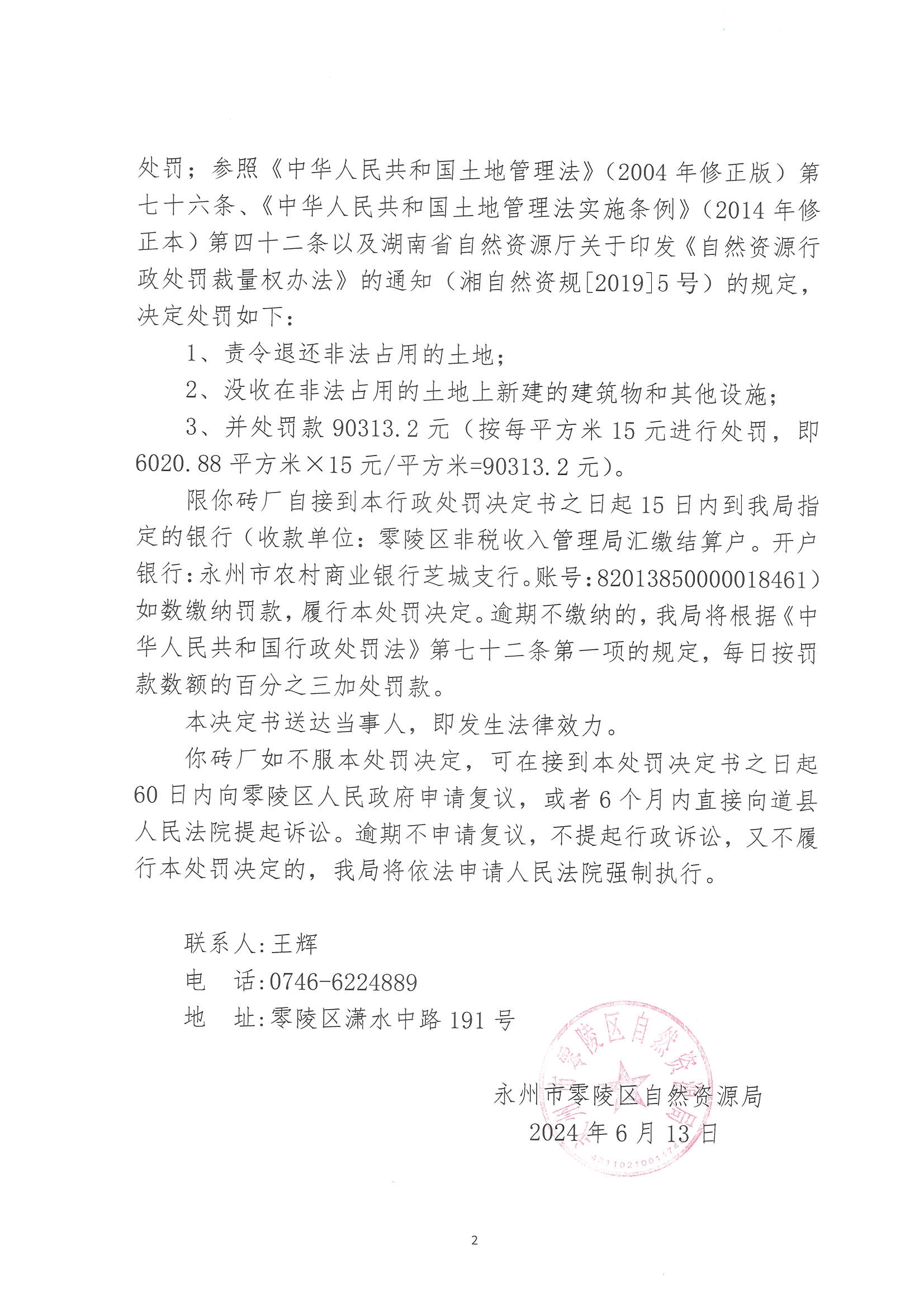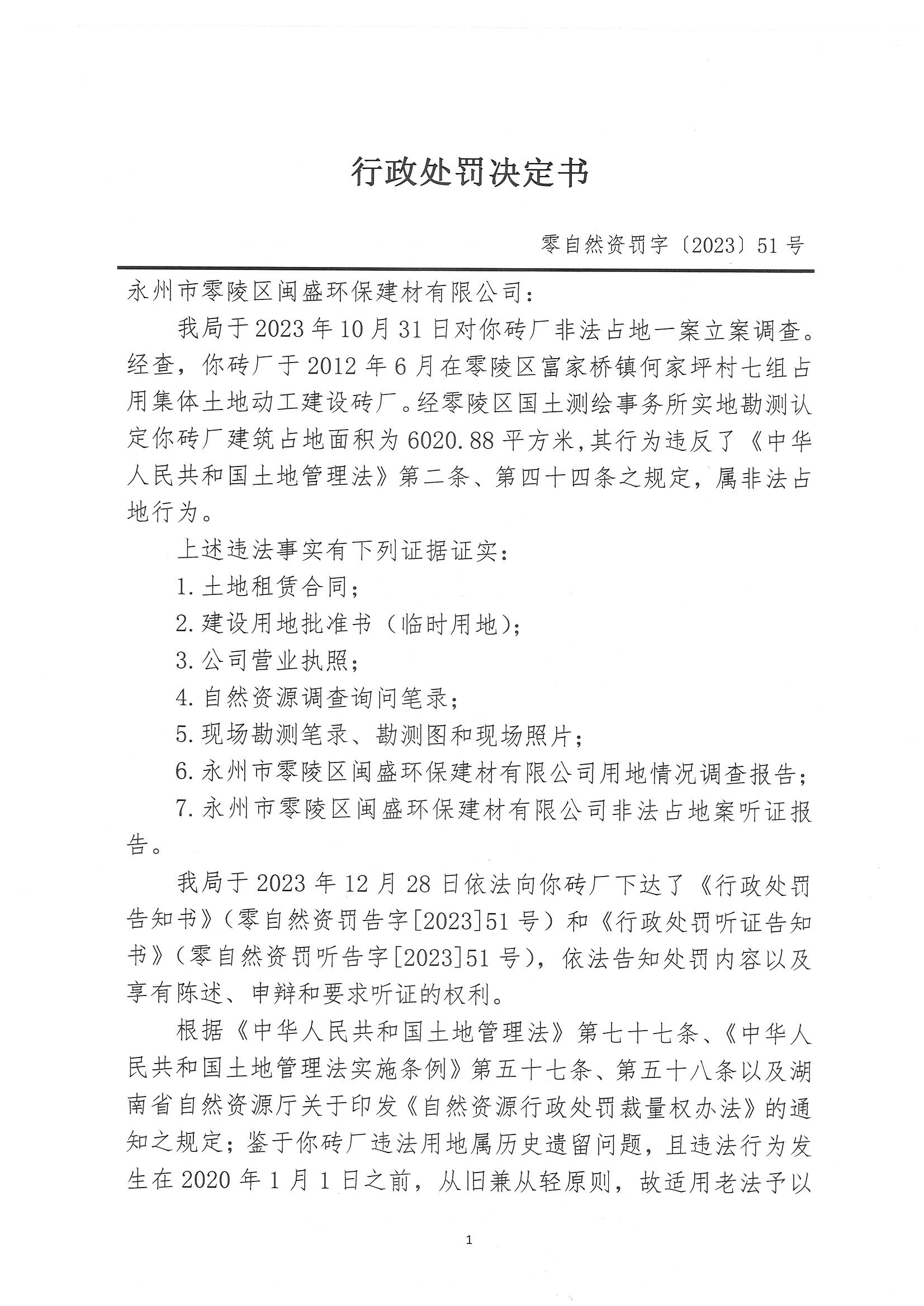 行政处罚决定书(永州市零陵区闽盛环保建材有限公司)零自然资罚字〔2023〕51号