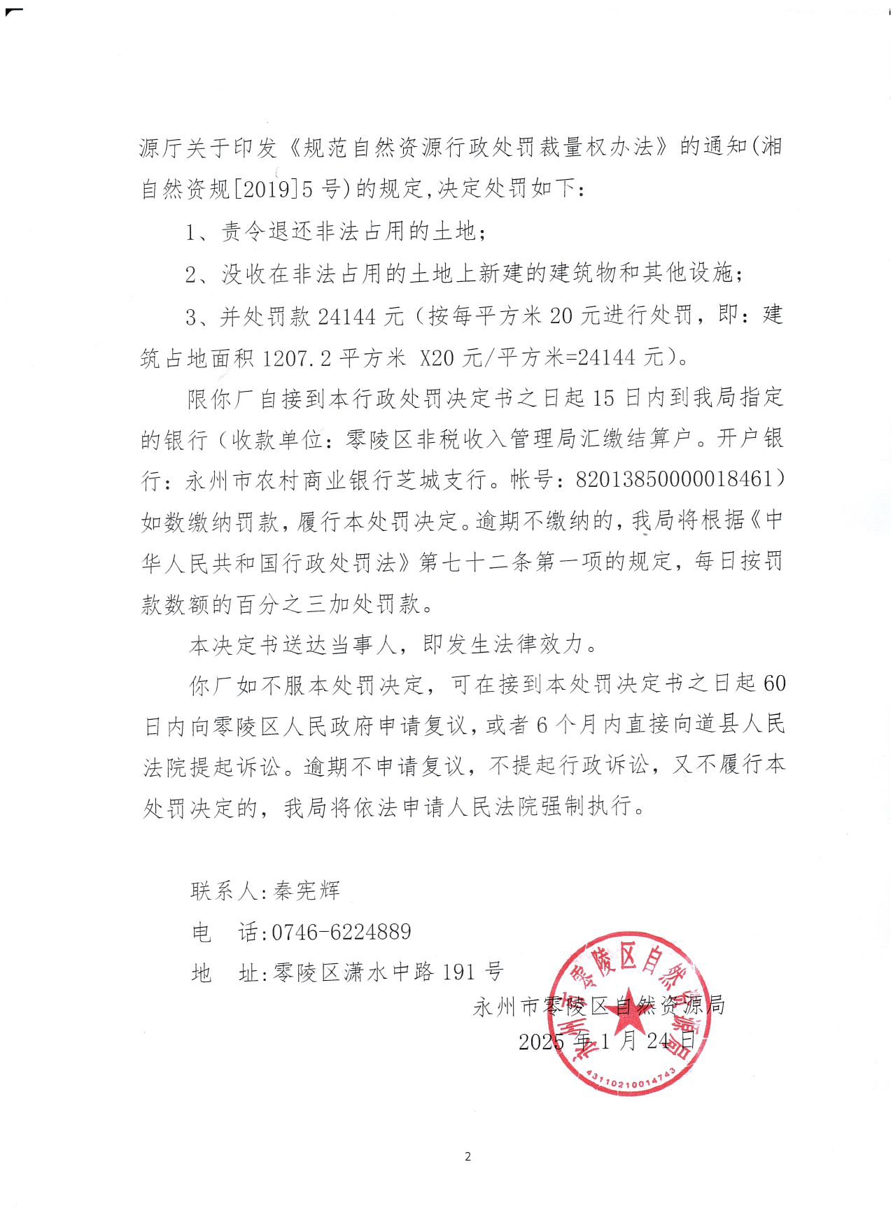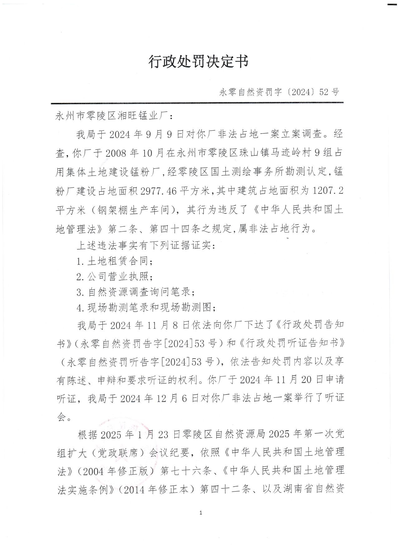 行政处罚决定书(永州市零陵区湘旺锰业厂)永零自然资罚字〔2024〕52号