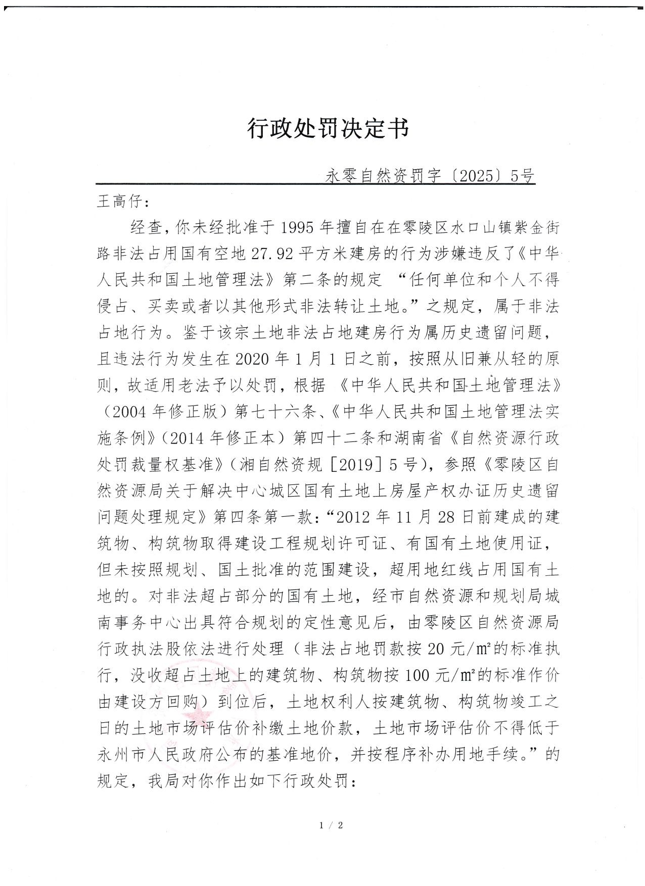 行政处罚决定书(王高仔)永零自然资罚字〔2025〕5号