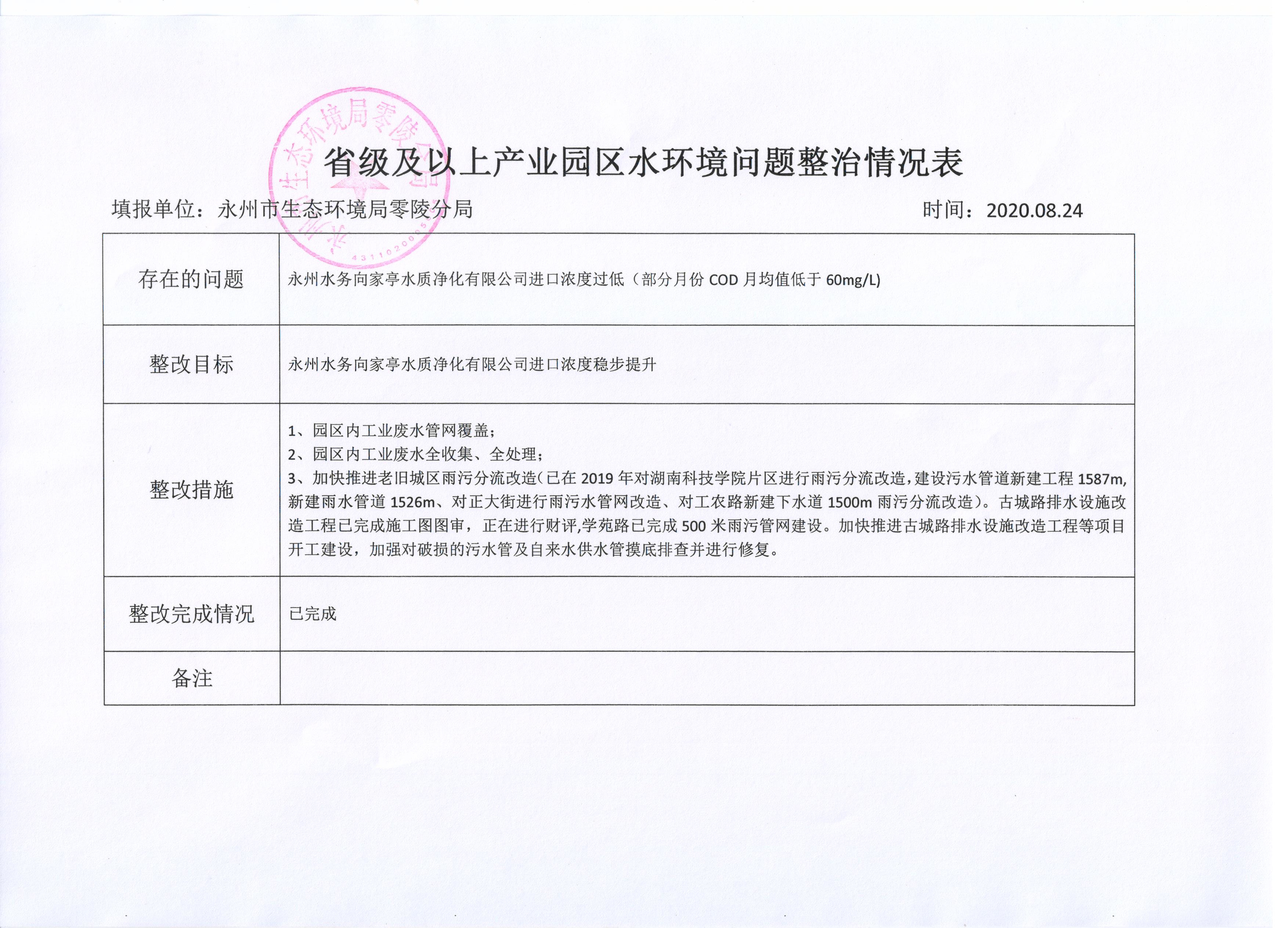 零陵区省级及以上产业园区水环境问题整治情况公示