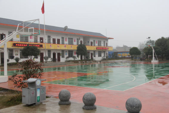 图为竣工验收后的涯次渡完小教学楼与篮球场