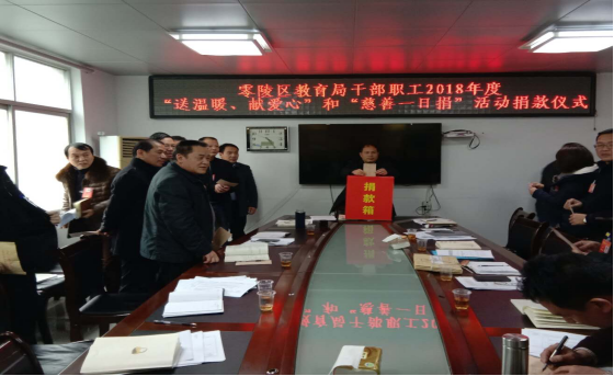 (通讯员 杨赟 胡高胜)1月2日下午,窗外的冰雪还未消融,寒风依旧凛冽,但是零陵区教育局三楼会议室内却是一片温馨的场面,一场由区教育局党委书记、局长唐天光带头进行“送温暖、献爱心”和“慈善一日捐”活动正在进行,拉开了全区教育系统为留守儿童、困难教师献爱心的活动序幕,全区教育系统教职工踊跃捐款、奉献爱心。