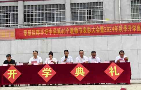 (通讯员 陈连连)“百年大计,教育为本;教育大计,教师为本”。为树立先进教师典型,弘扬爱岗敬业精神,引导广大教师向身边的榜样学习, 9月12日上午,零陵区邮亭圩中学全体师生齐聚操场,隆重举行以“赓续百年初心,担当育人使命”为主题的第40个教师节庆祝大会暨2024年秋季开学典礼。庆祝大会在雄壮的国歌声中拉开帷幕。