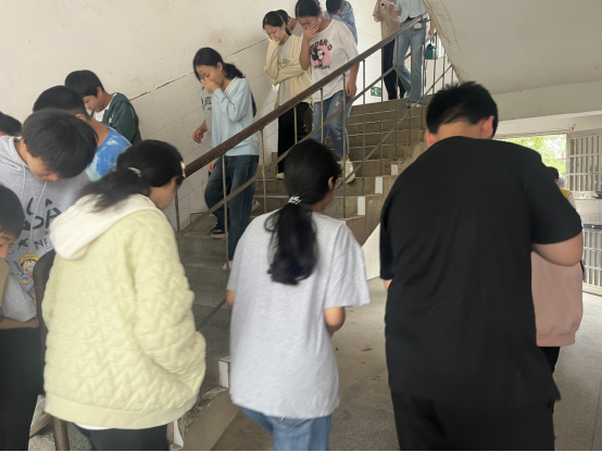 随着警报声响起,老师们立即到达指定岗位,引导学生快速疏散;同学们用湿巾捂住口鼻、弯腰低姿,沿预设疏散路线迅速、有序撤离到学校操场。到达安全位置后,各班主任立即清点人数,并向总指挥报告,确保全员安全撤离。
