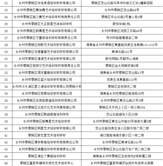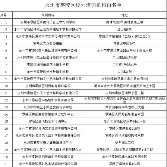 有些校外培训机构未取得主管部门颁发的办学许可证,或以个人名义开展“一对一”“住家教师”“高端家政”等违规培训,这类培训无资格资质、无质量保证、无安全保障。为方便家长查询,教育部开通了全国校外教育培训监管与服务综合平台,家长可通过“校外培训家长端”APP,选择具备资格资质的校外培训机构。家长也可以关注区教育局动态发布的校外培训机构白名单,在白名单中的校外培训机构才是具有办学资质的正规培训机构。零陵区最新校外培训机构白名单附后。
