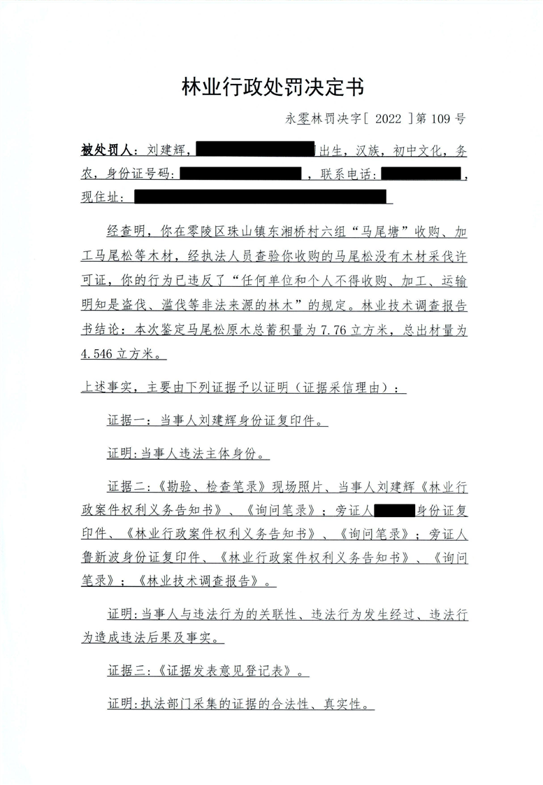永零林罚决字[2022]第109号 刘建辉非法收购林木案