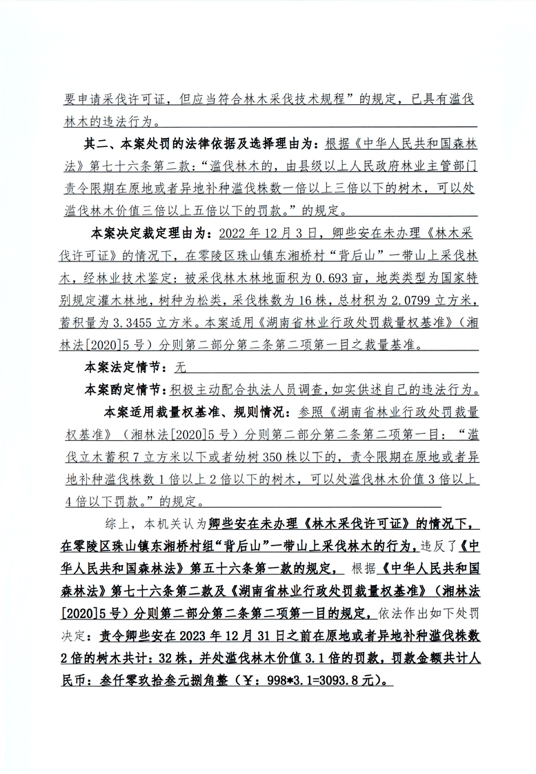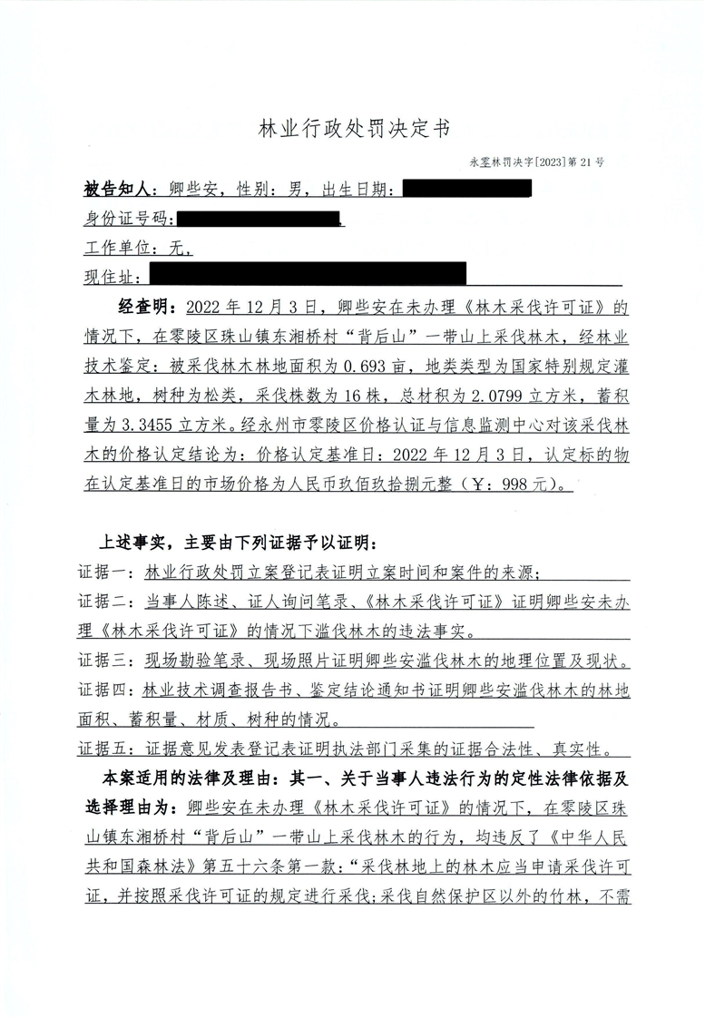 永零林罚决字[2023]第021号 卿些安滥伐林木案
