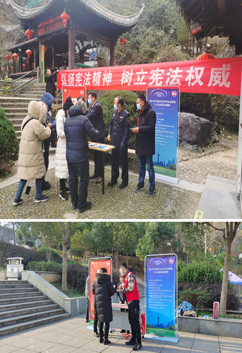 “交通安全进景区”活动现场主要通过设置法律咨询台、宪法宣传展板、发放宪法、民法典等宣传单页、文明旅游、安全旅游、自助旅游知识手册、景区户外LED显示屏滚动播放普法宣传标语等方式开展宣传活动;现场咨询台工作人员主动为游客提供旅游方面的法律咨询,引导游客养成尊法、学法、守法、用法的好习惯;安排人员与景区工作人员组成志愿者队伍指引游客完成景区预约,主动配合扫码测温,规范佩戴口罩,进一步宣传疫情防控等法律法规。