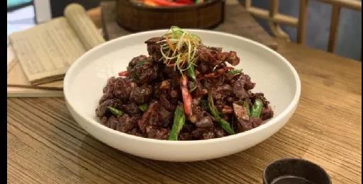 烤肉是中国久负盛名的特色菜肴,《明宫史·饮食好尚》中就有凡遇雪,则暖室赏梅,吃炙羊肉的记载。“柒酒烤肉”始终坚持健康、美味、标准化的出品,里面的菜品种类繁多,特别要推荐的就是会跳舞的虾,水嫩Q弹,紧实丰腴,色泽诱人,味鲜十足。放烤盘烤炙虾无透明状呈红色需换烤纸,要特别注意的是同类型口味一起烤炙,避免串味。其次要推荐的是黑椒牛仔骨,口感脆滑,虾味十足,超级Q弹,把虾滑汤汁放到烤盘中间煮沸,再用小勺子下入虾滑至浮出状态即可。