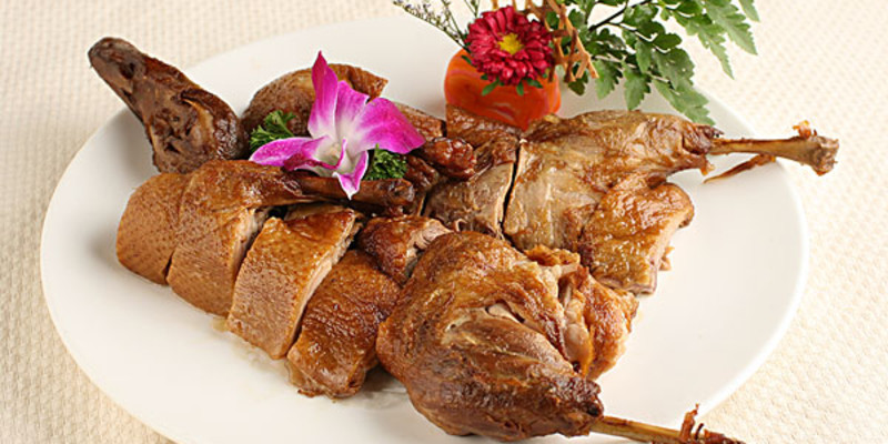 1、将净鸭用绍酒、精盐、白糖、花椒和拍破的葱姜腌约2小时,上笼蒸至八成烂,取出晾凉,先切下头、翅、掌,再将鸭身剔净骨,从腿、脯肉厚的部位剔下肉切成丝。火腿切成末。肥膘肉切成细丝。鸡蛋在碗内,放入面粉、干淀粉10克、清水50克,调制成糊。香菜摘洗干净。