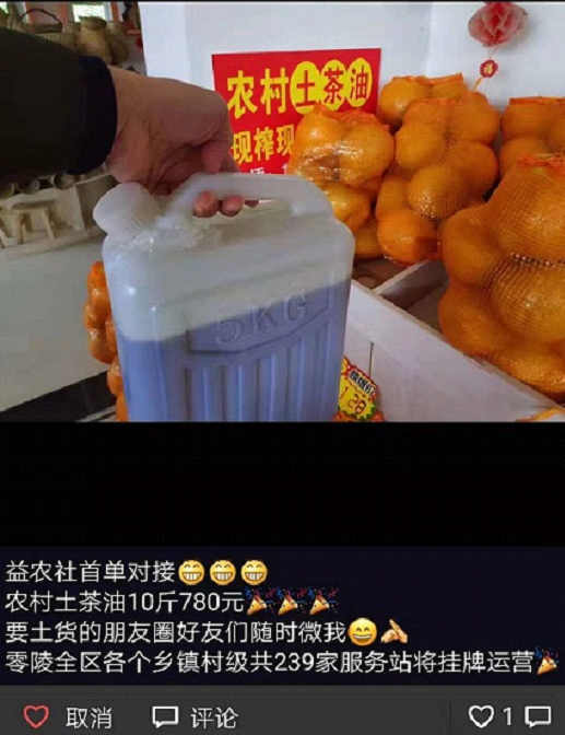 (通讯员:龙翠云 唐辉龙)11月26日零陵区益农信息社县级运营中心正式揭牌,运营第二天接到了首单,运营中心通过搭建平台与线下实体农产品展示、通过电脑终端现场电子屏展示,顾客扫码现场买了10斤正宗农村土茶油,茶油由黄田铺益农信息社提供,成功交易收款780元。