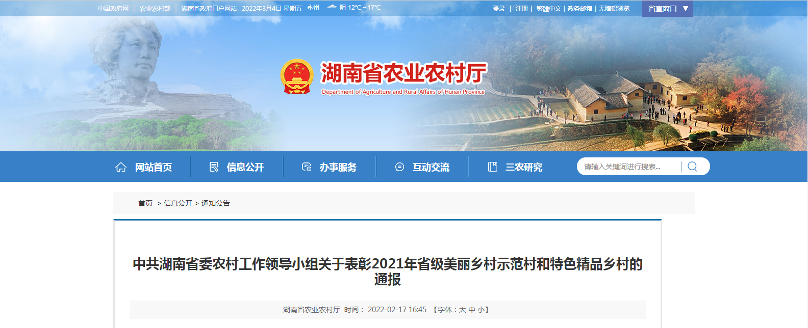日前,中共湖南省委农村工作领导小组公布了2021年“省级美丽乡村示范村”和“特色精品乡村”名单,零陵区朝阳街道石烟塘村、黄田铺镇邓家冲村、接履桥街道马坝村获评“省级美丽乡村示范村”称号,富家桥镇高贤村获评“省级特色精品乡村”称号。