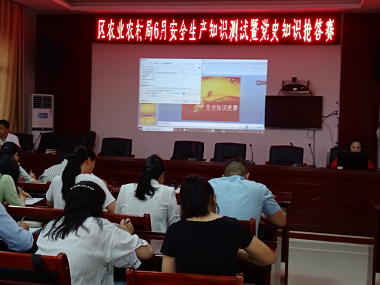 6月14日上午,零陵区农业农村局组织围绕“党建+安全生产”开展6月份主题党日活动。为强化学习效果,在每月开展“学习强国”积分比拼赛的同时,举办了一场生动而精彩的“安全生产知识测试暨党史知识抢答赛”,全局股室间组合产生8支参赛队进行比赛。